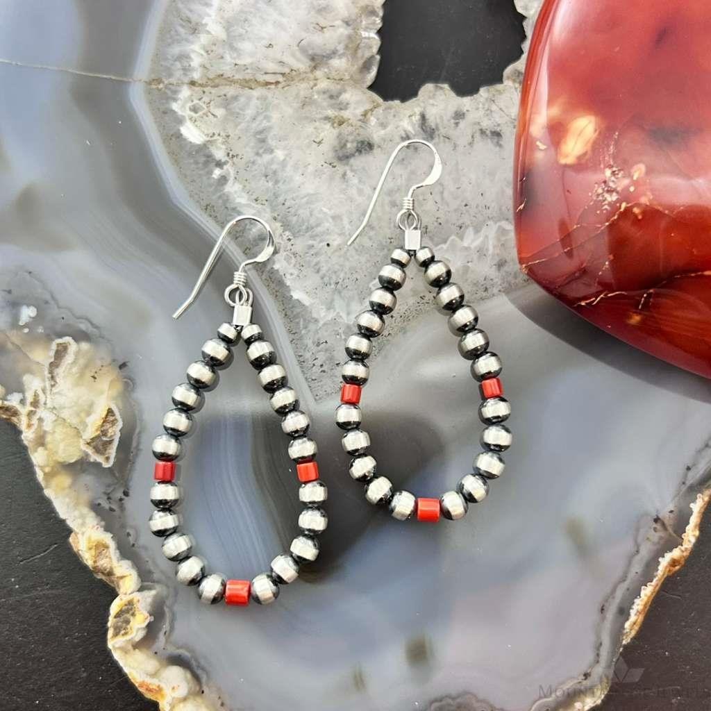 Navajo Pearl Beads 4mm and Coral Sterling Silver Hoop Dangle Earrings For Women