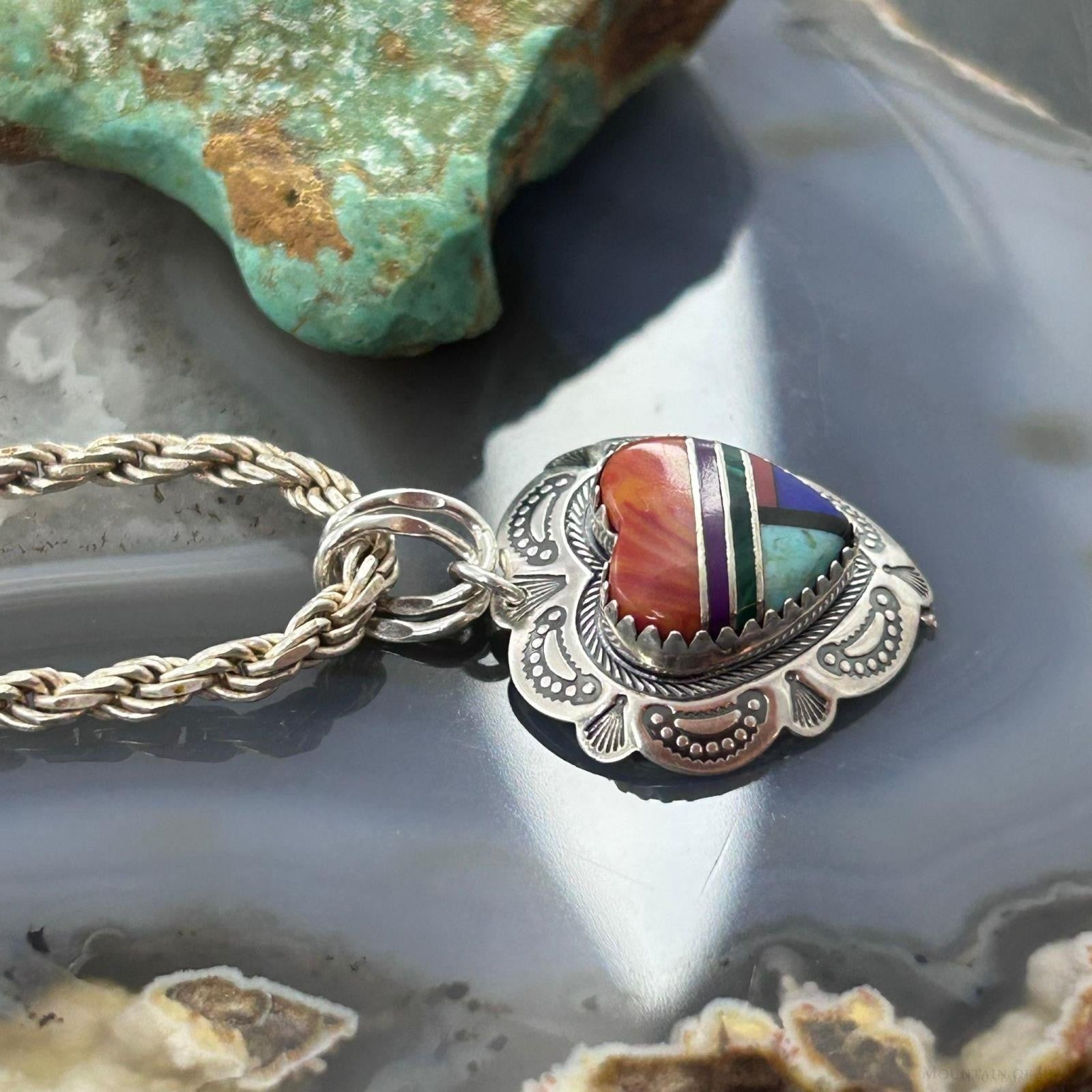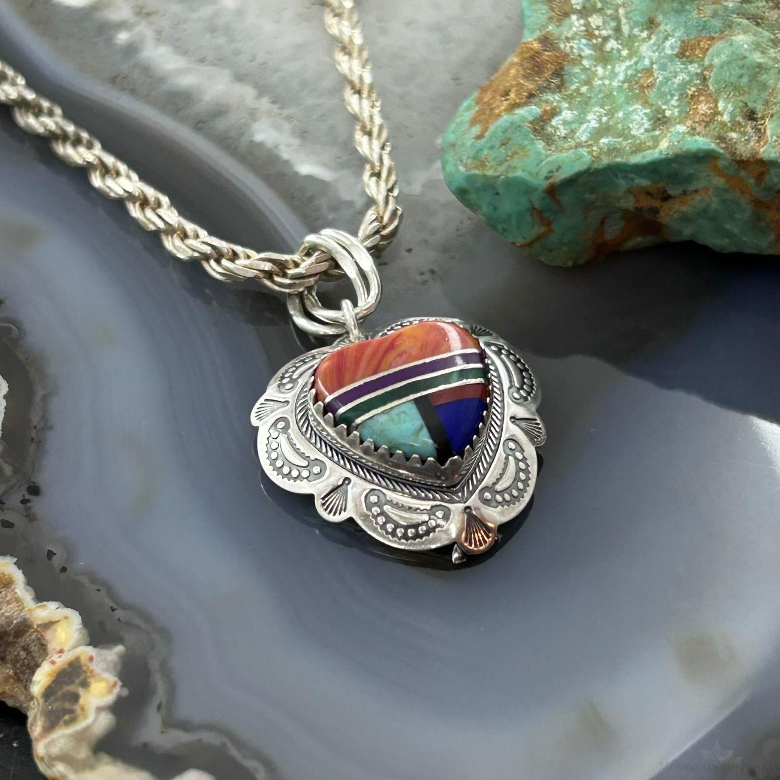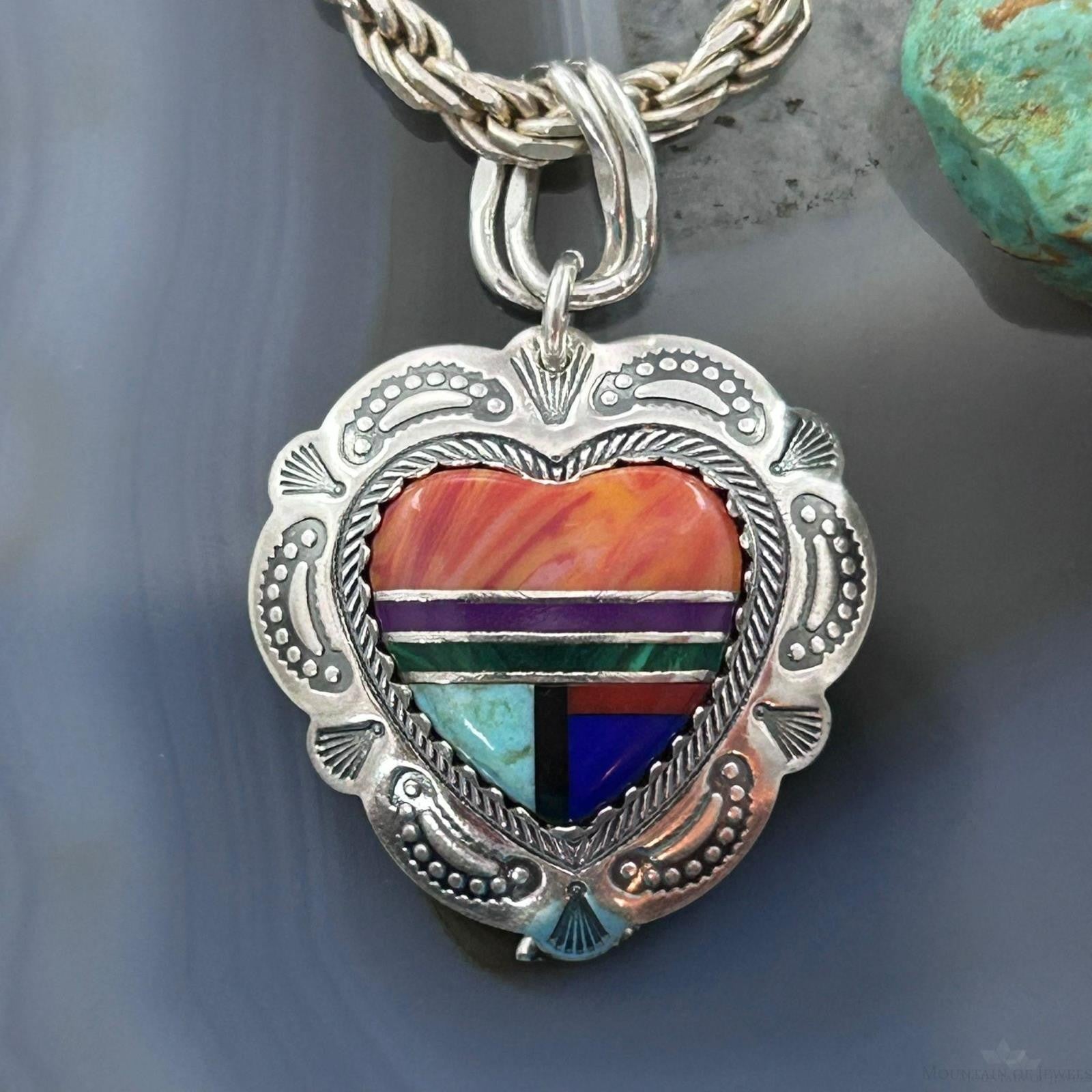 QT Quoc Sterling Silver Southwestern Style Multistone Inlay Heart Pendant For Women