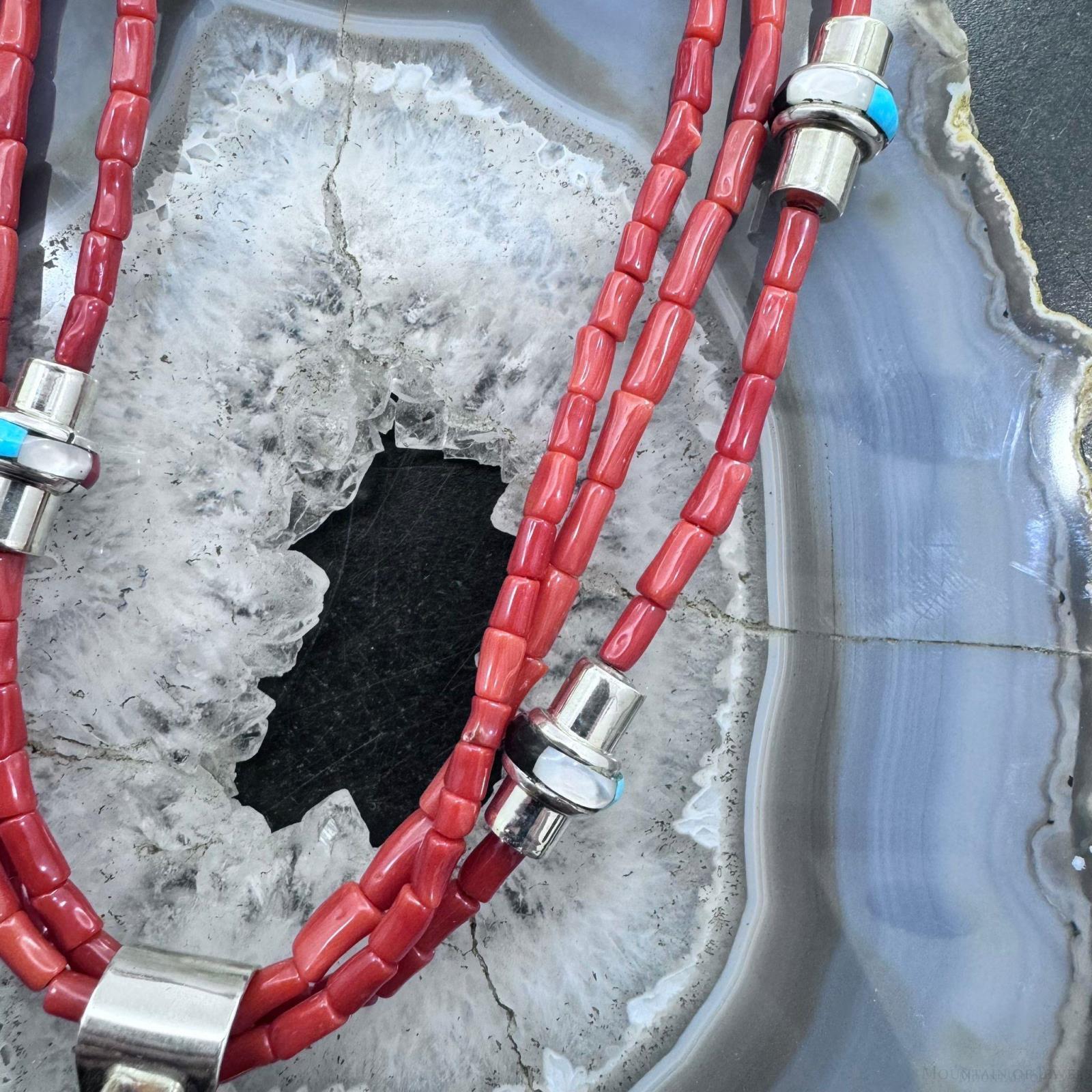 Each Elongated Sterling Silver Barrel Bead is Decorated With Coral, Turquoise Lapis and Mother of Pearl Inlay. The Extraordinary Pendant has a Bail Decorated With a Beautiful Turquoise Stone Set in a Striking, Deep, Smooth Bezel.