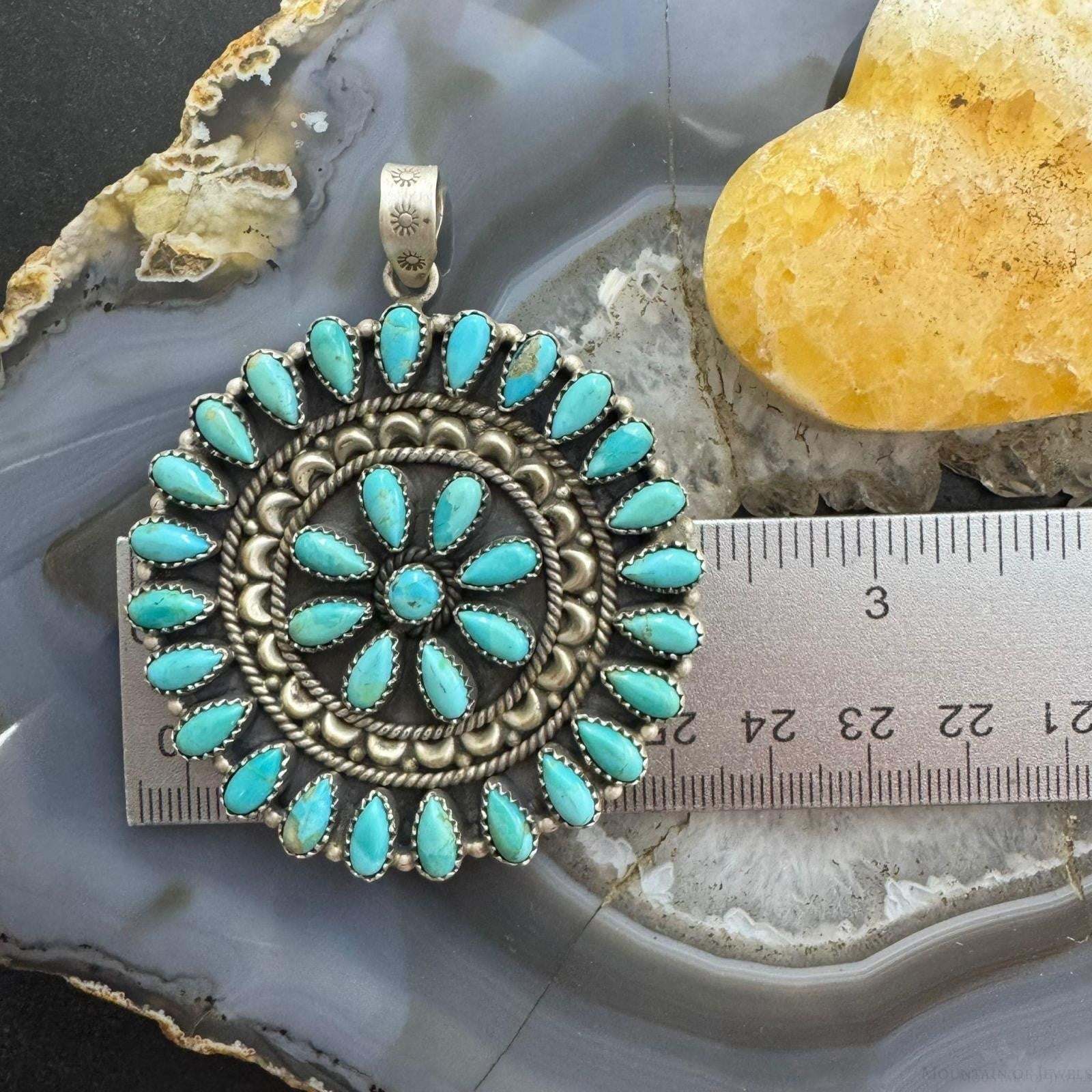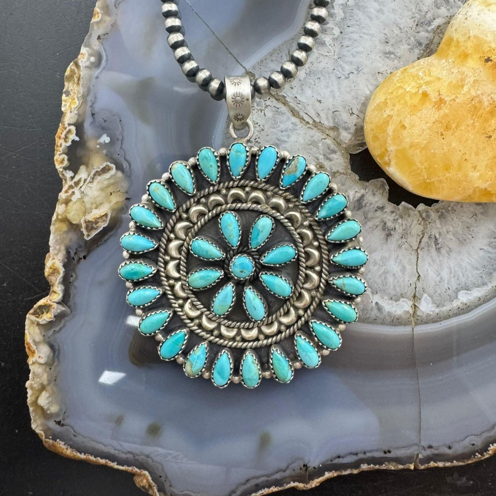 Southwestern Style Sterling Silver Turquoise Decorated Round Cluster Pendant For Women