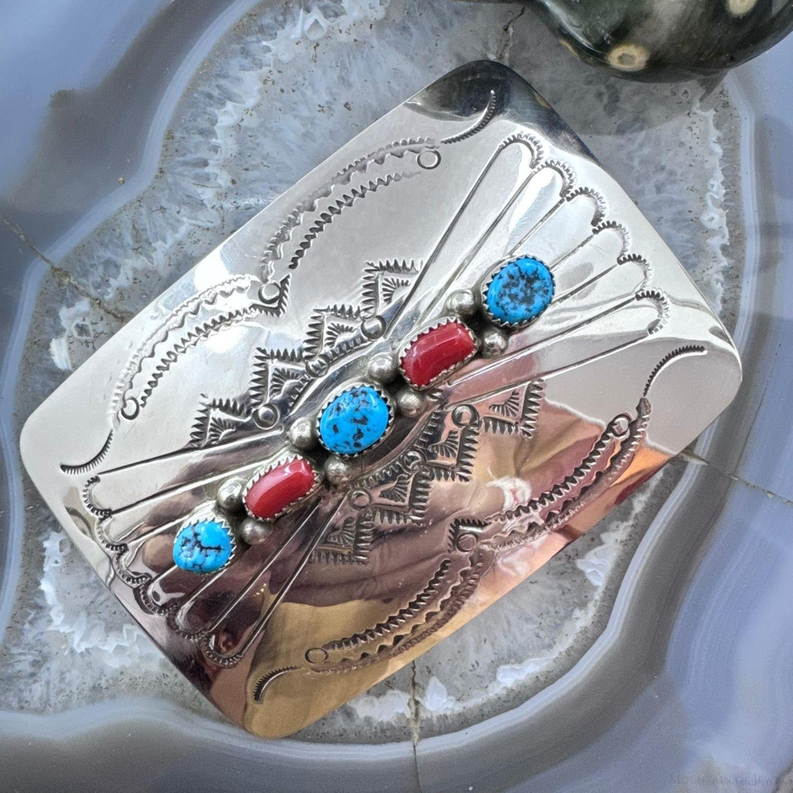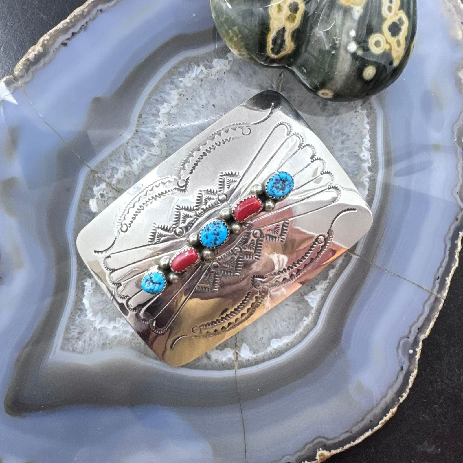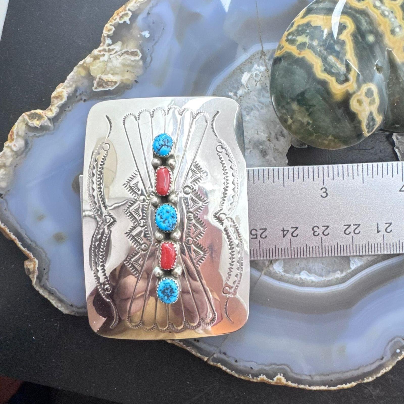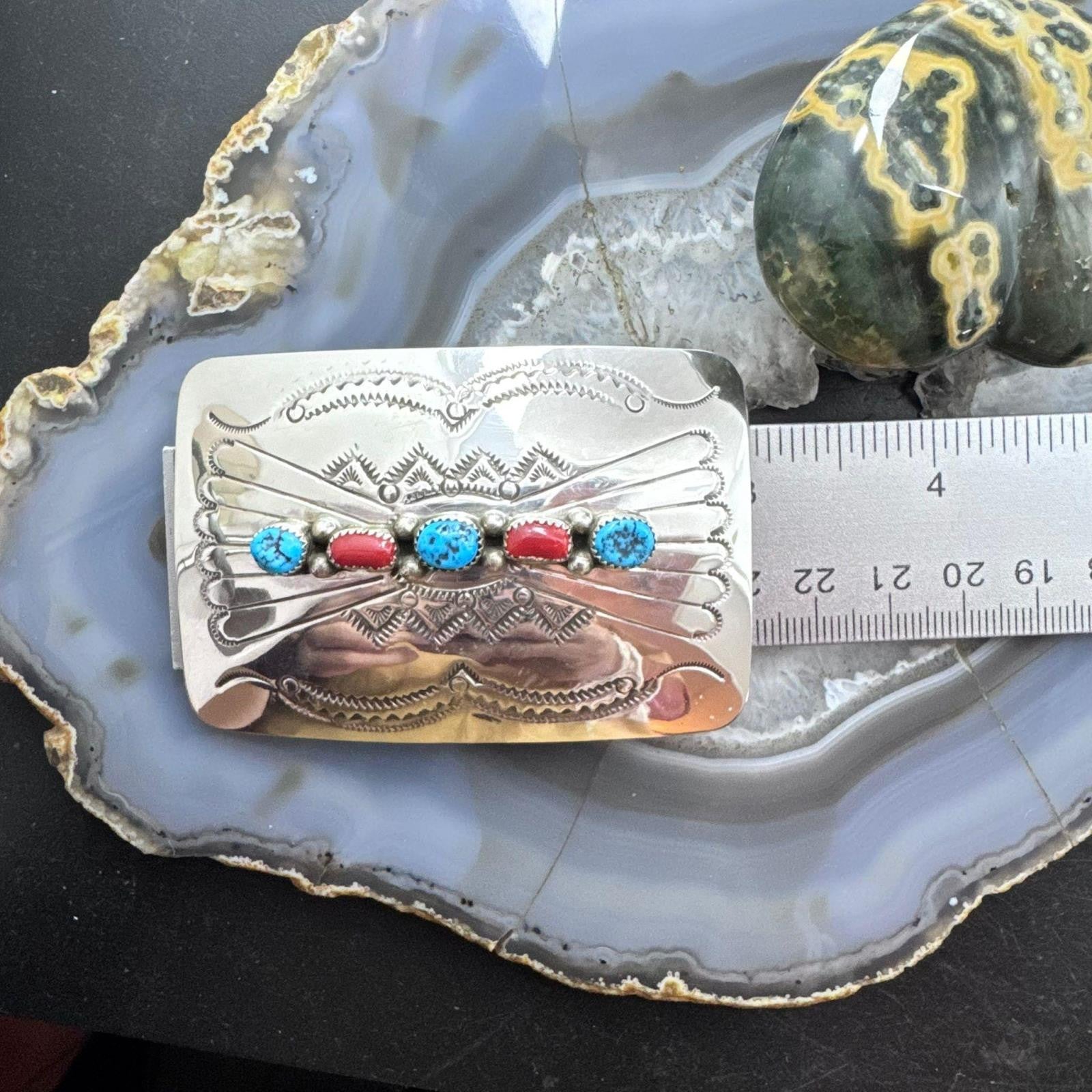 Sterling Silver Native American Turquoise & Coral Stamped Belt Buckle For Men