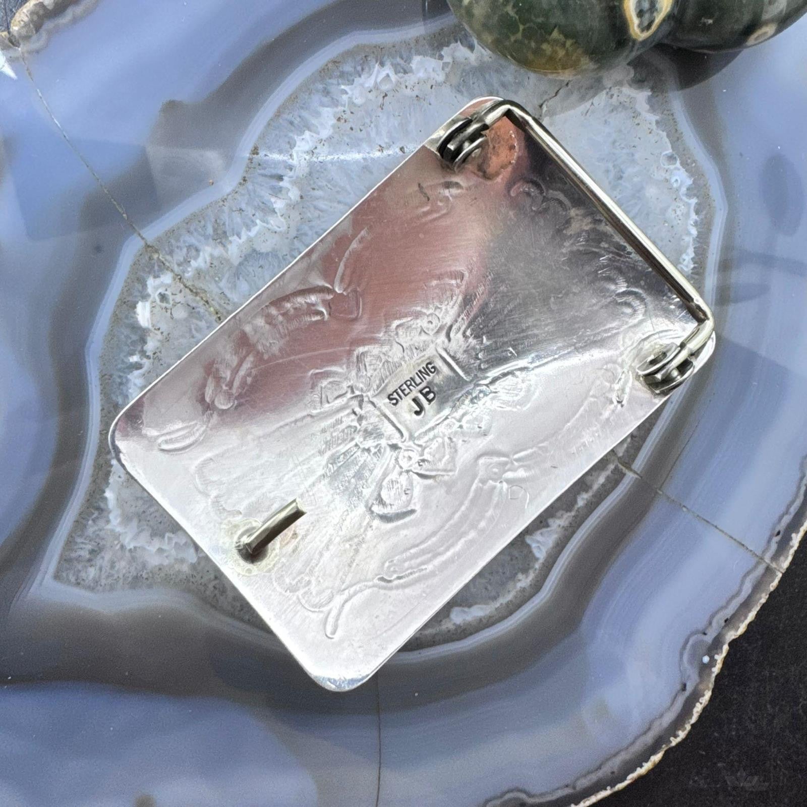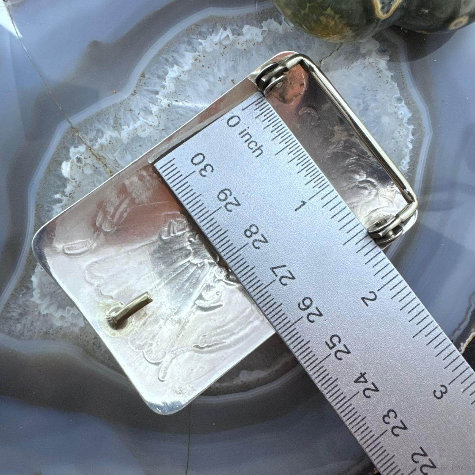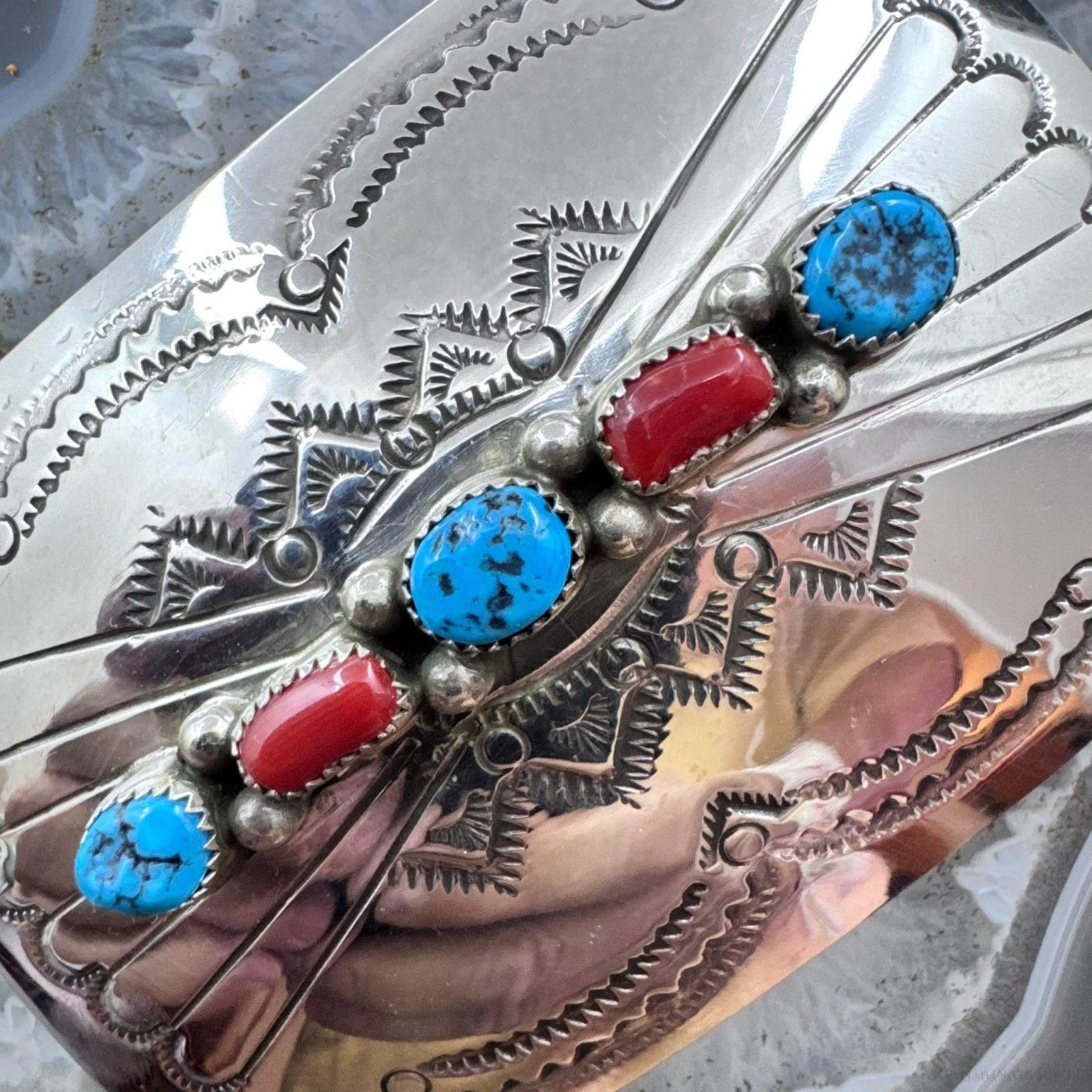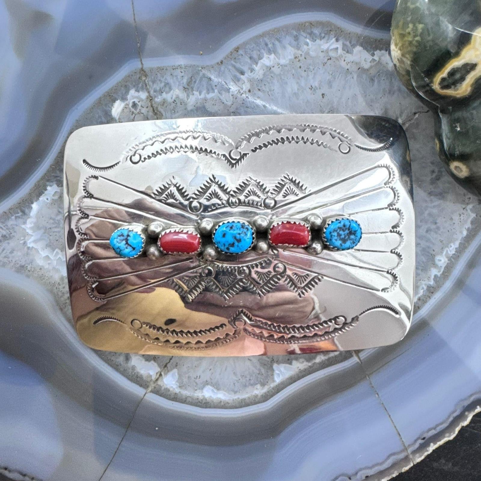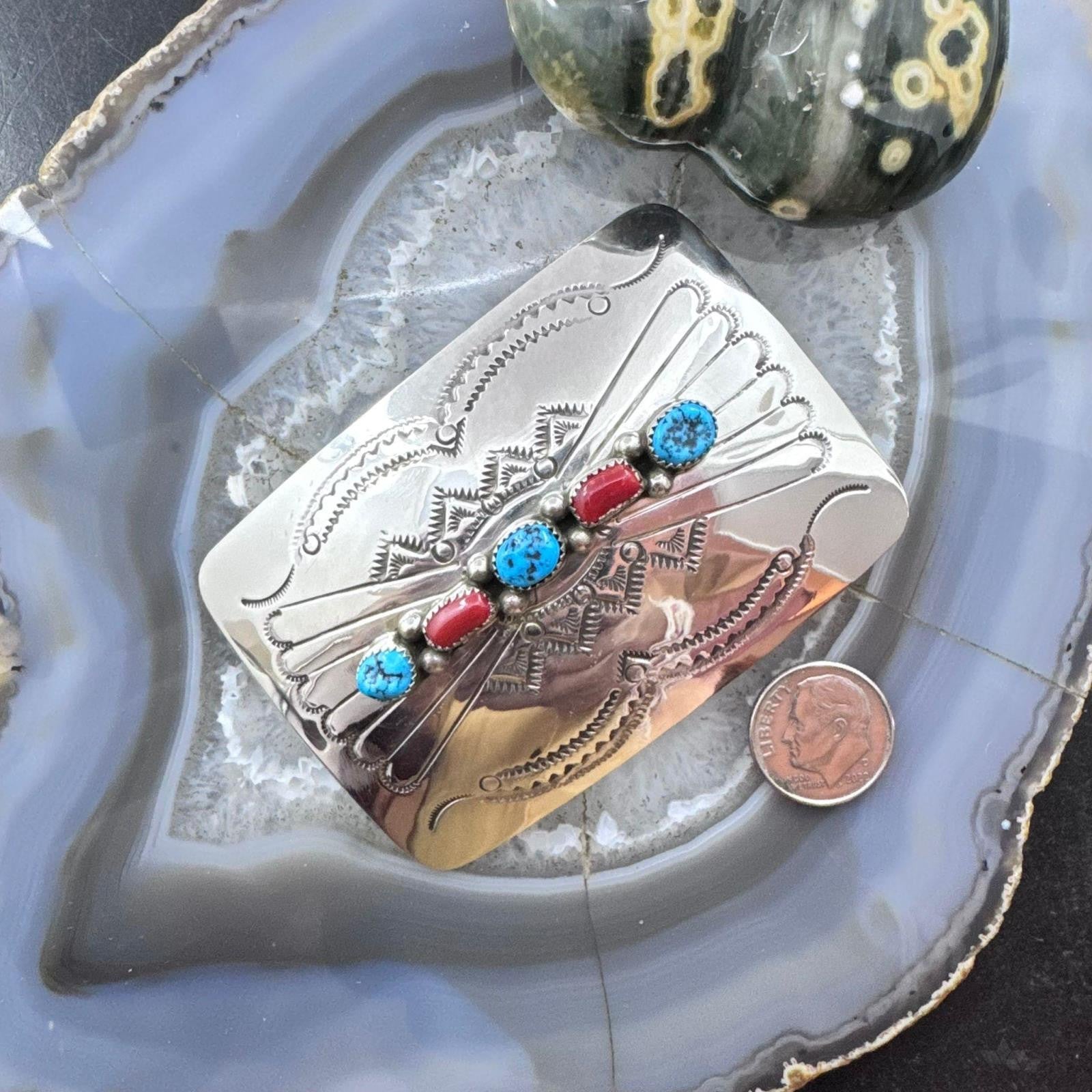 Sterling Silver Native American Turquoise & Coral Stamped Belt Buckle For Men