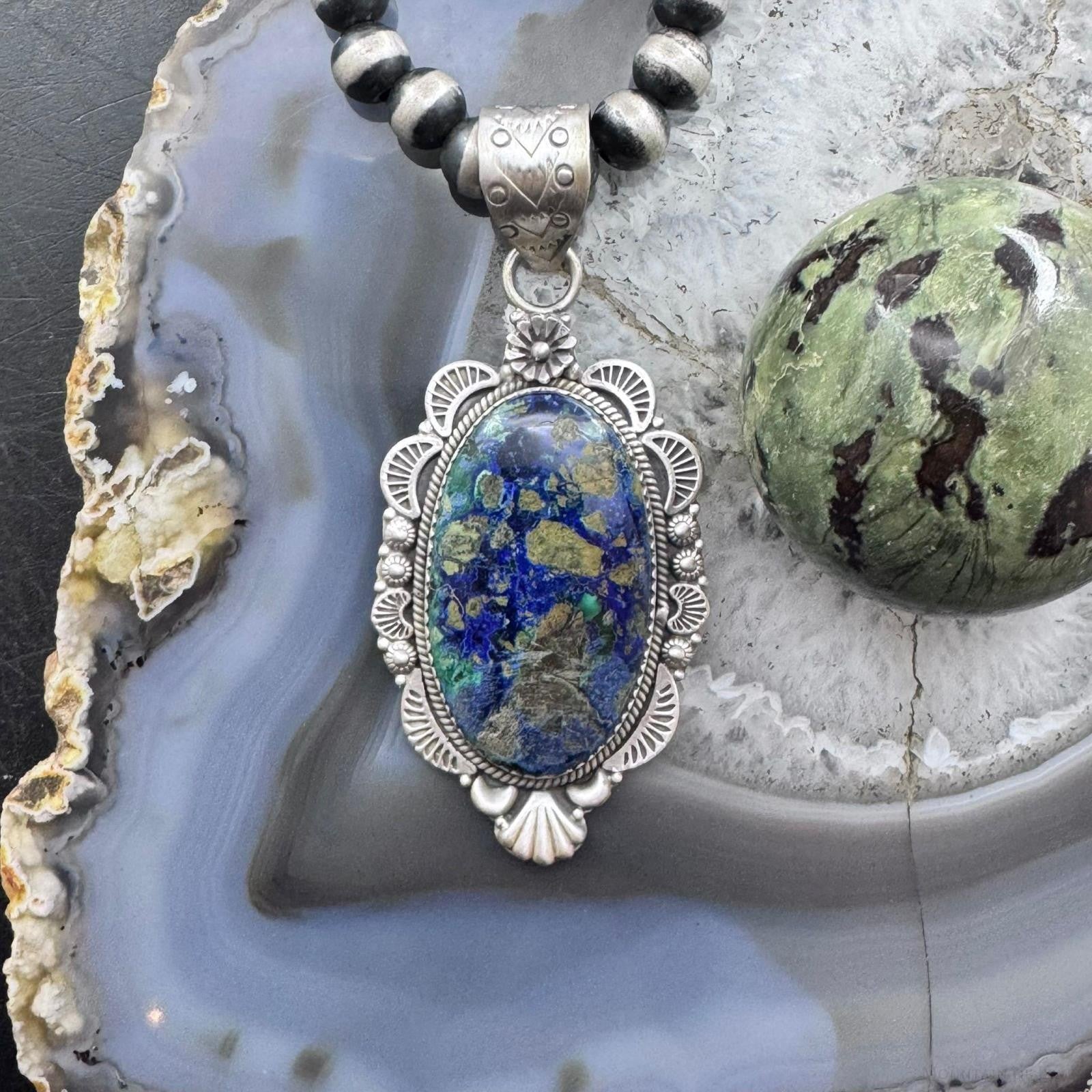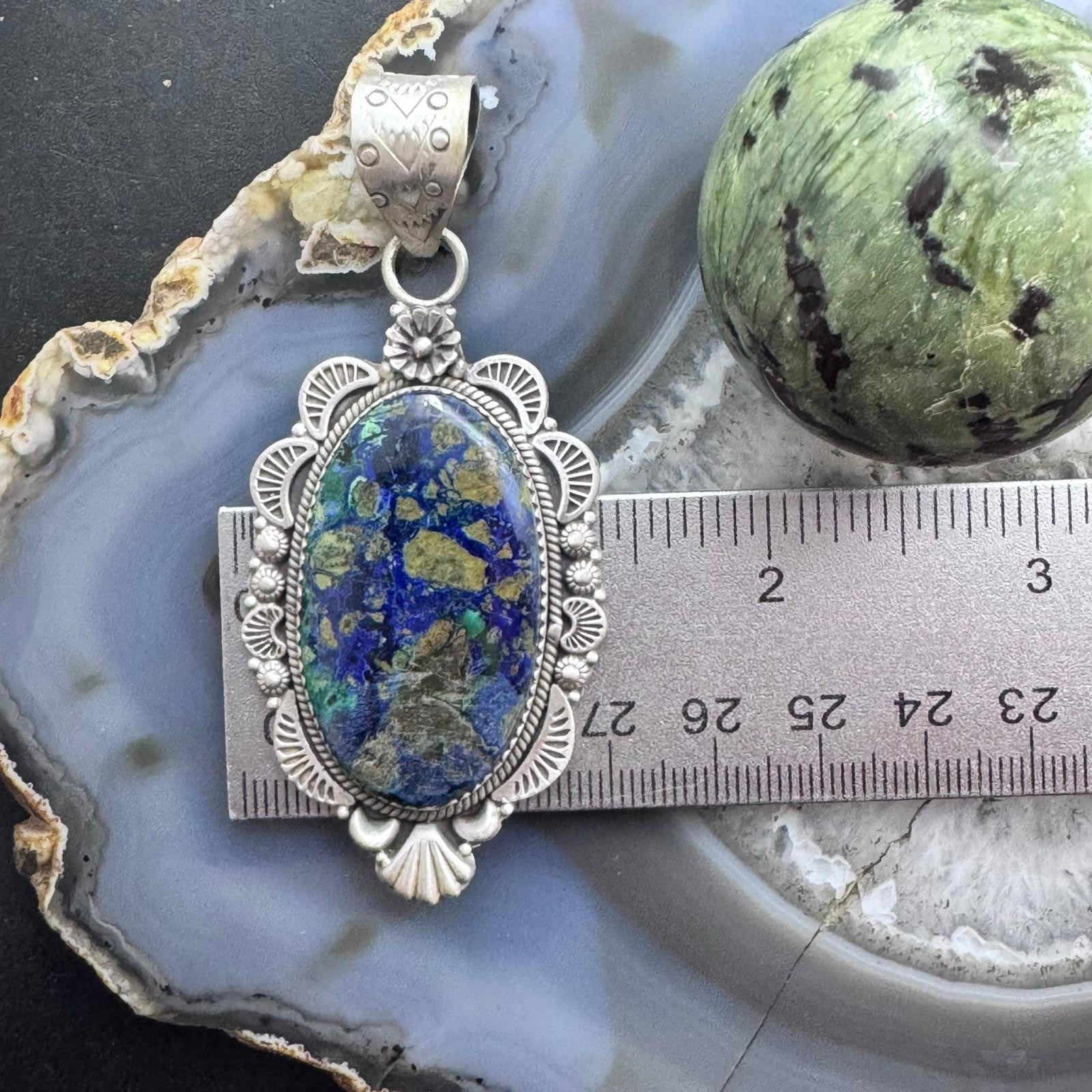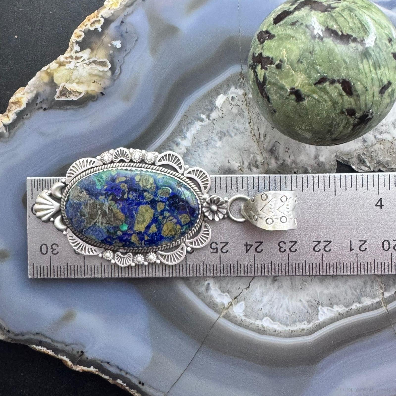 Sterling Silver Southwestern Style Elongated Oval Chrysocolla Decorated Pendant For Women