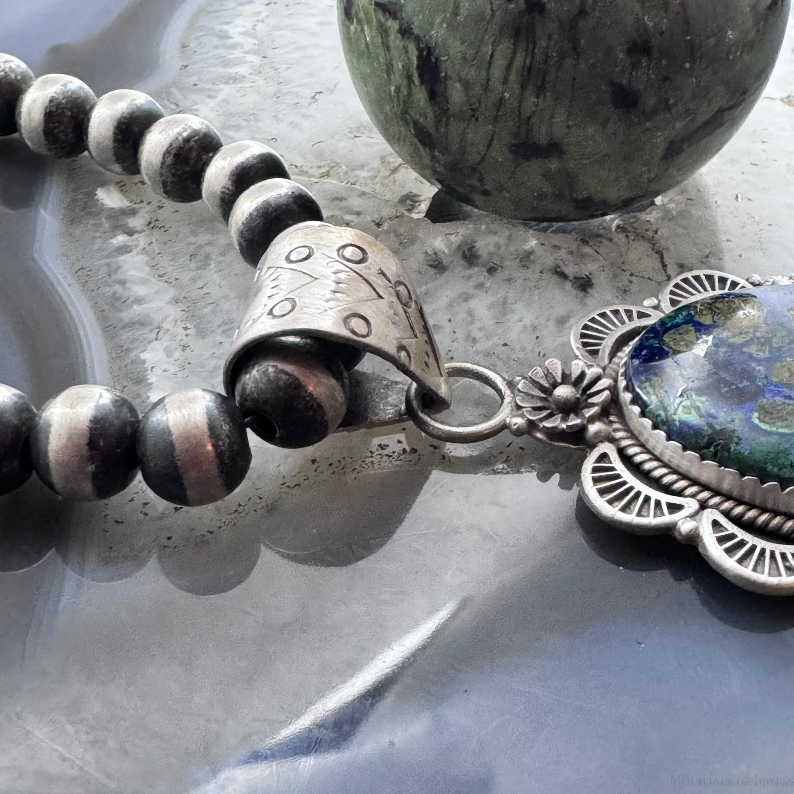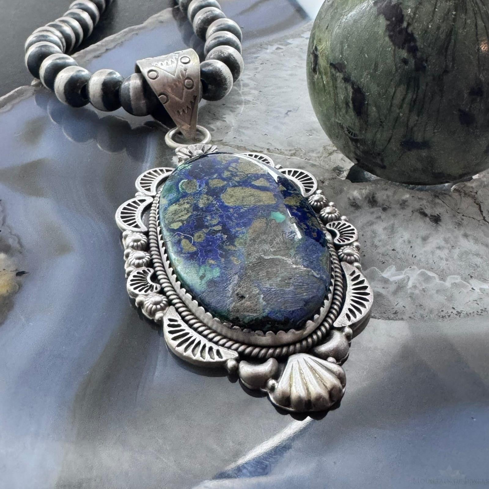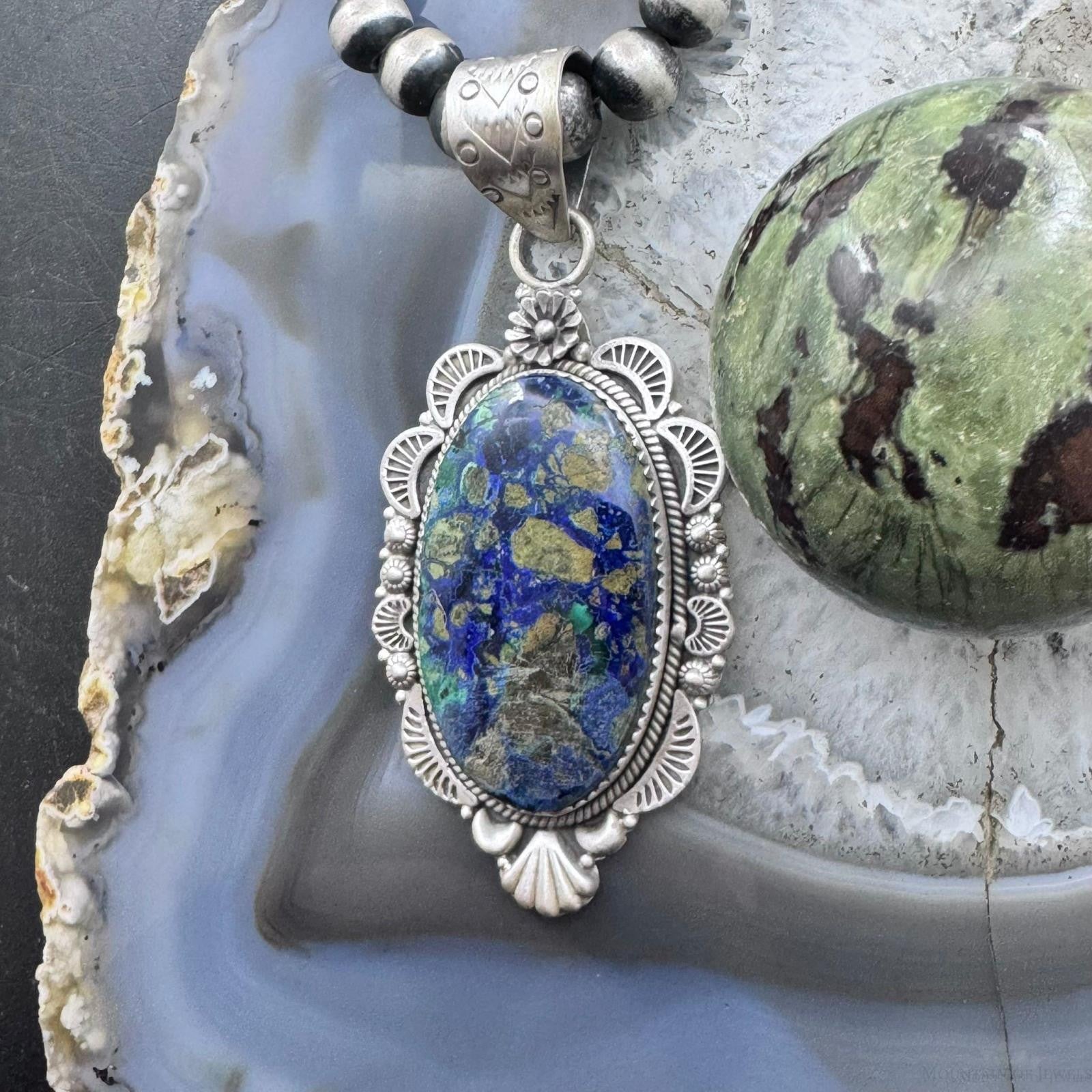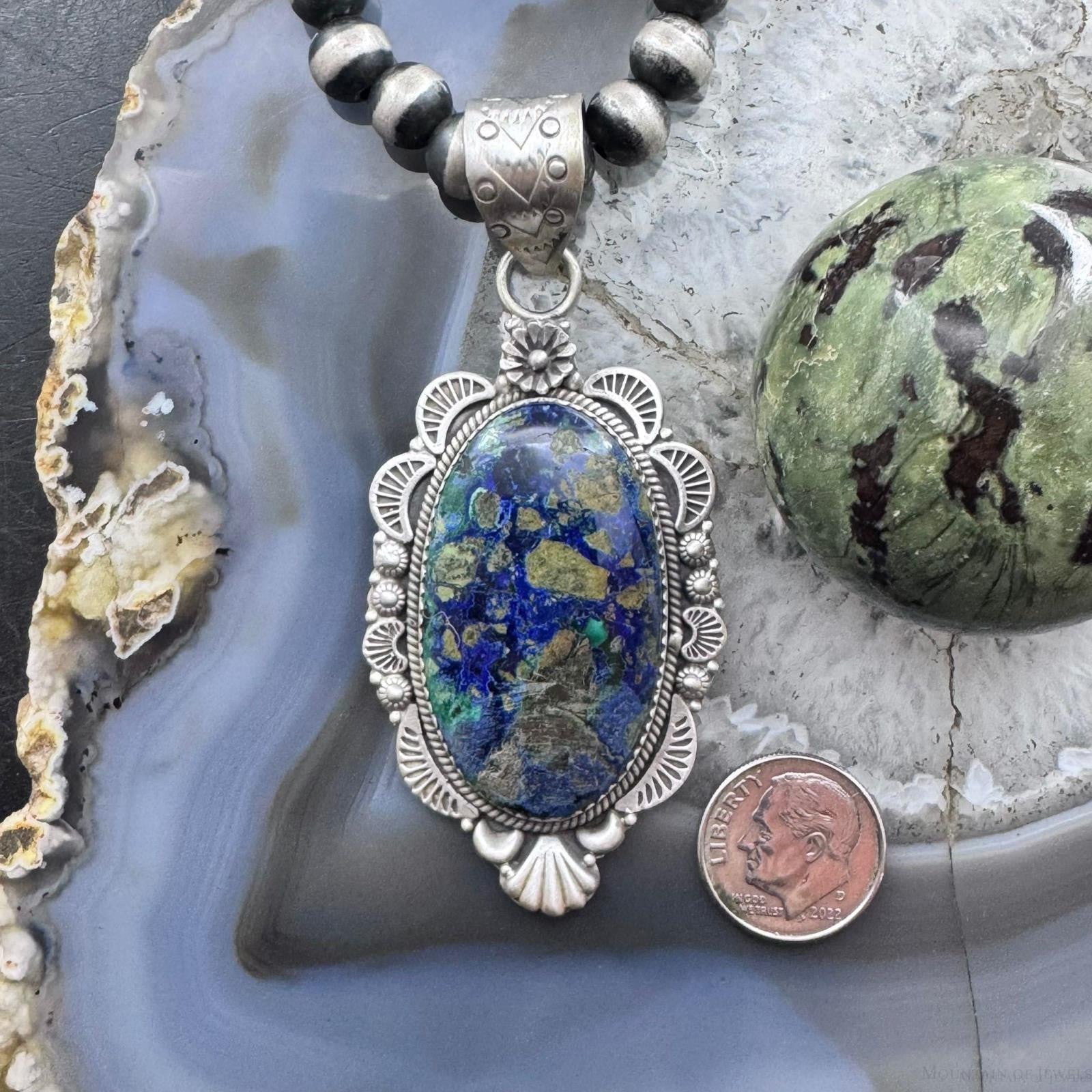 Sterling Silver Southwestern Style Elongated Oval Chrysocolla Decorated Pendant For Women