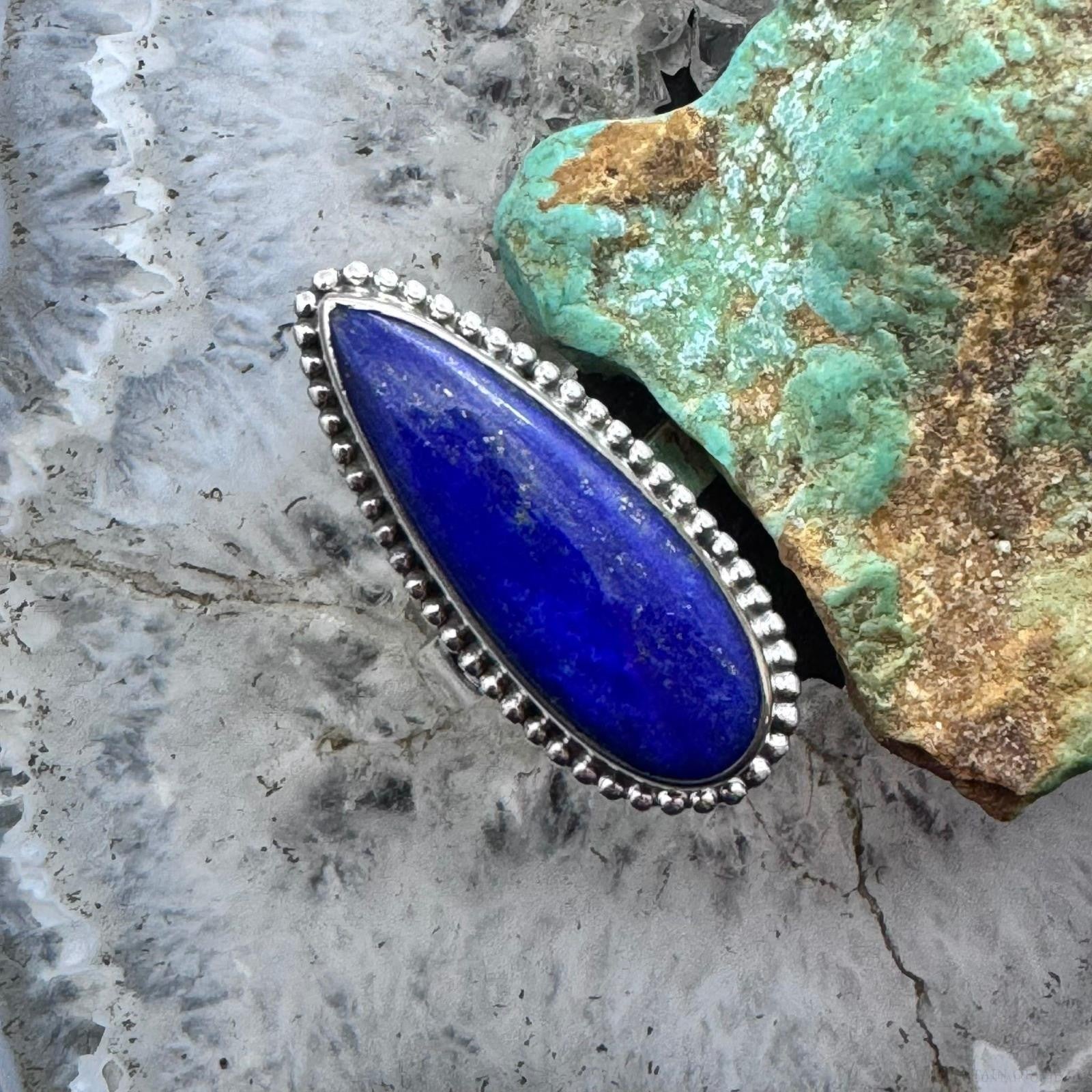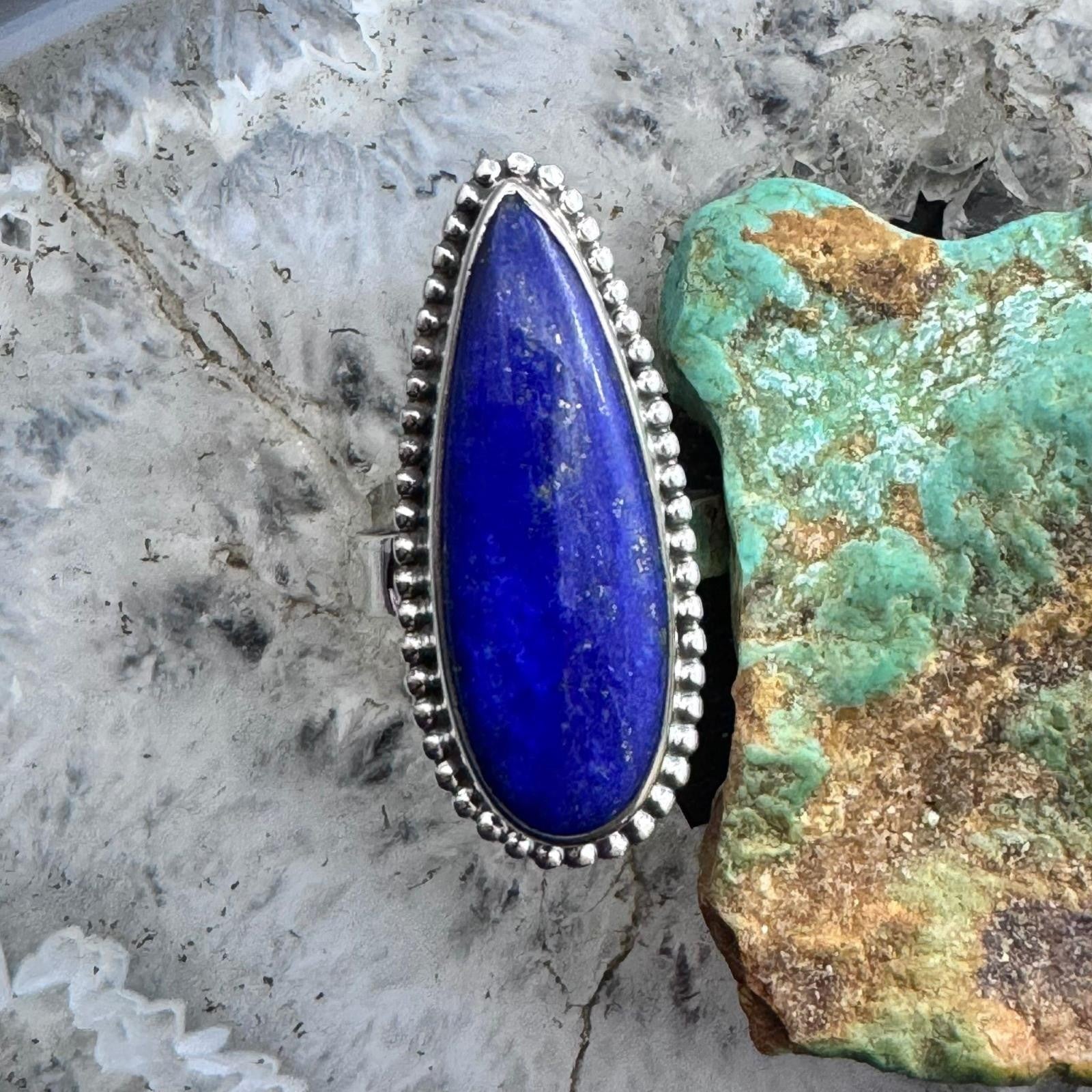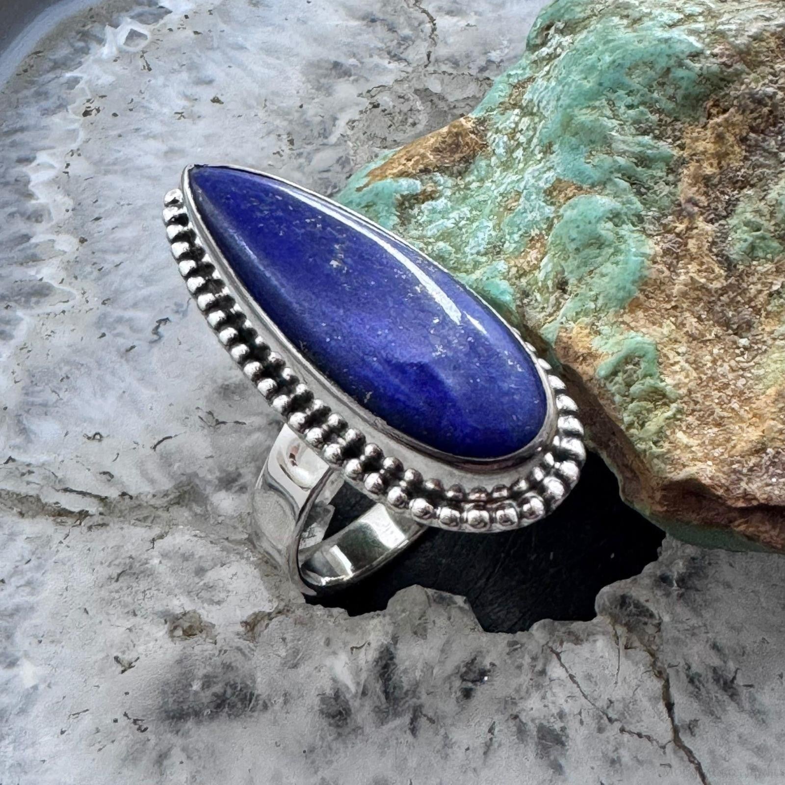Sterling Silver Southwestern Style Elongated Teardrop Lapis Decorated Ring Size 8 For Women