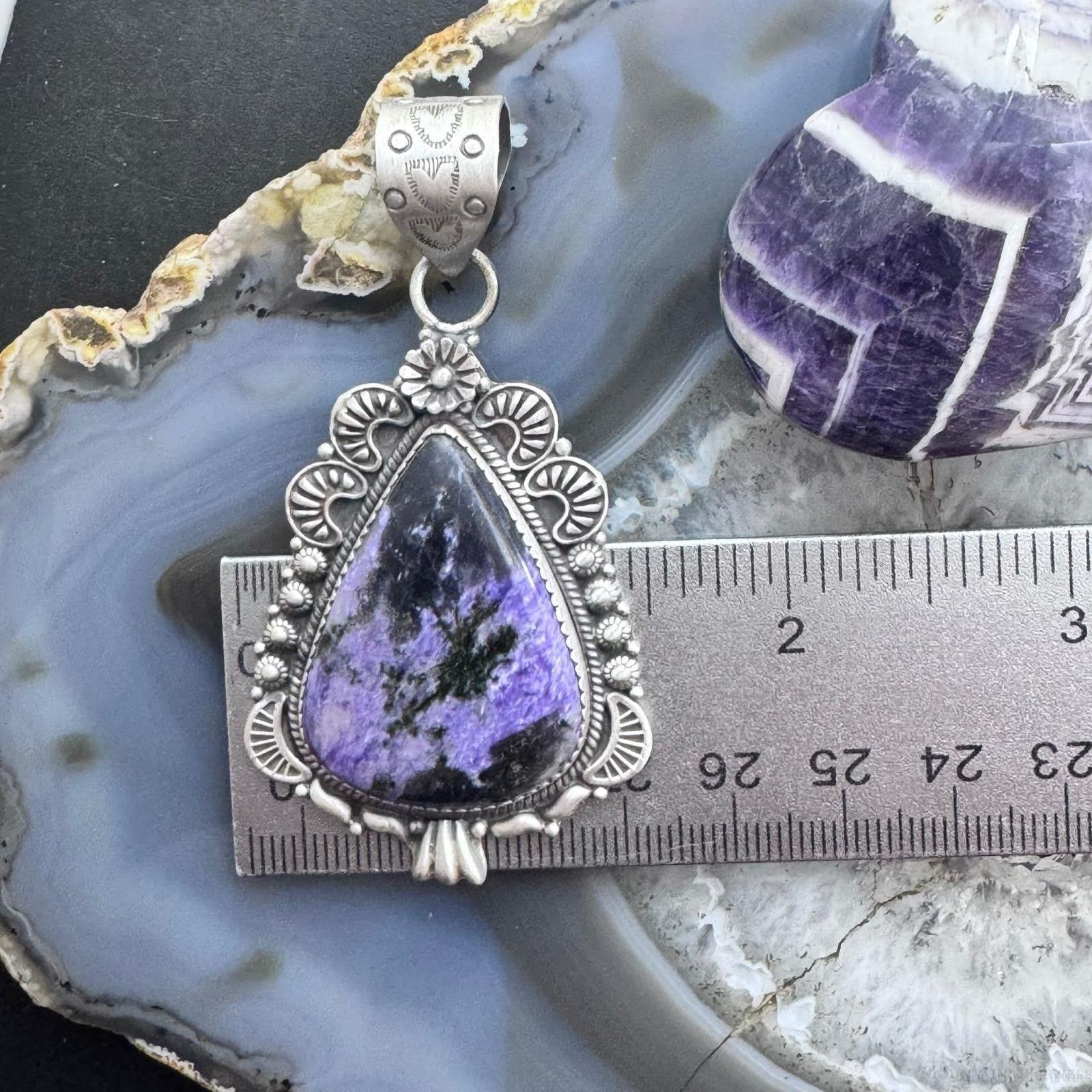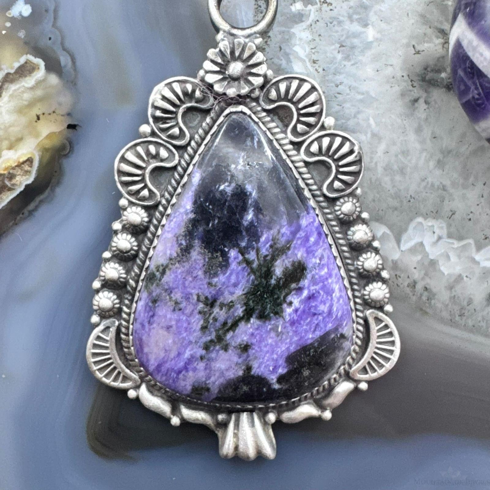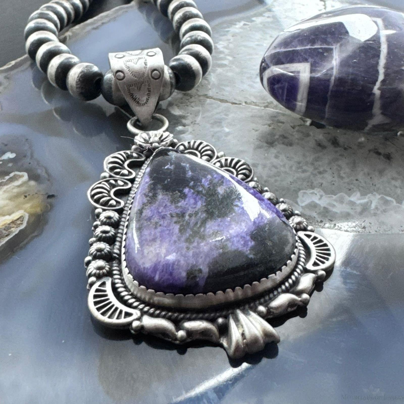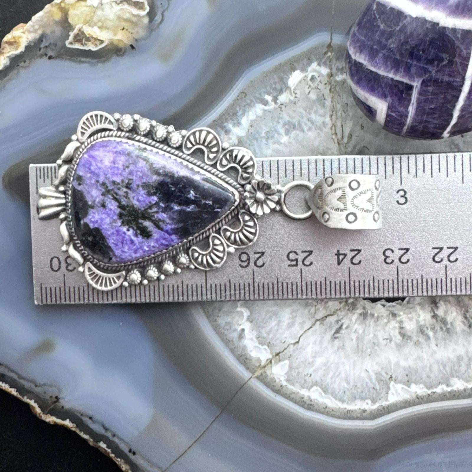 Sterling Silver Southwestern Style Elongated Teardrop Purple Charoite Pendant For Women