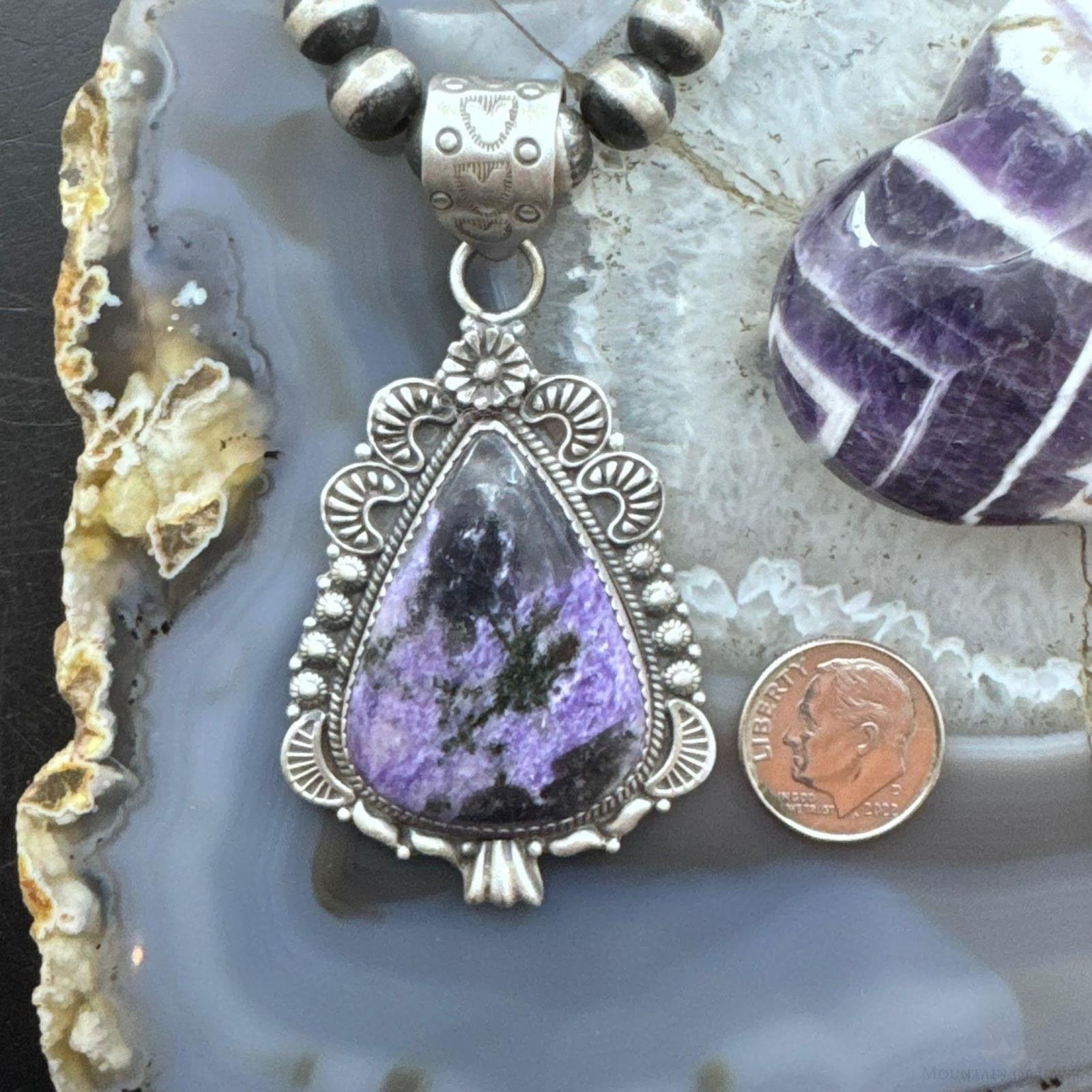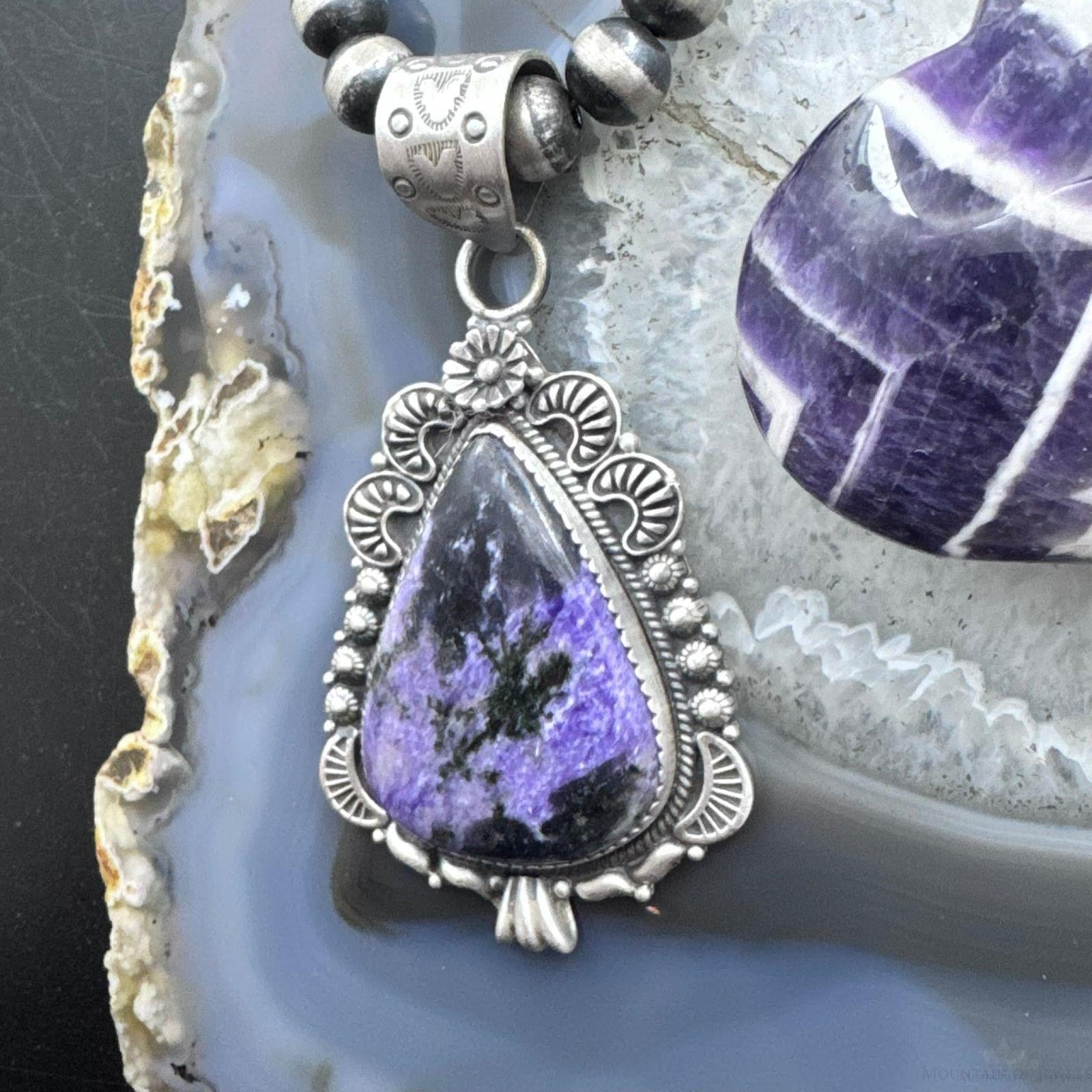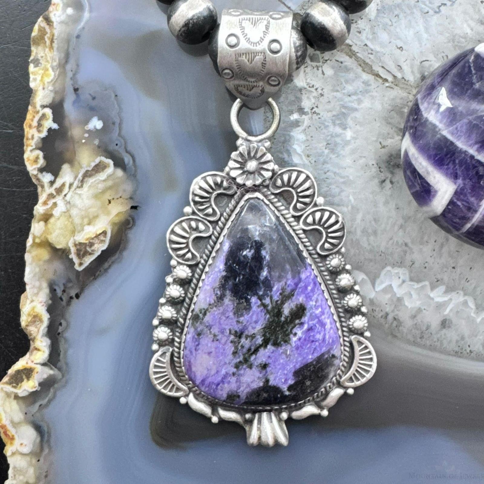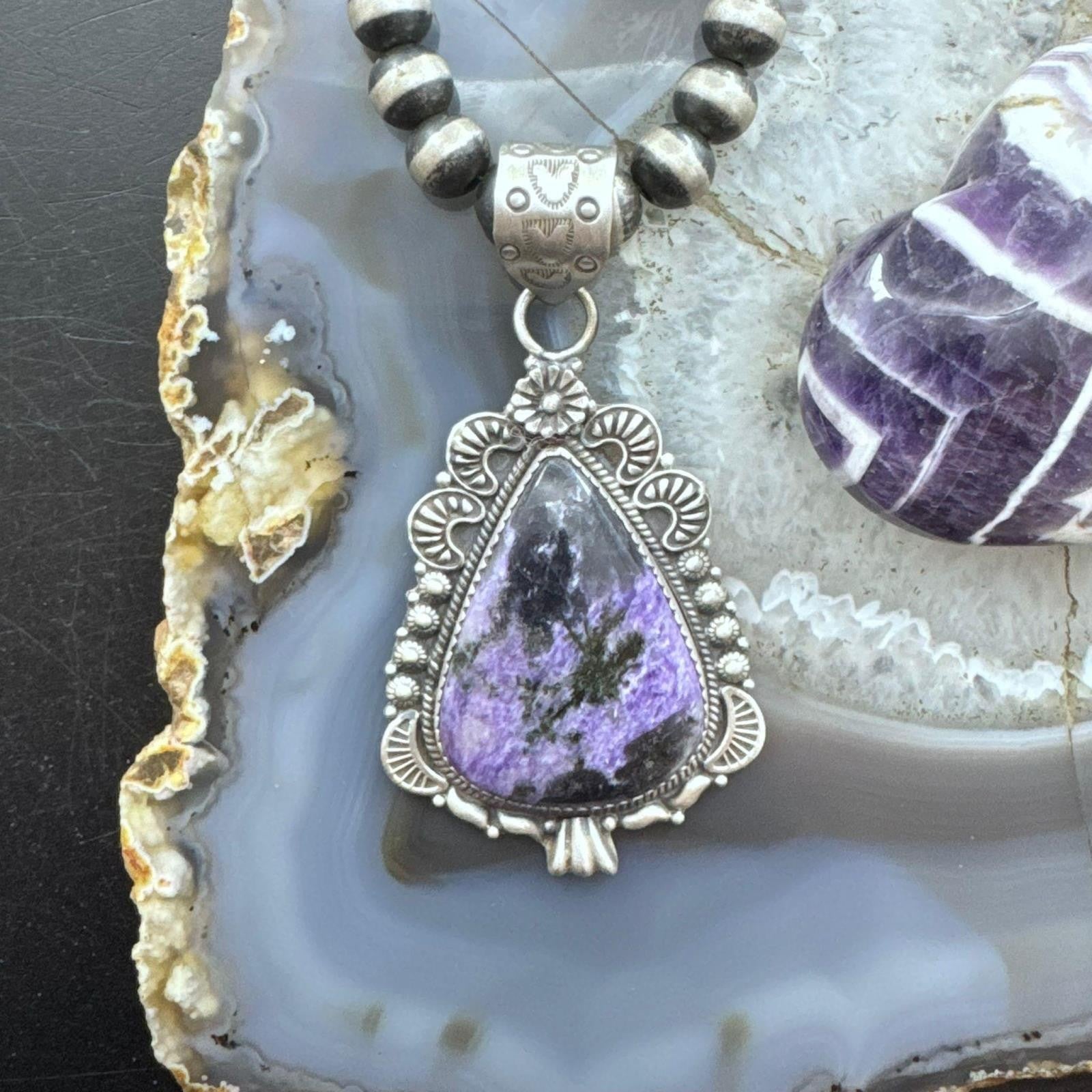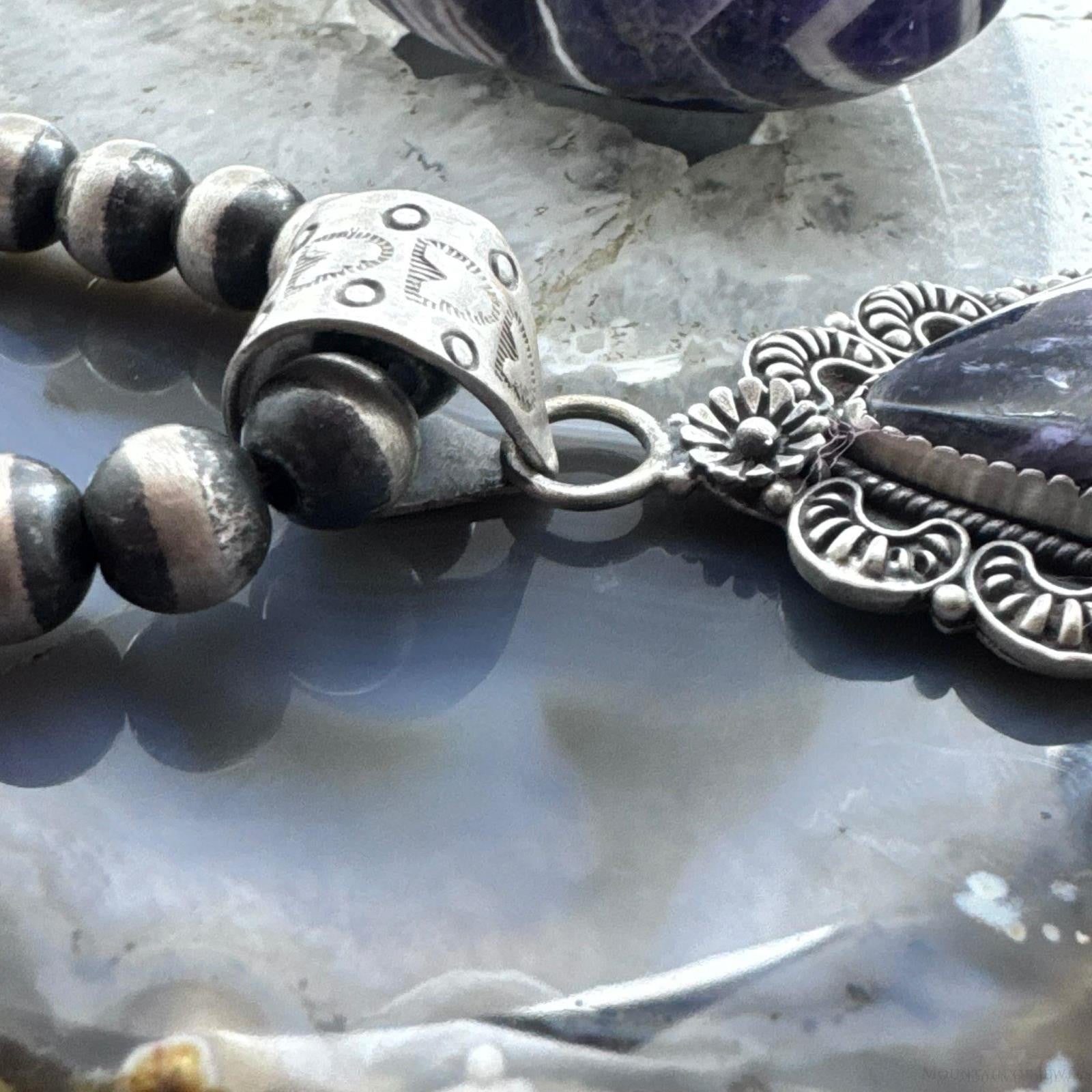 Sterling Silver Southwestern Style Elongated Teardrop Purple Charoite Pendant For Women