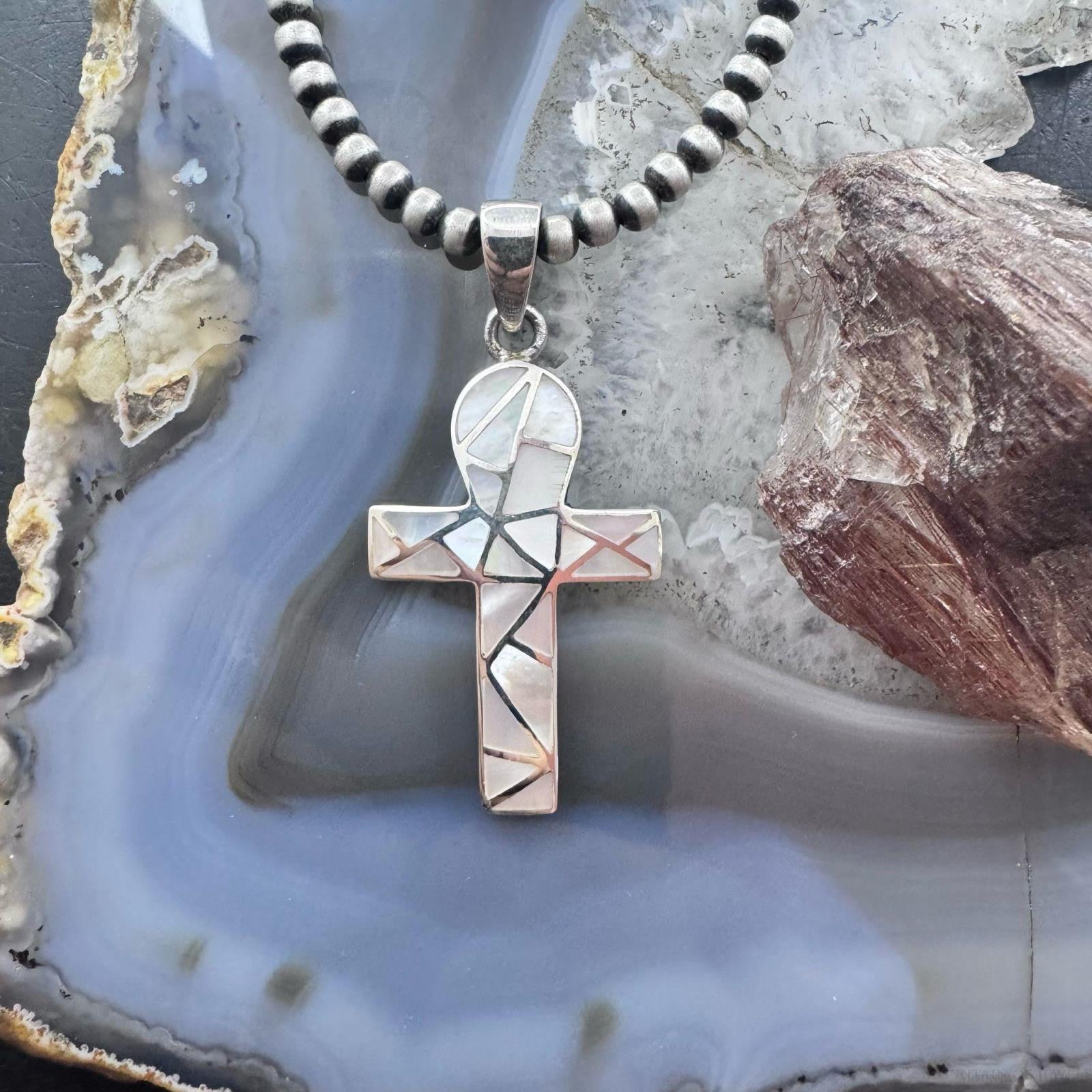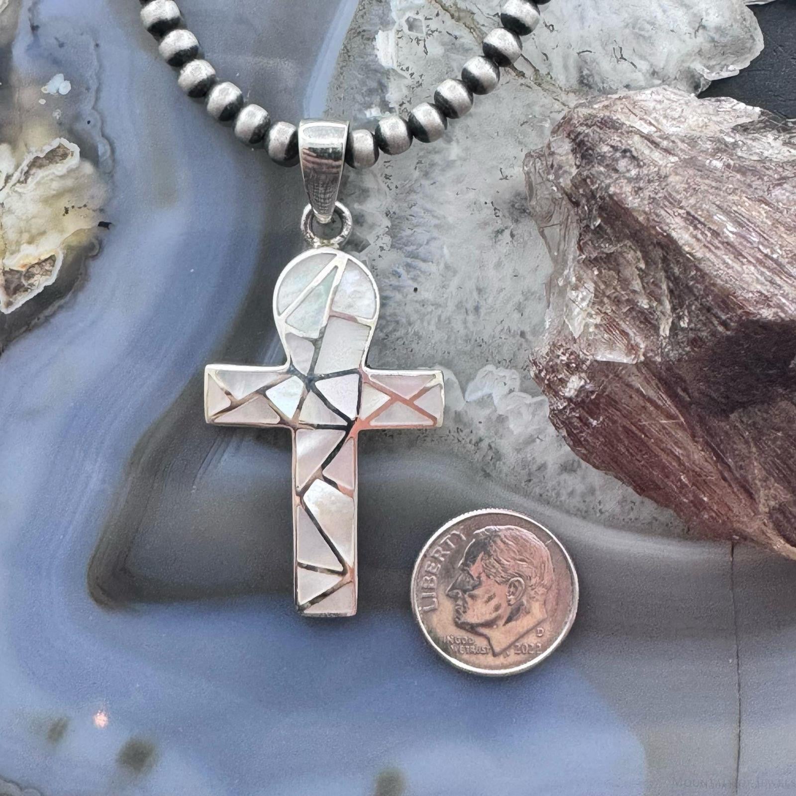 Sterling Silver Southwestern Style Mother of Pearl Inlay Unisex Cross Pendant