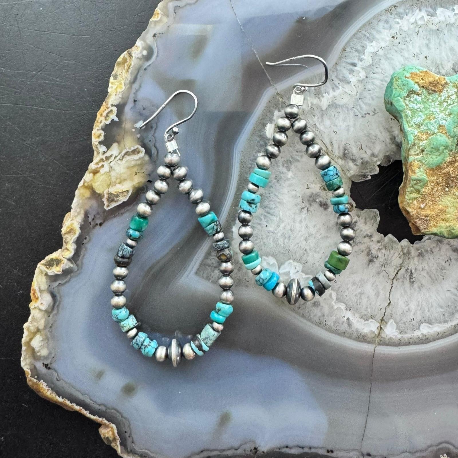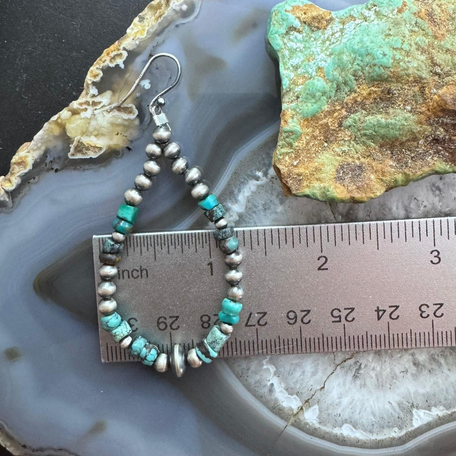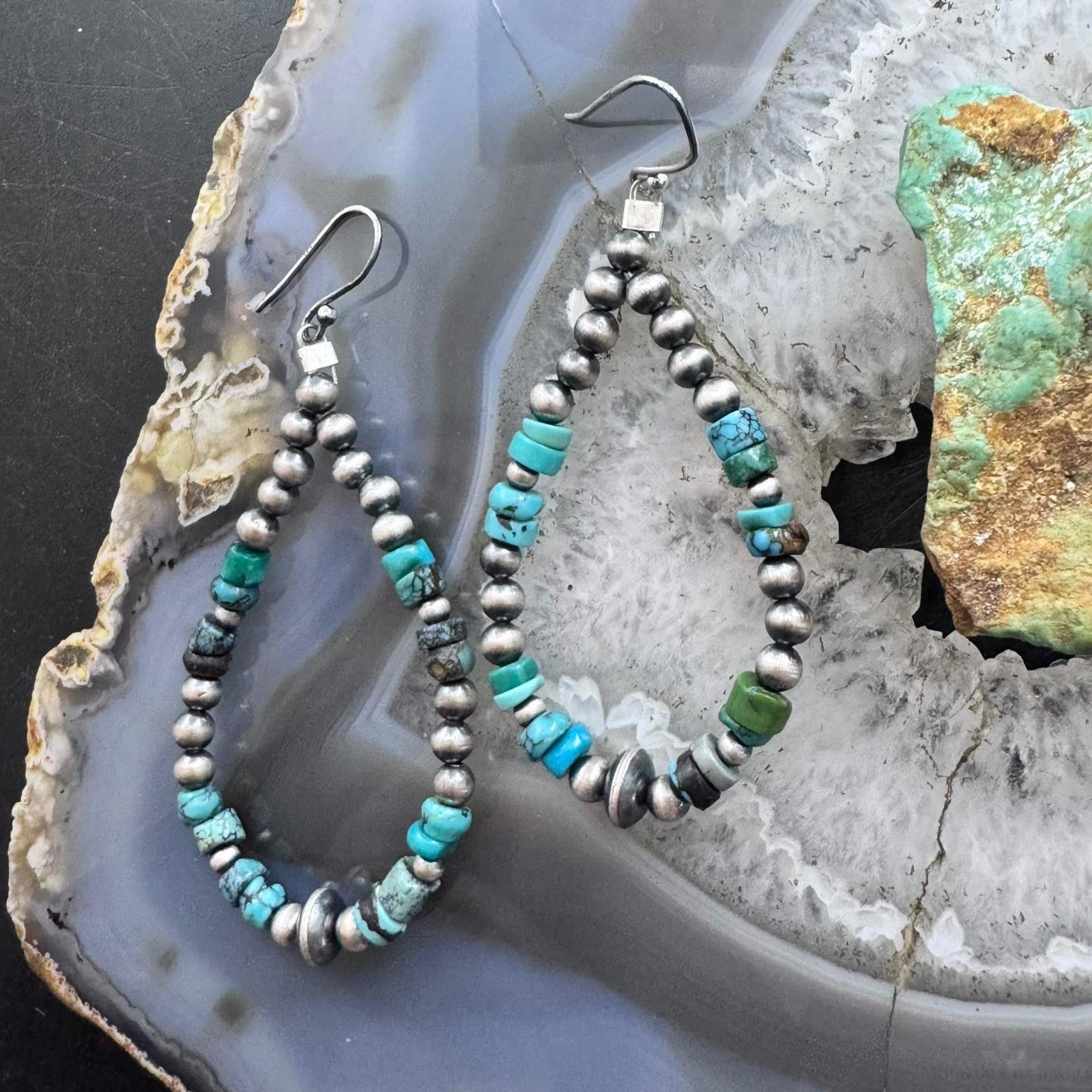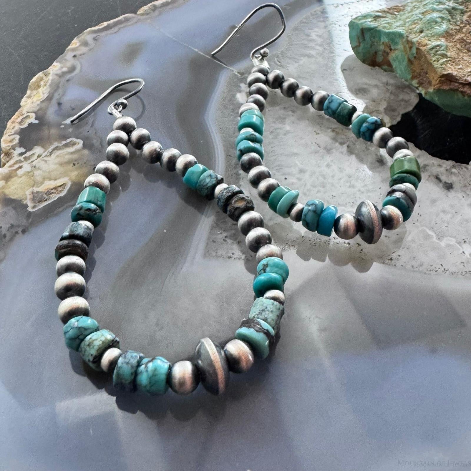 Sterling Silver Southwestern Style Navajo Pearl & Turquoise Bead Hoop Earrings For Women