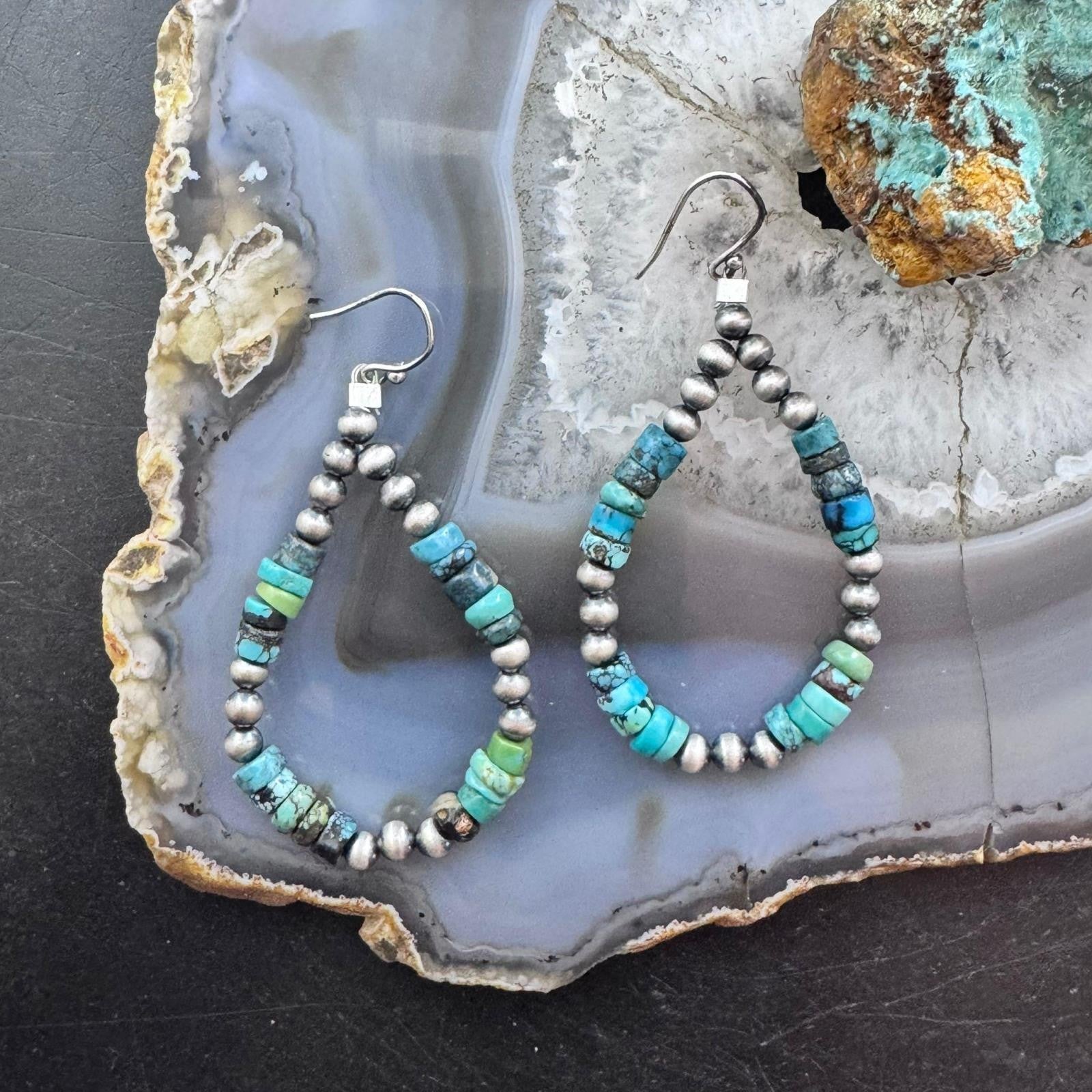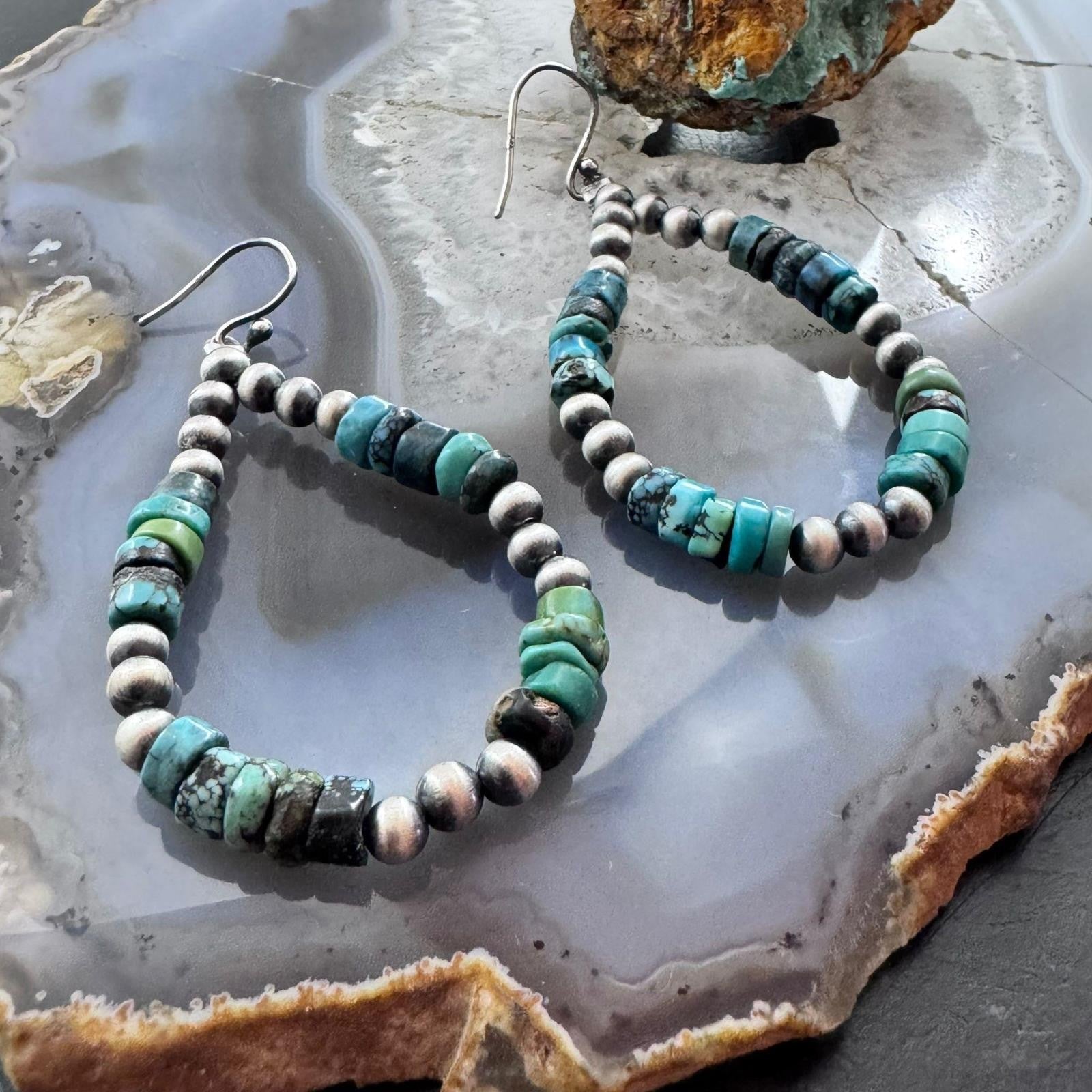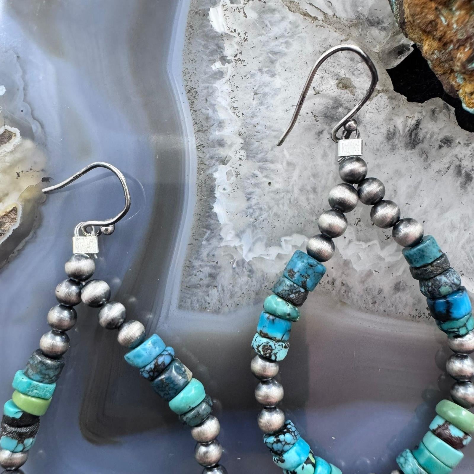 Sterling Silver Southwestern Style Navajo Pearl & Turquoise Bead Hoop Earrings For Women