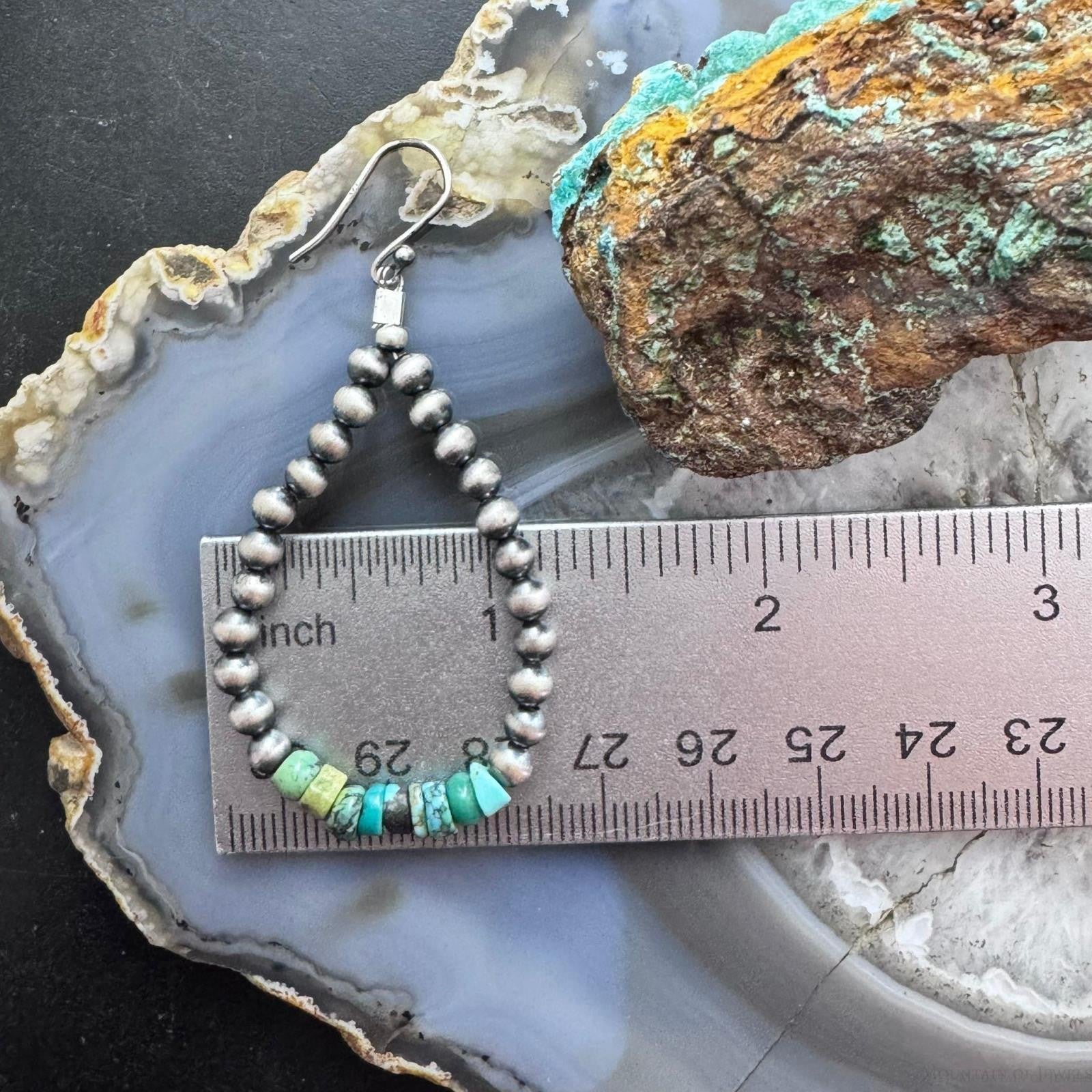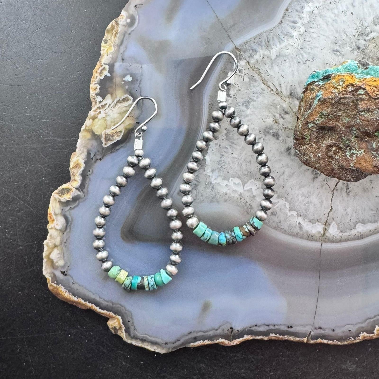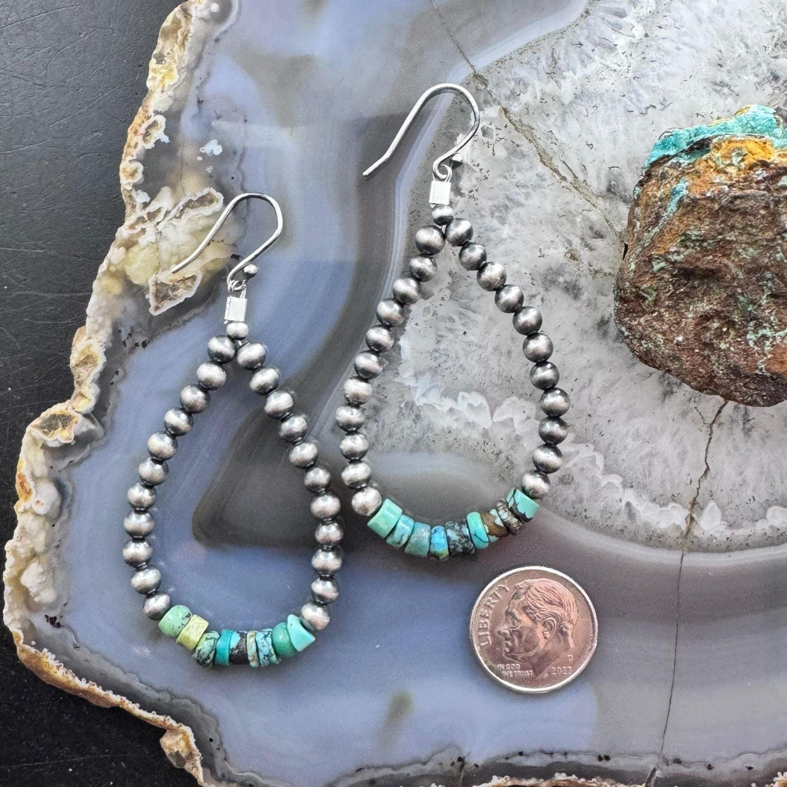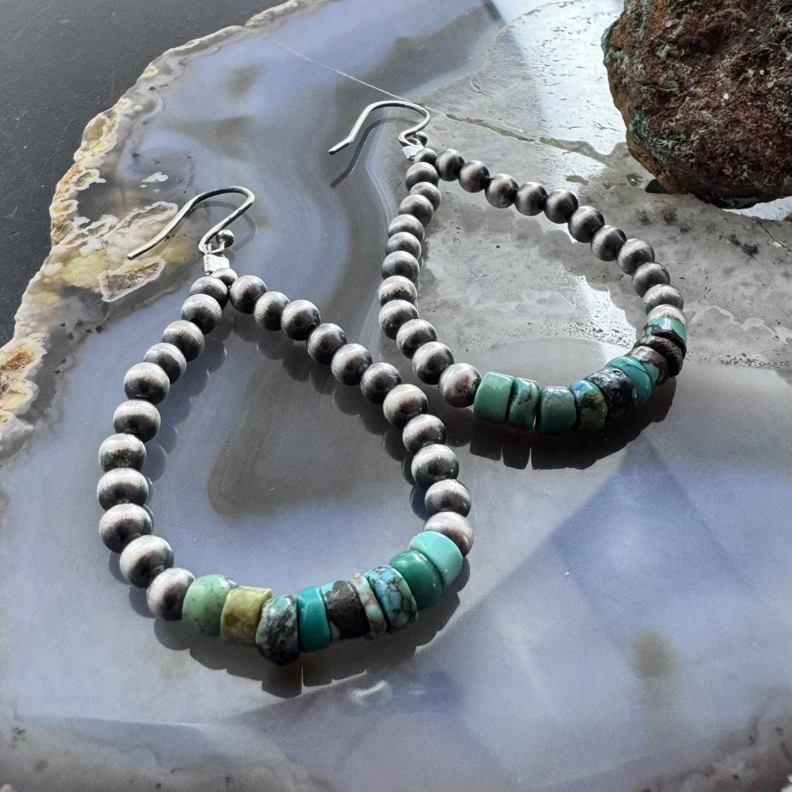 Sterling Silver Southwestern Style Navajo Pearl & Turquoise Bead Hoop Earrings For Women
