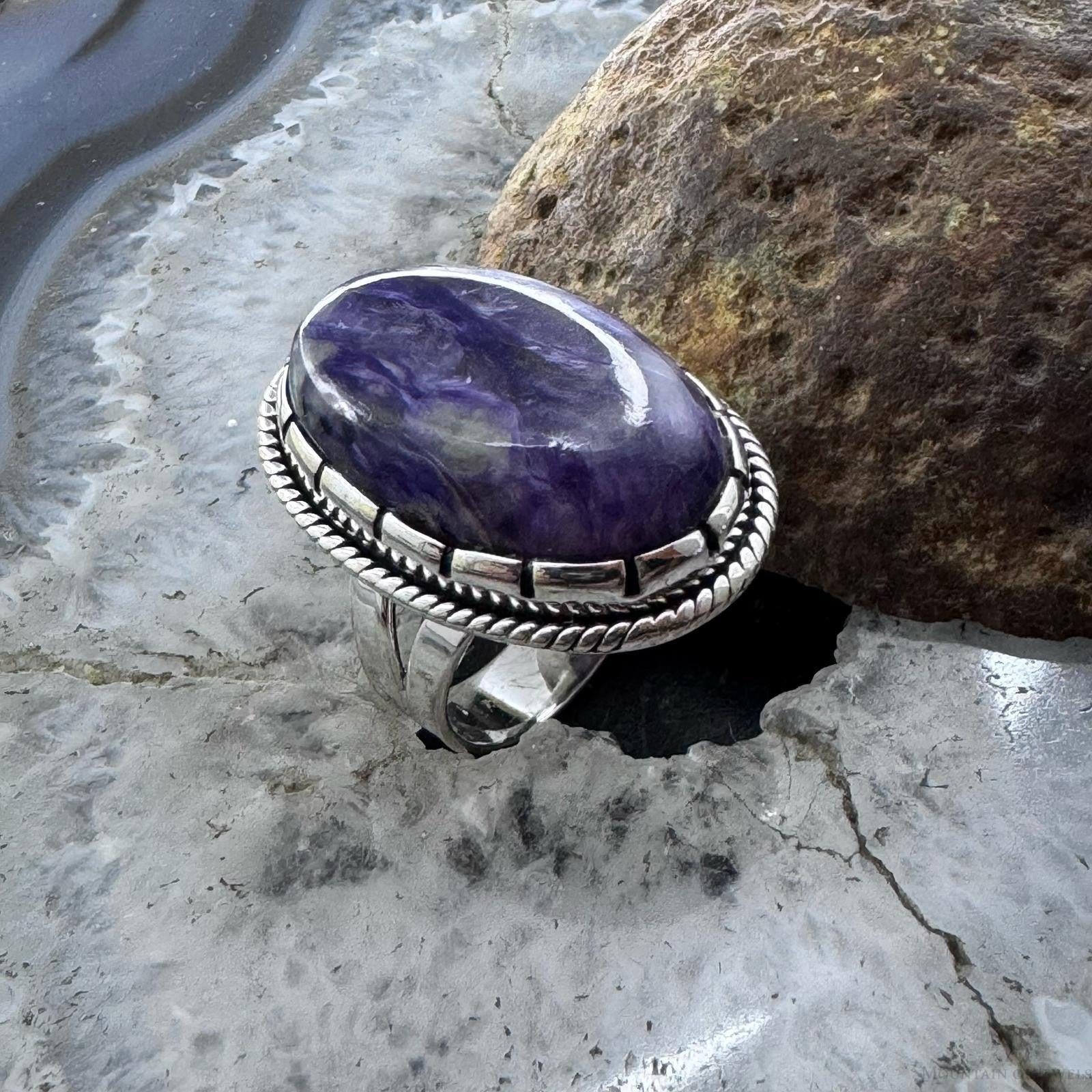 Sterling Silver Southwestern Style Oval Charoite Decorated Ring Size 7.5 For Women