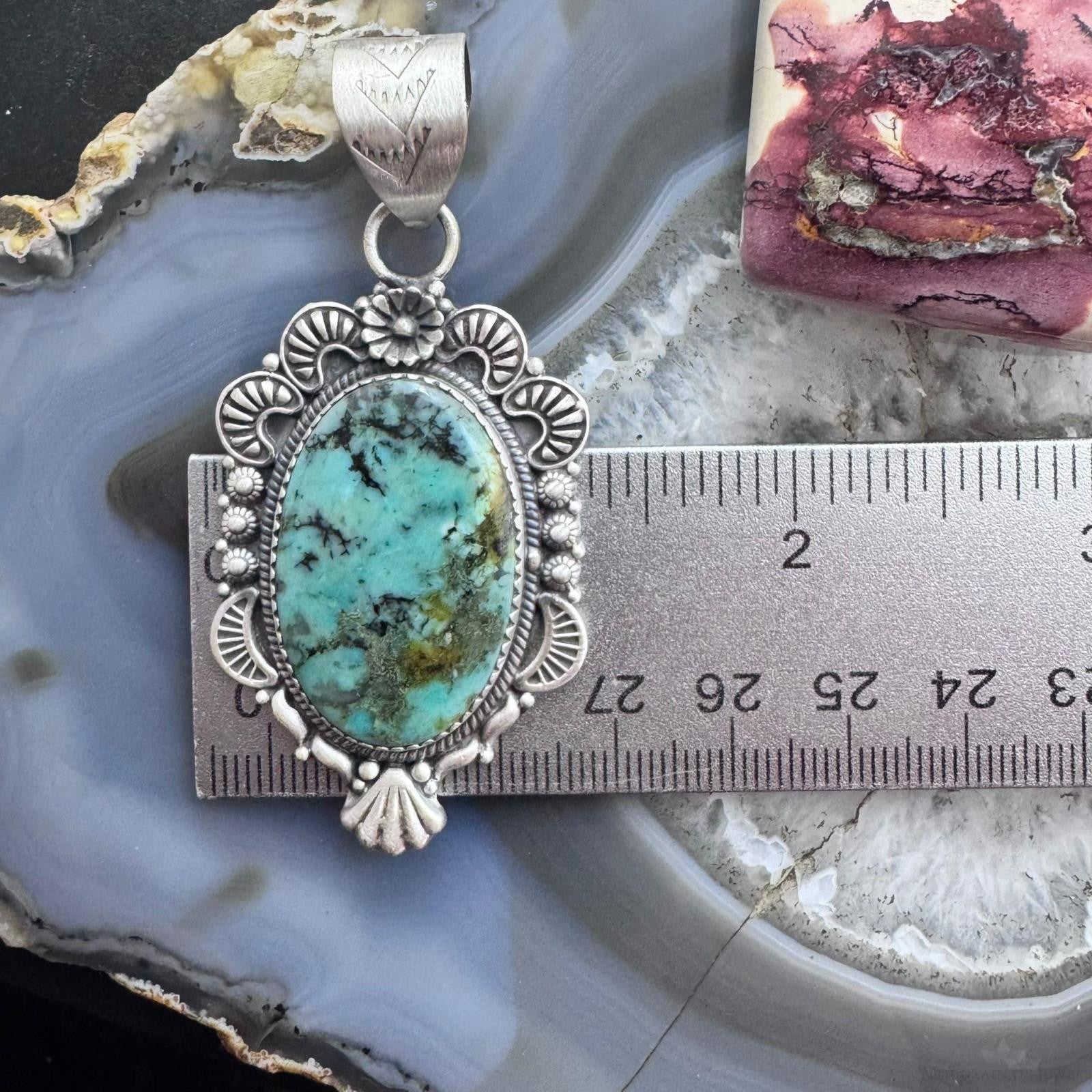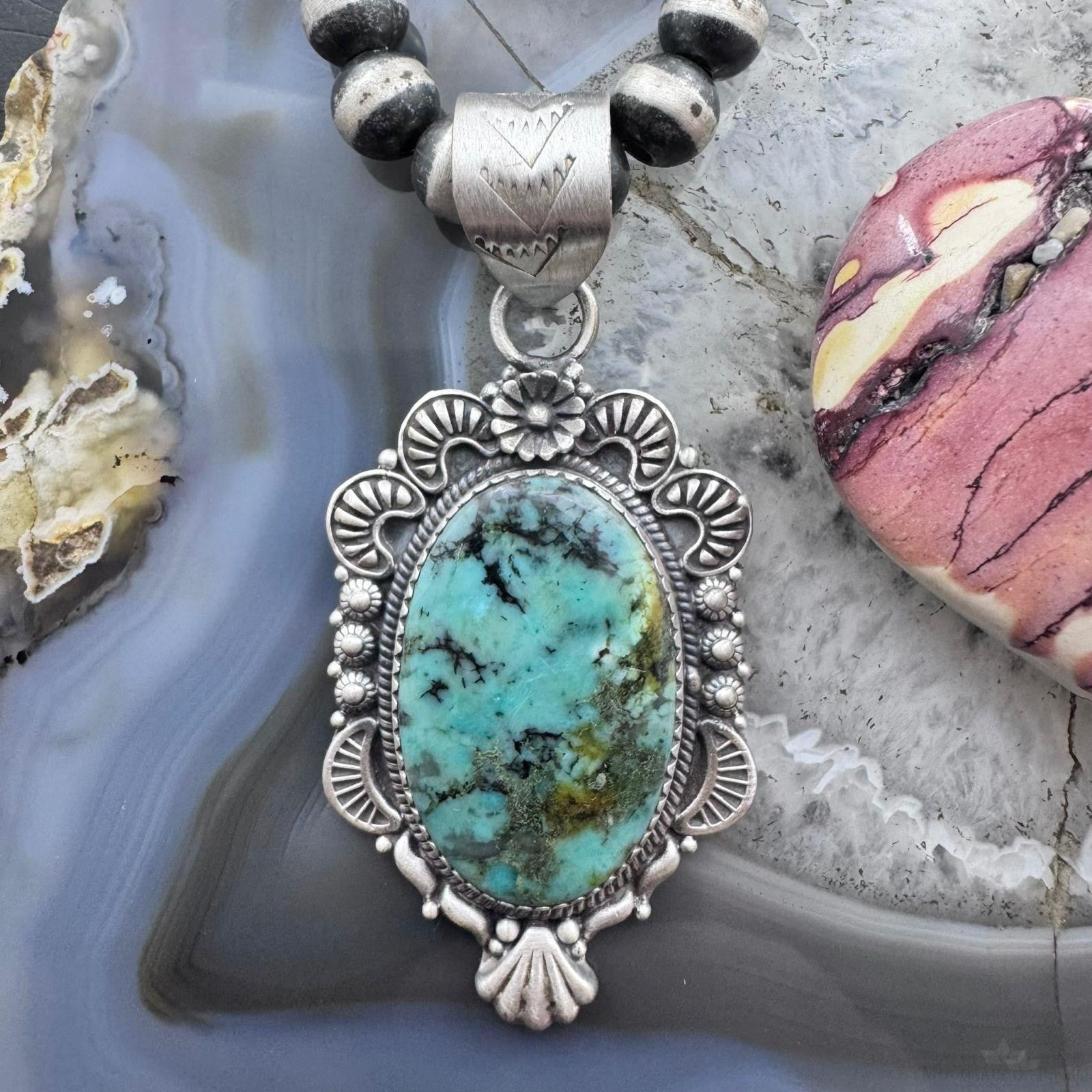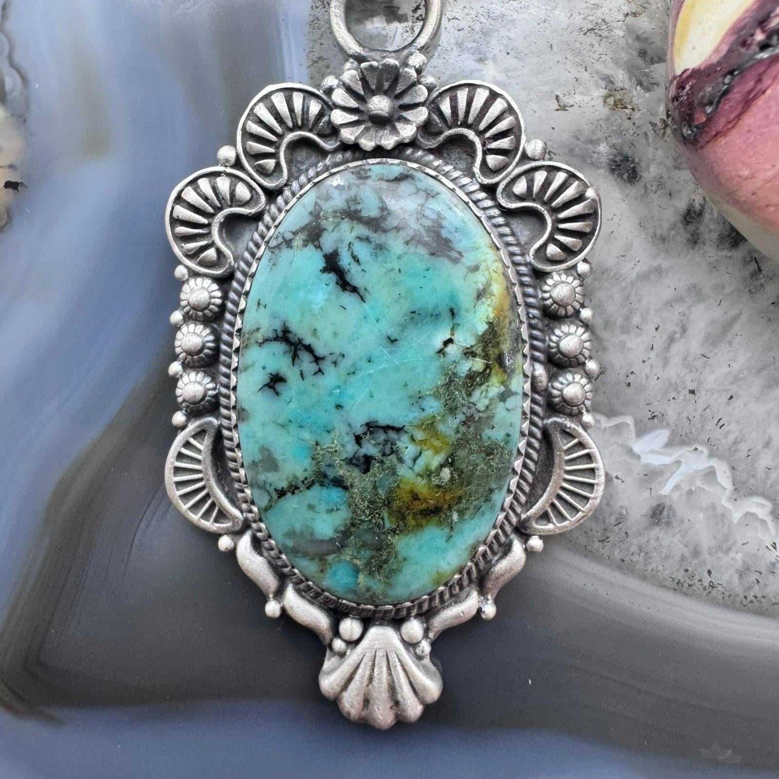Sterling Silver Southwestern Style Oval Emerald Decorated Pendant For Women