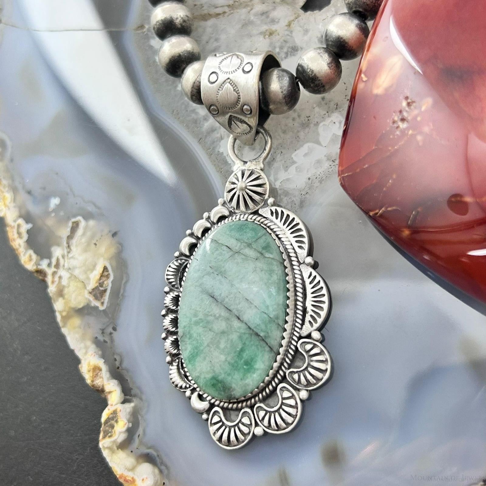 Sterling Silver Southwestern Style Oval Emerald Decorated Pendant For Women