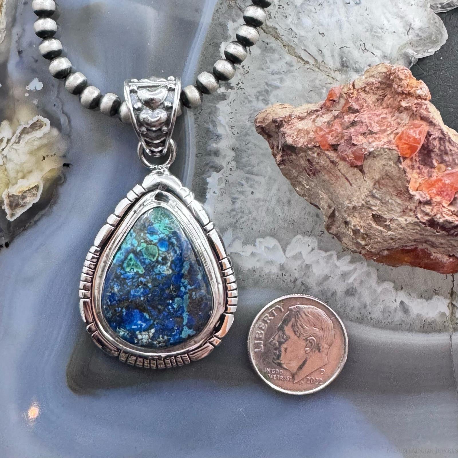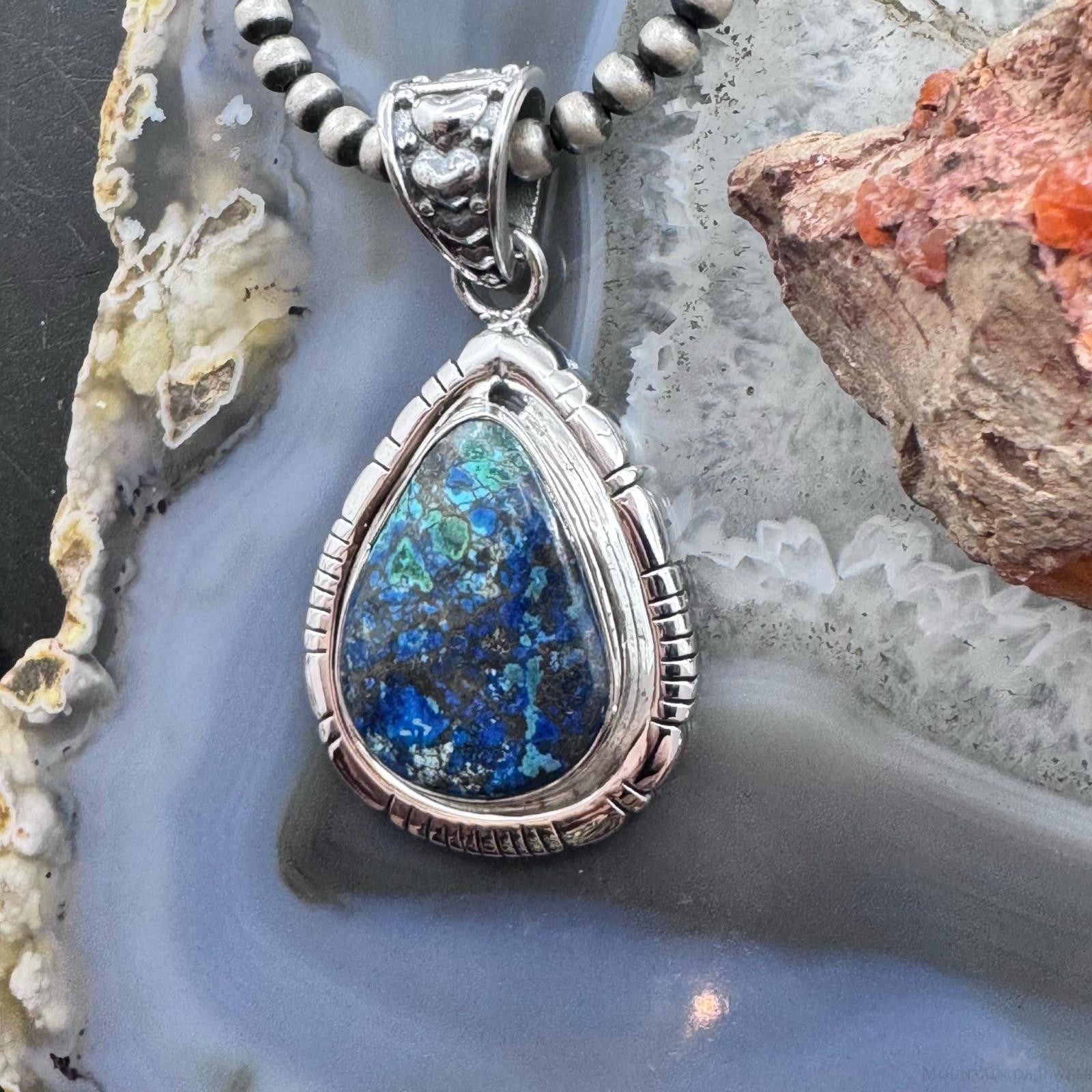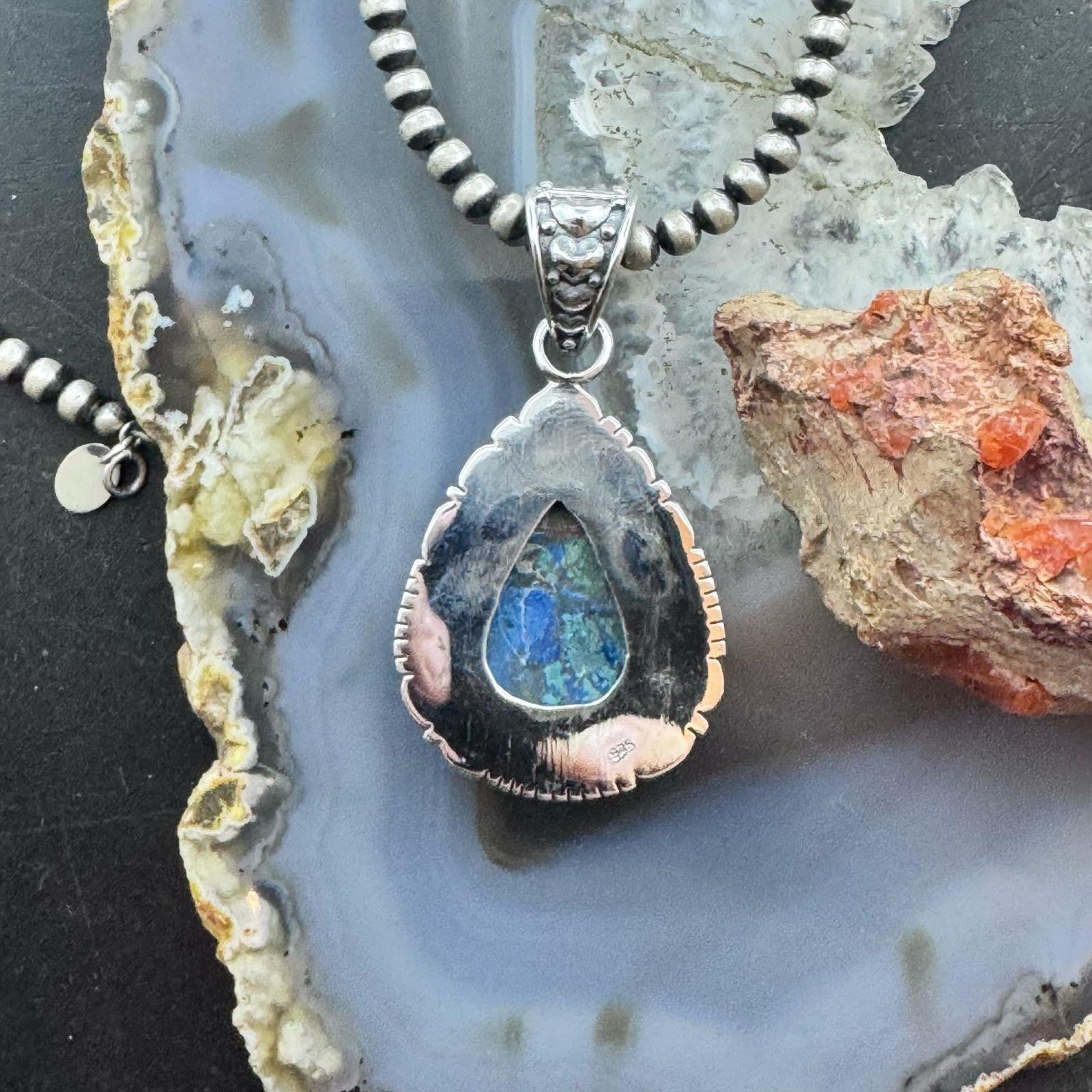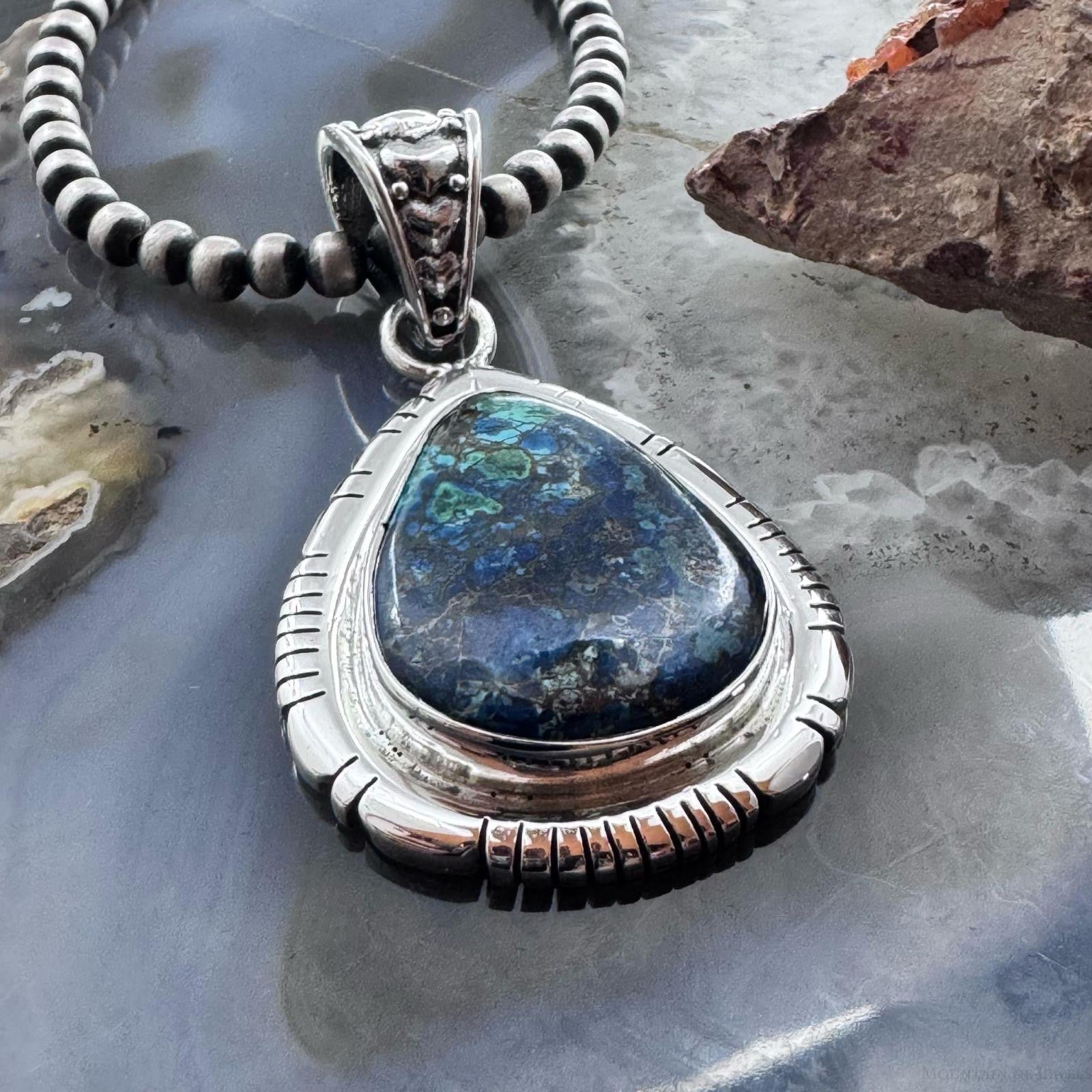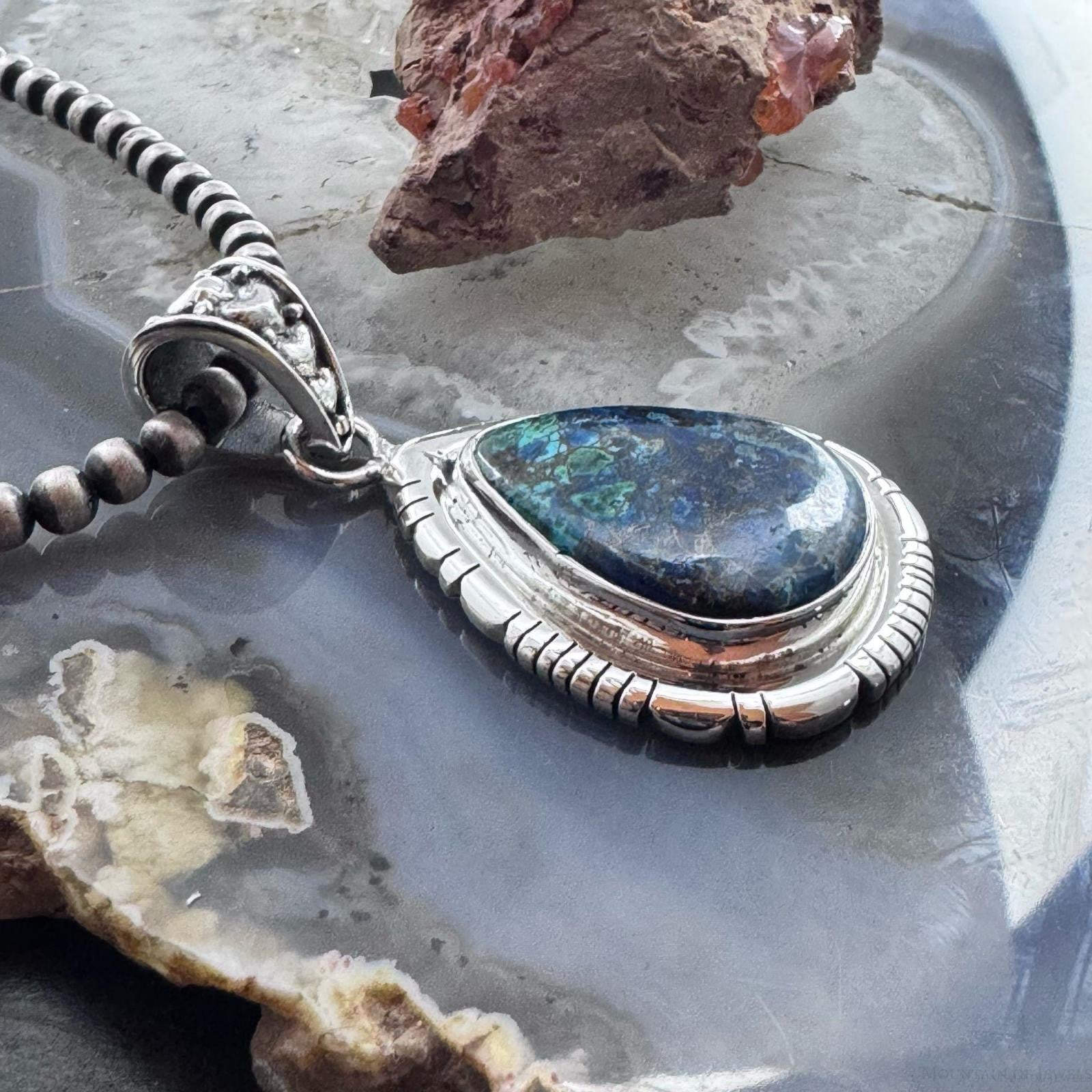 Sterling Silver Southwestern Style Teardrop Azurite Malachite Decorated Pendant