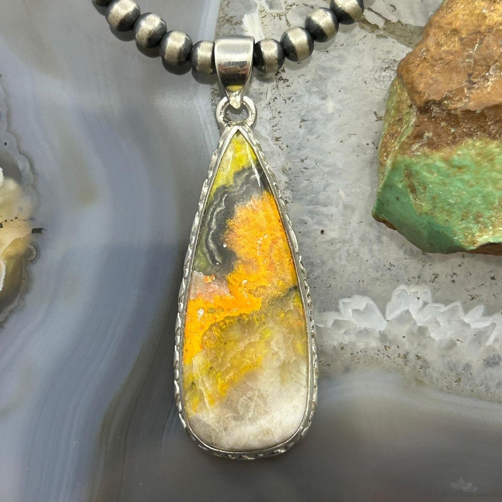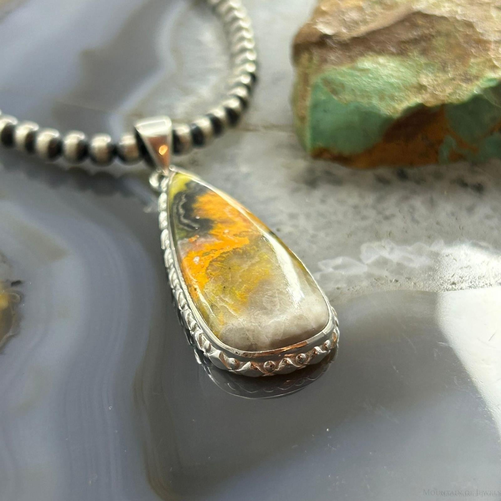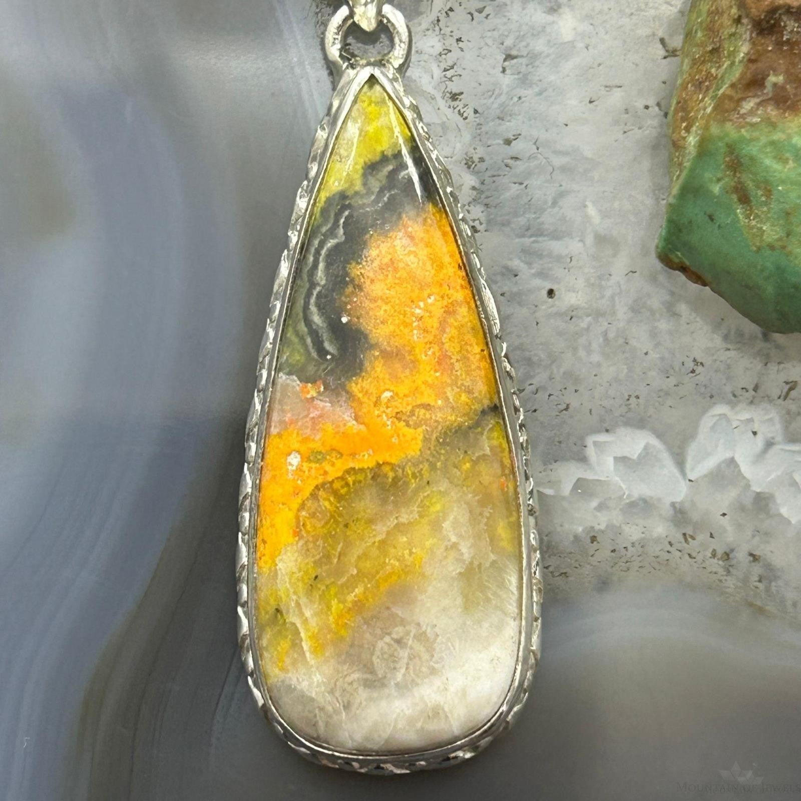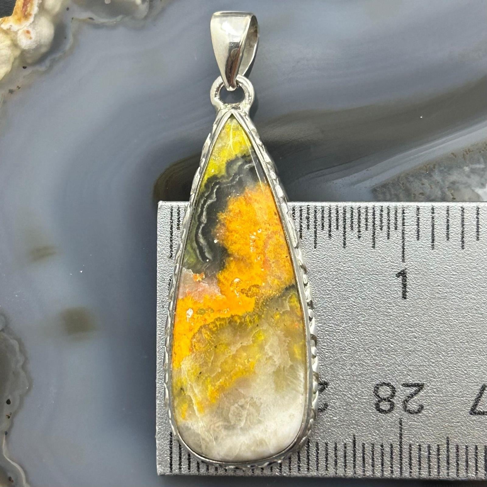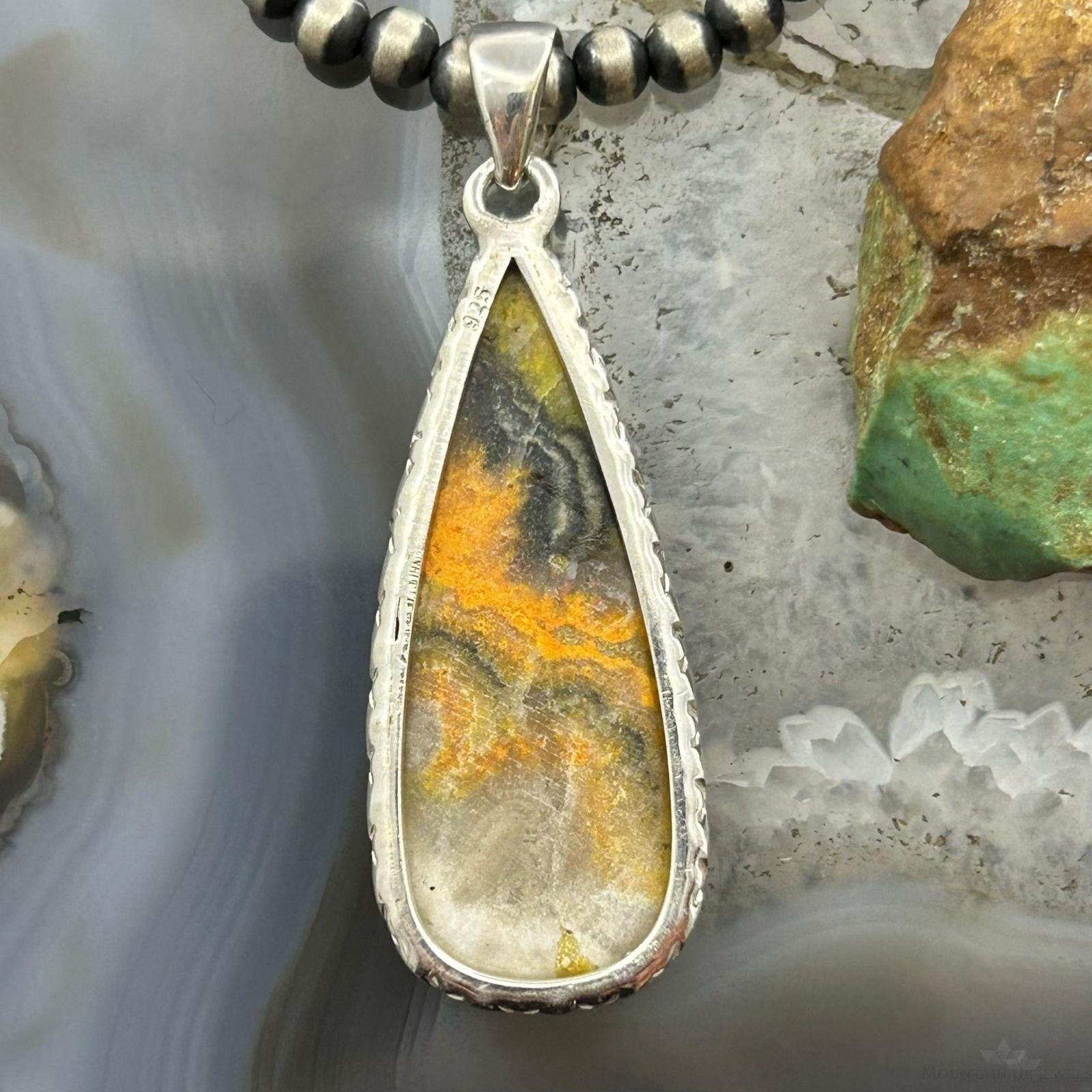 Vibrant Sterling Silver Southwestern Style Teardrop Bumblebee Jasper Decorated Pendant For Women.