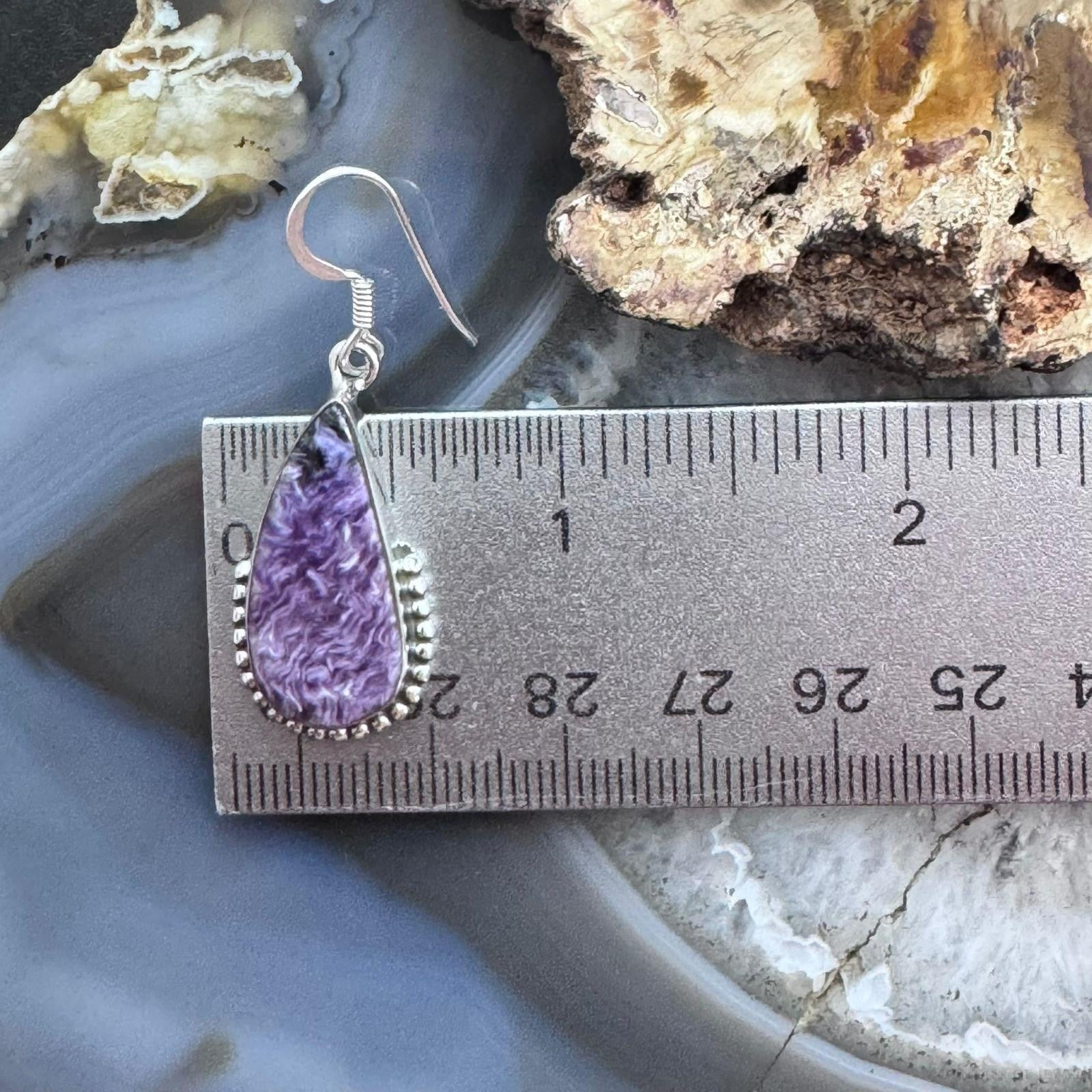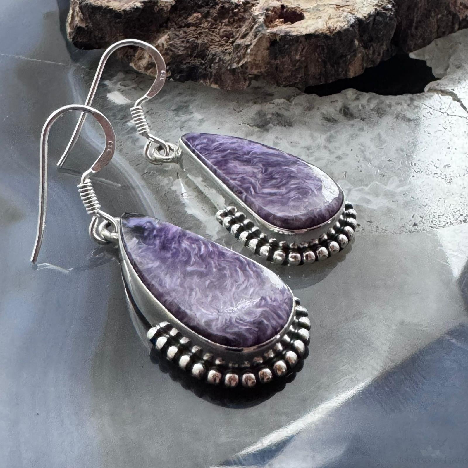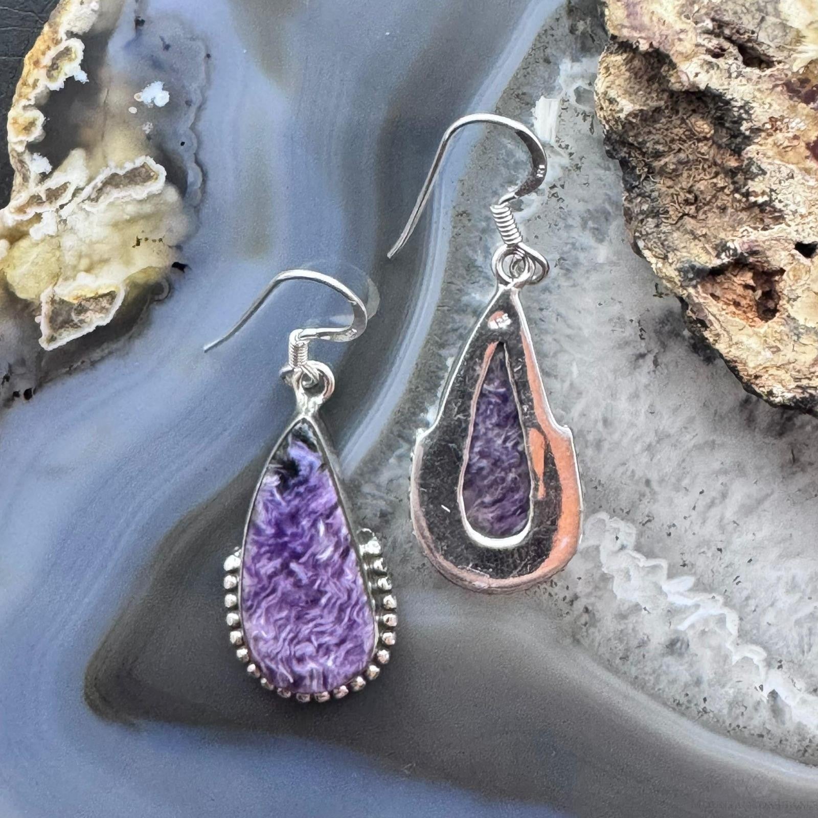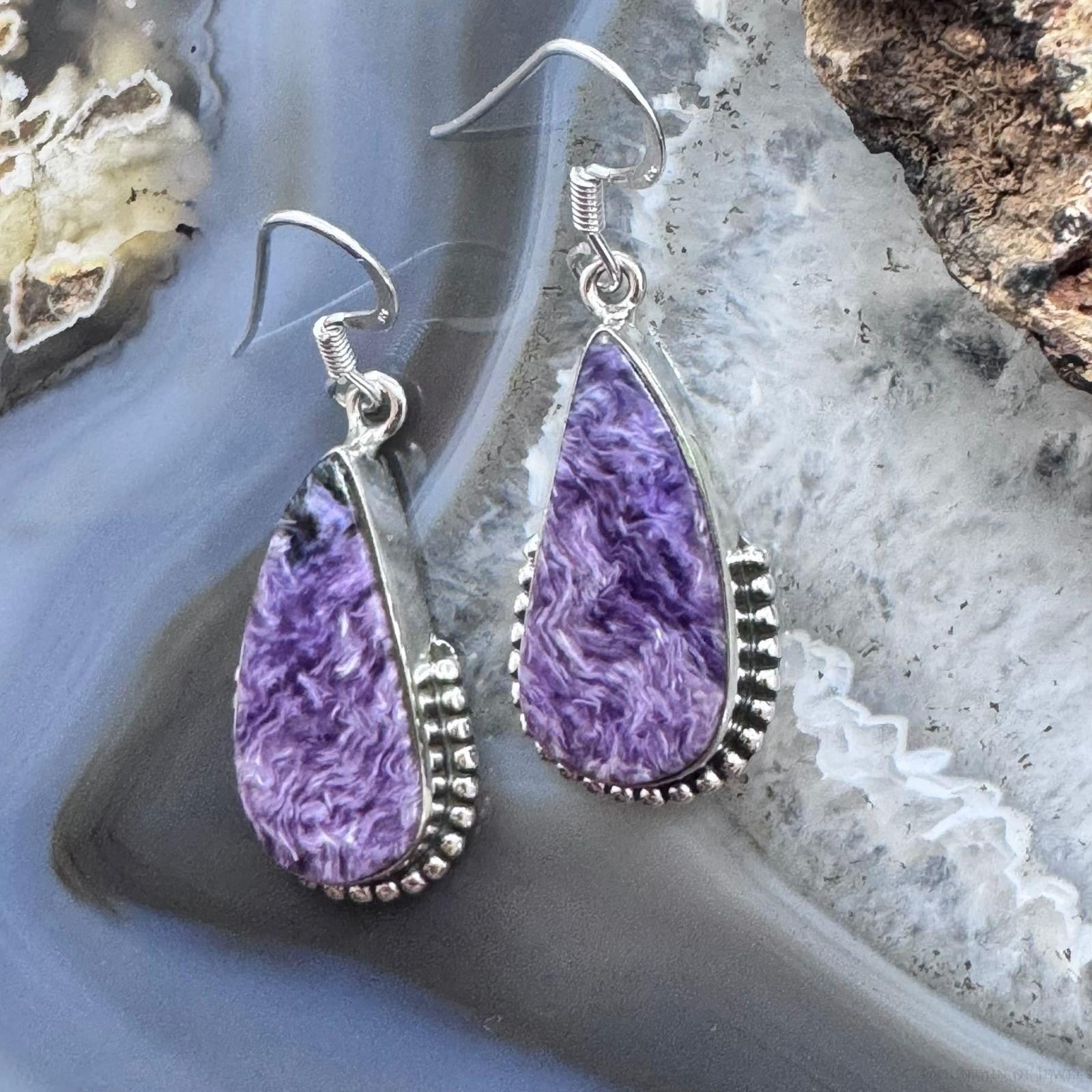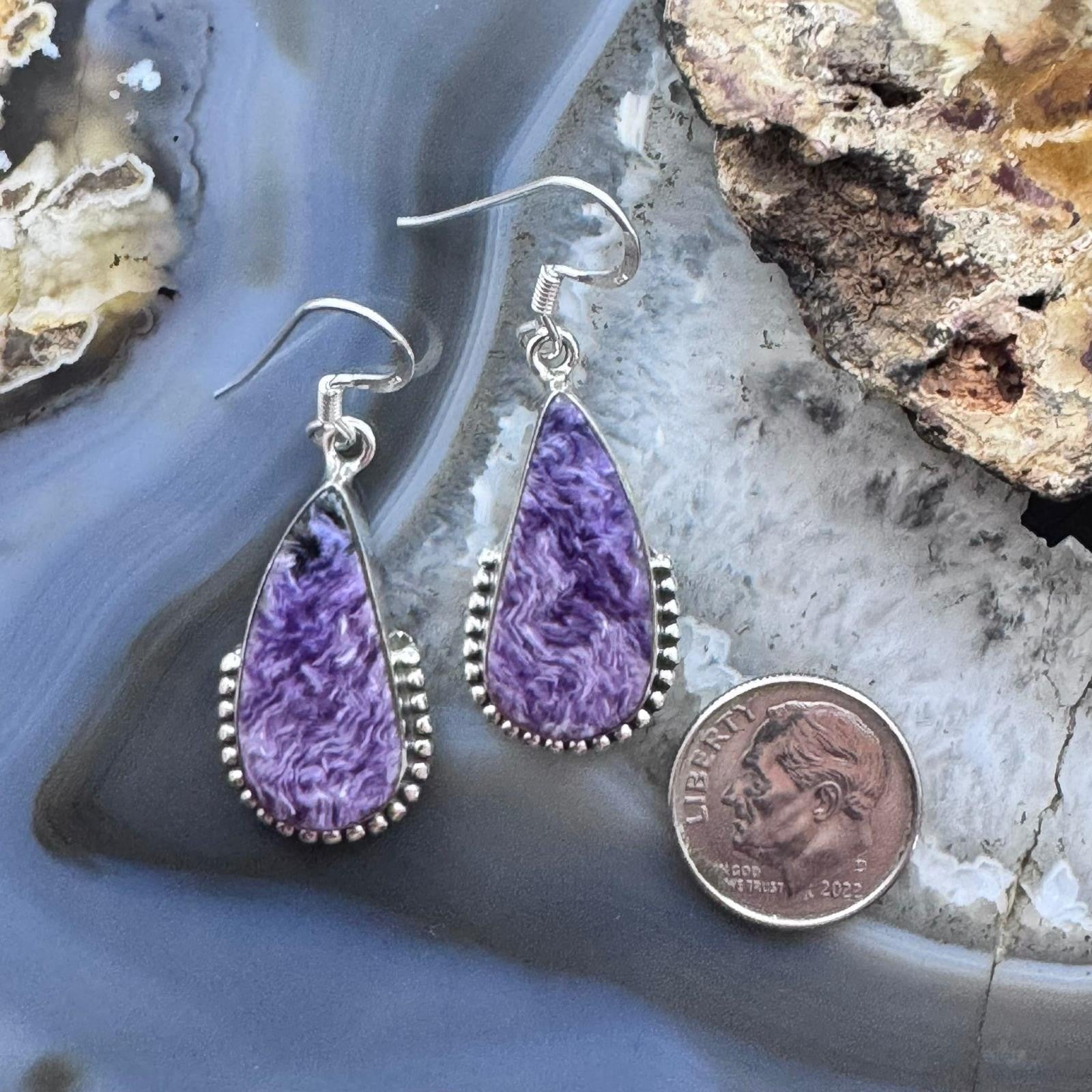 Sterling Silver Southwestern Style Teardrop Charoite Decorated Dangle Earrings For Women