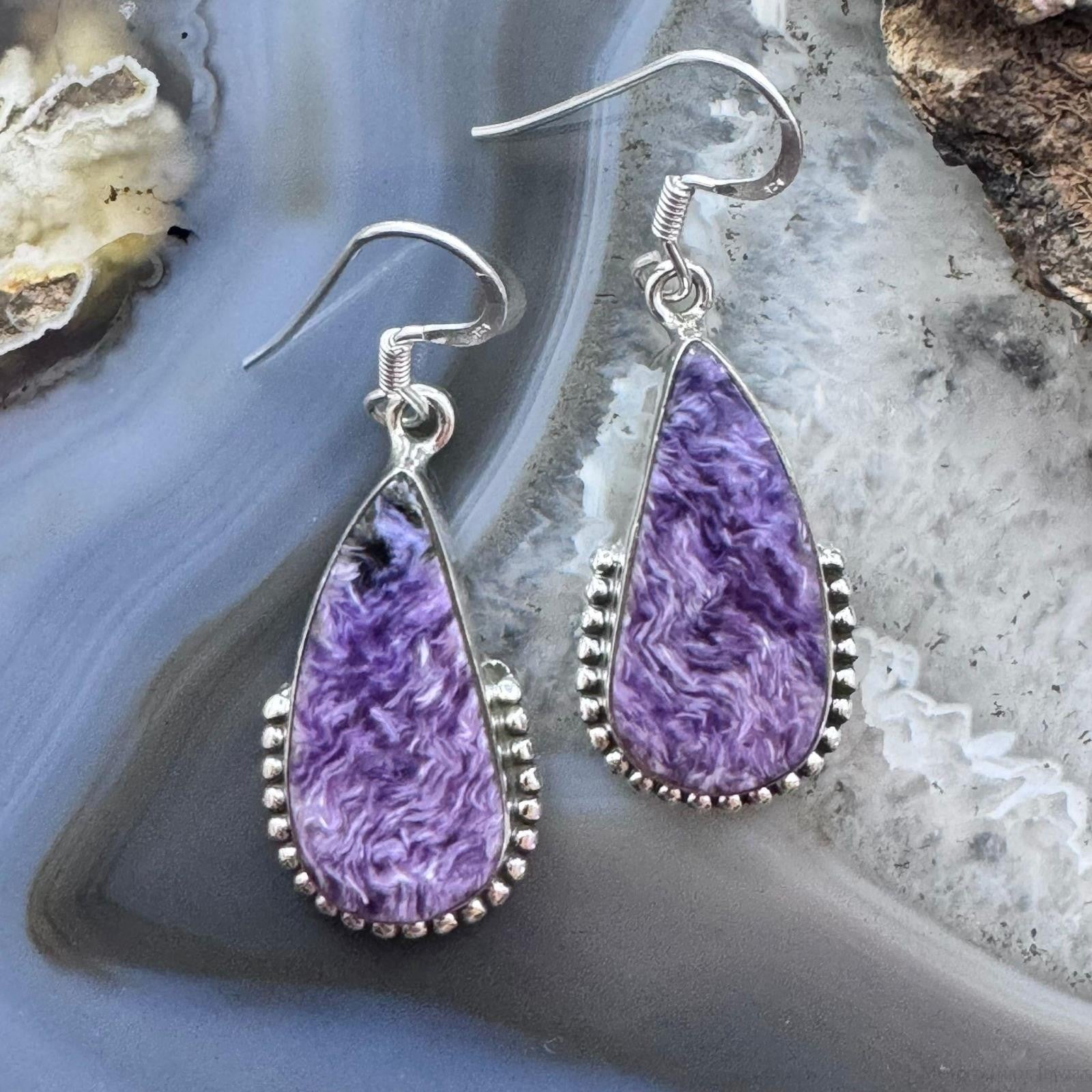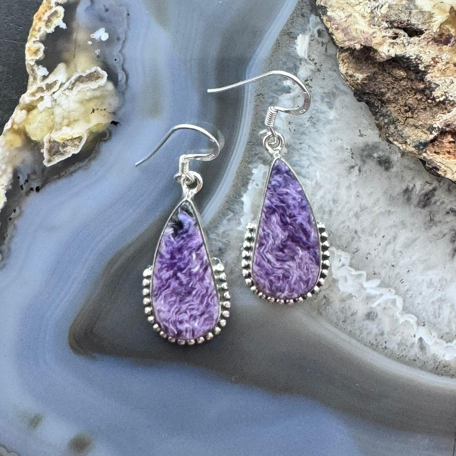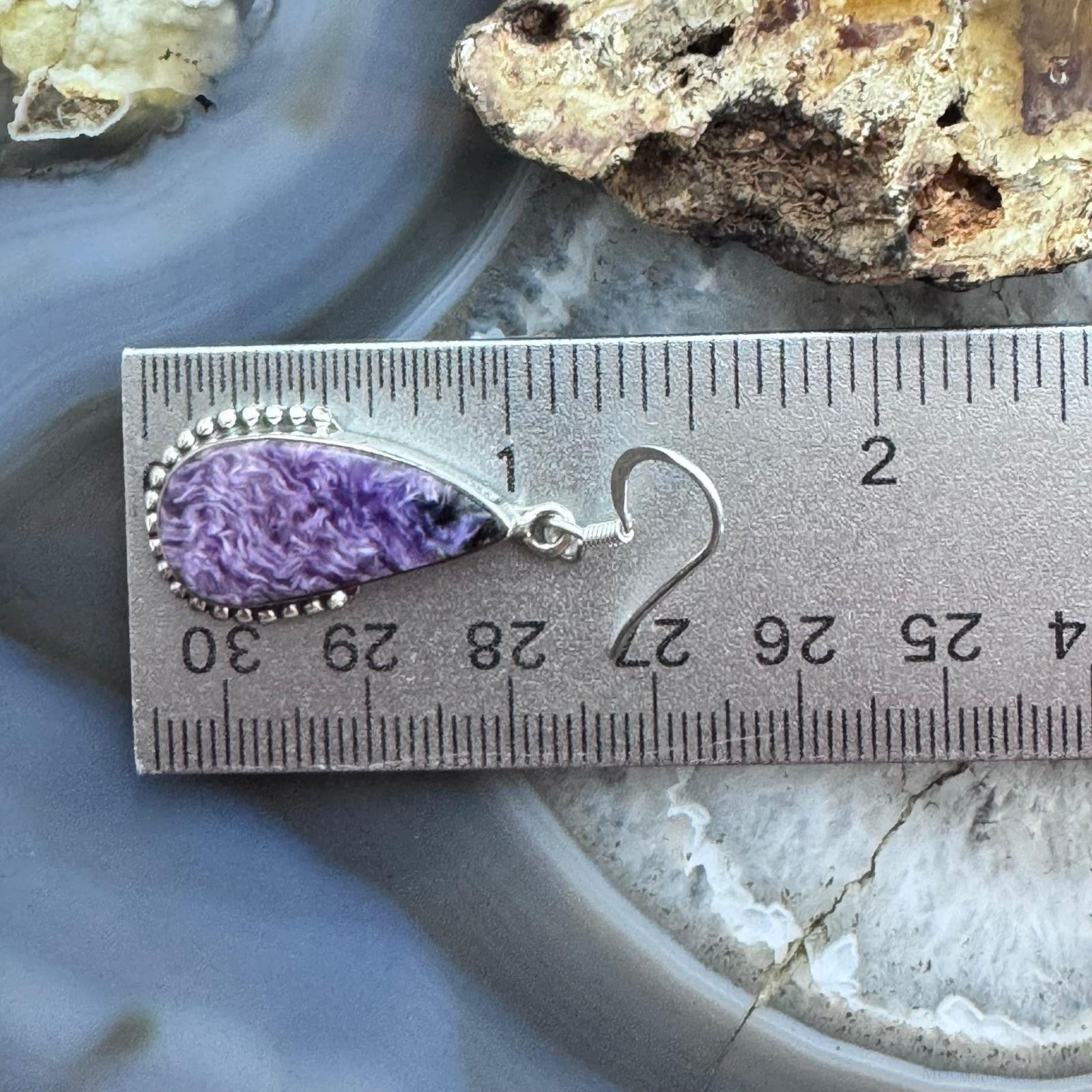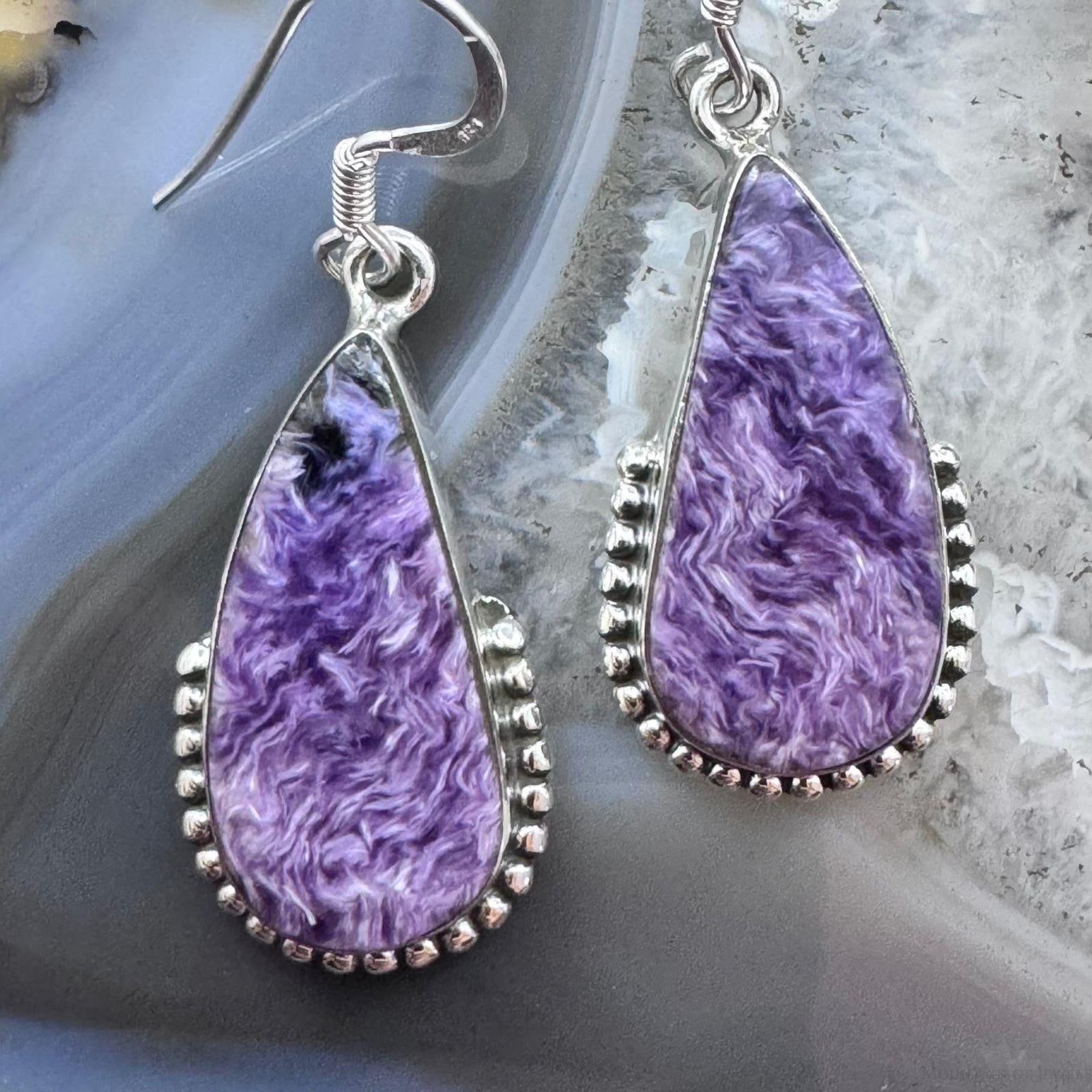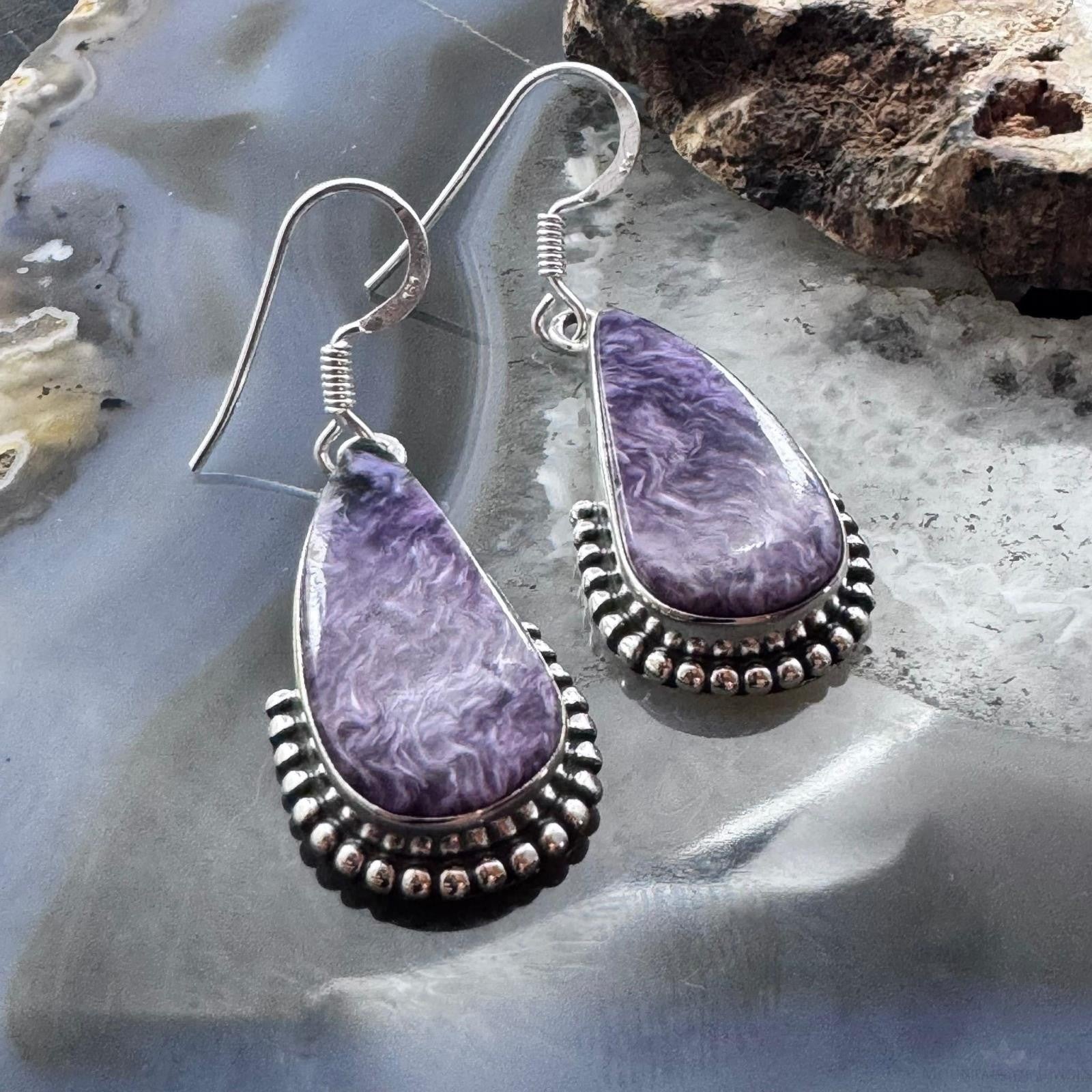 Sterling Silver Southwestern Style Teardrop Charoite Decorated Dangle Earrings For Women