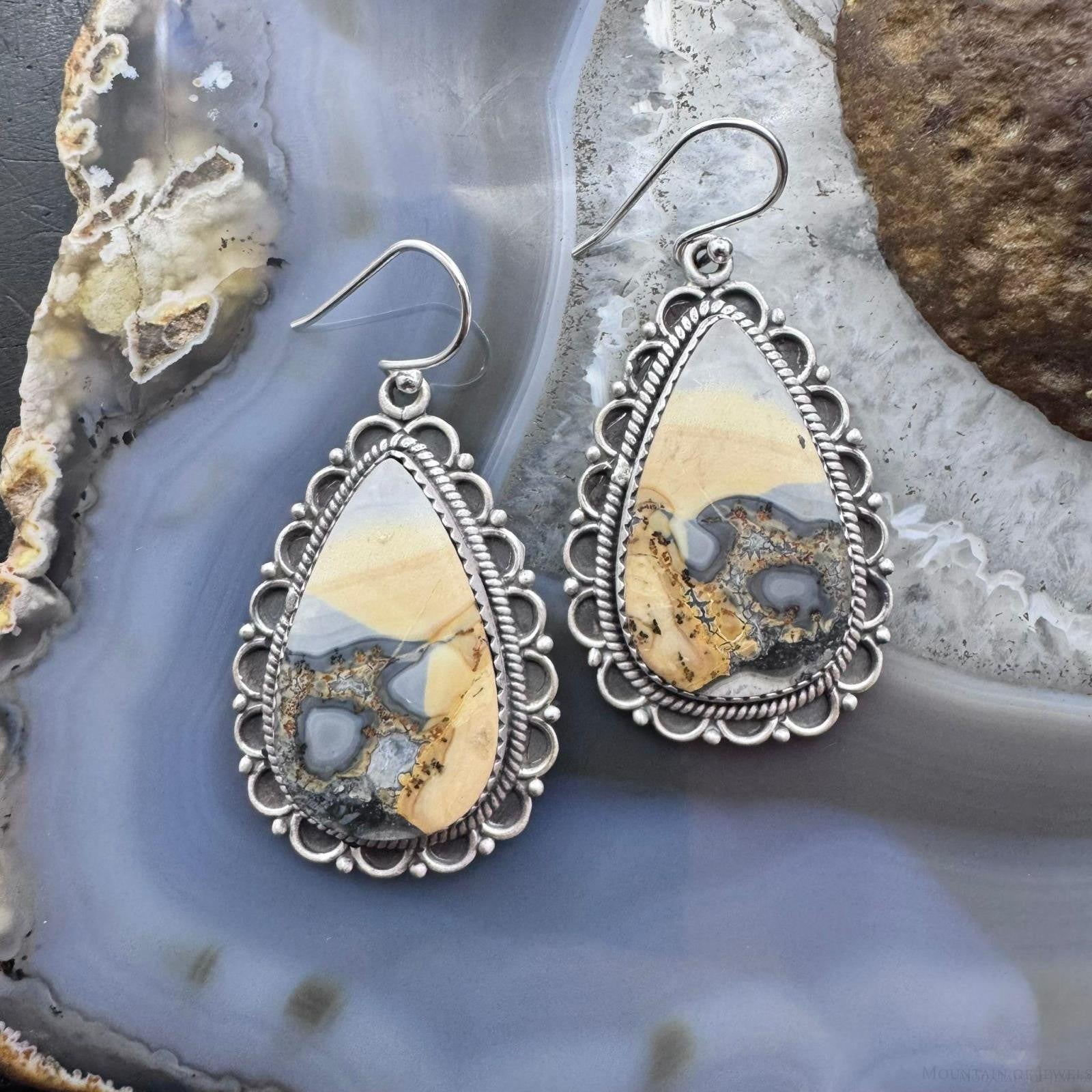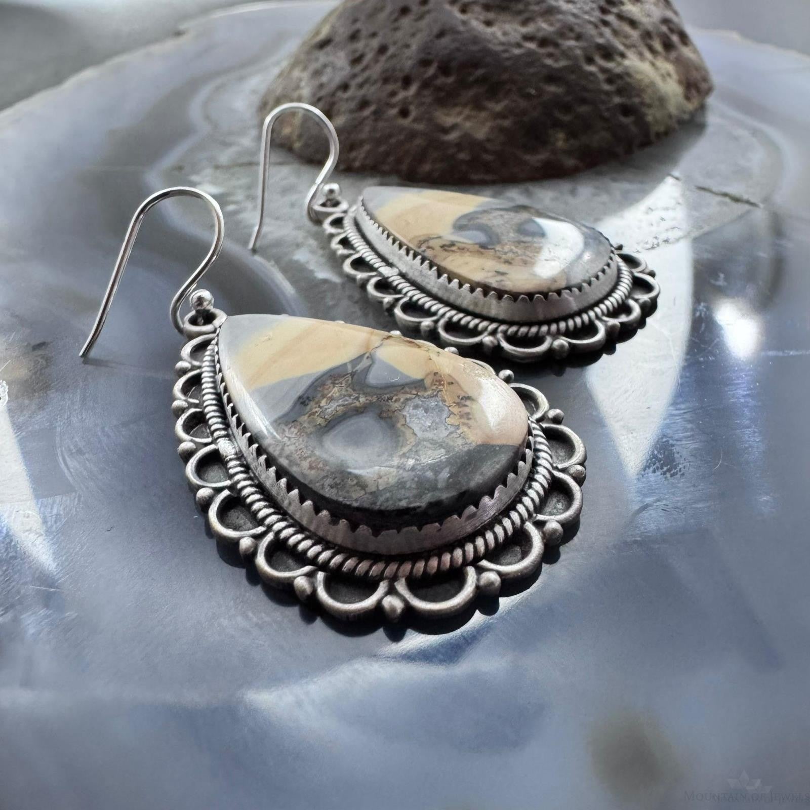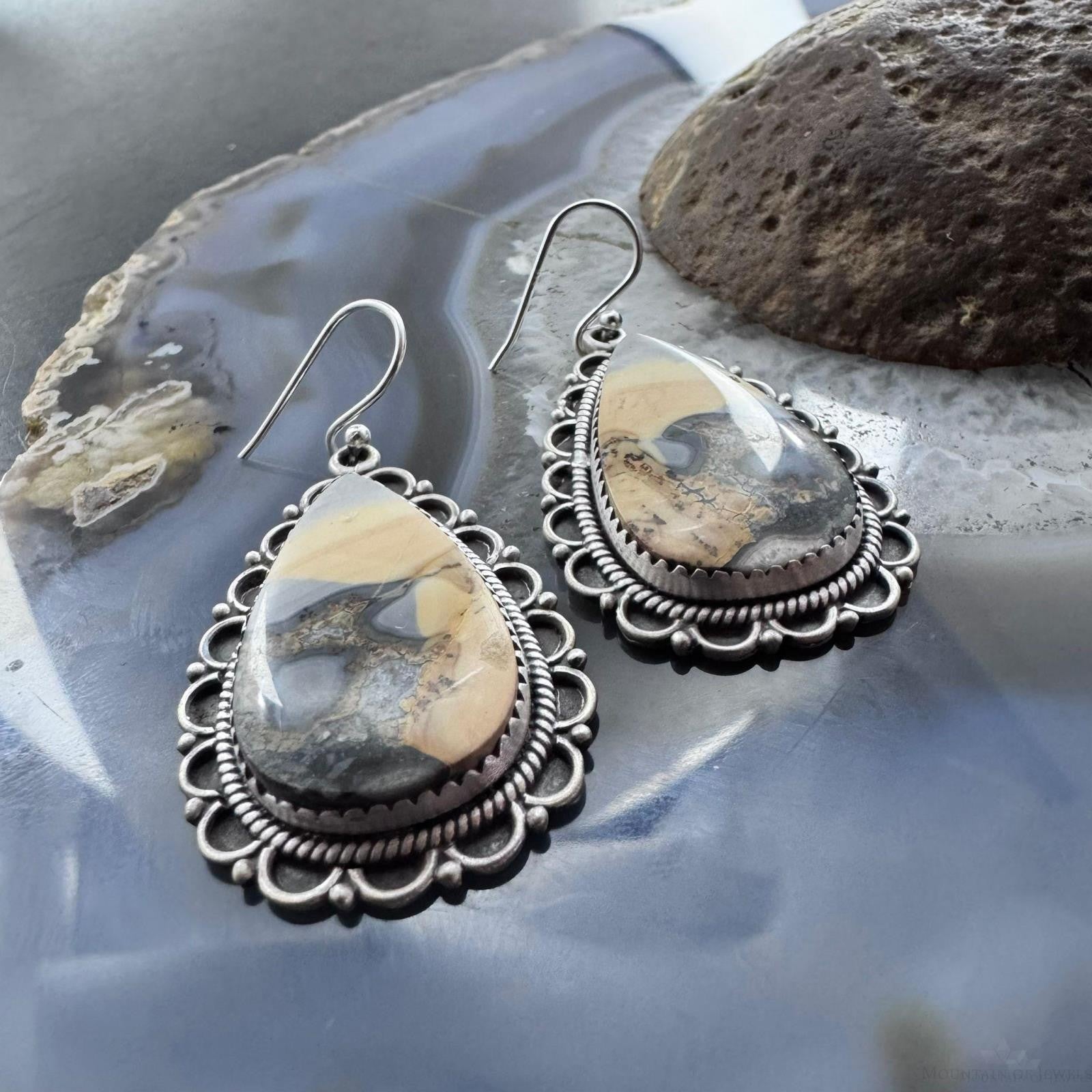 Sterling Silver Southwestern Style Teardrop Maligano Jasper Dangle Earrings For Women