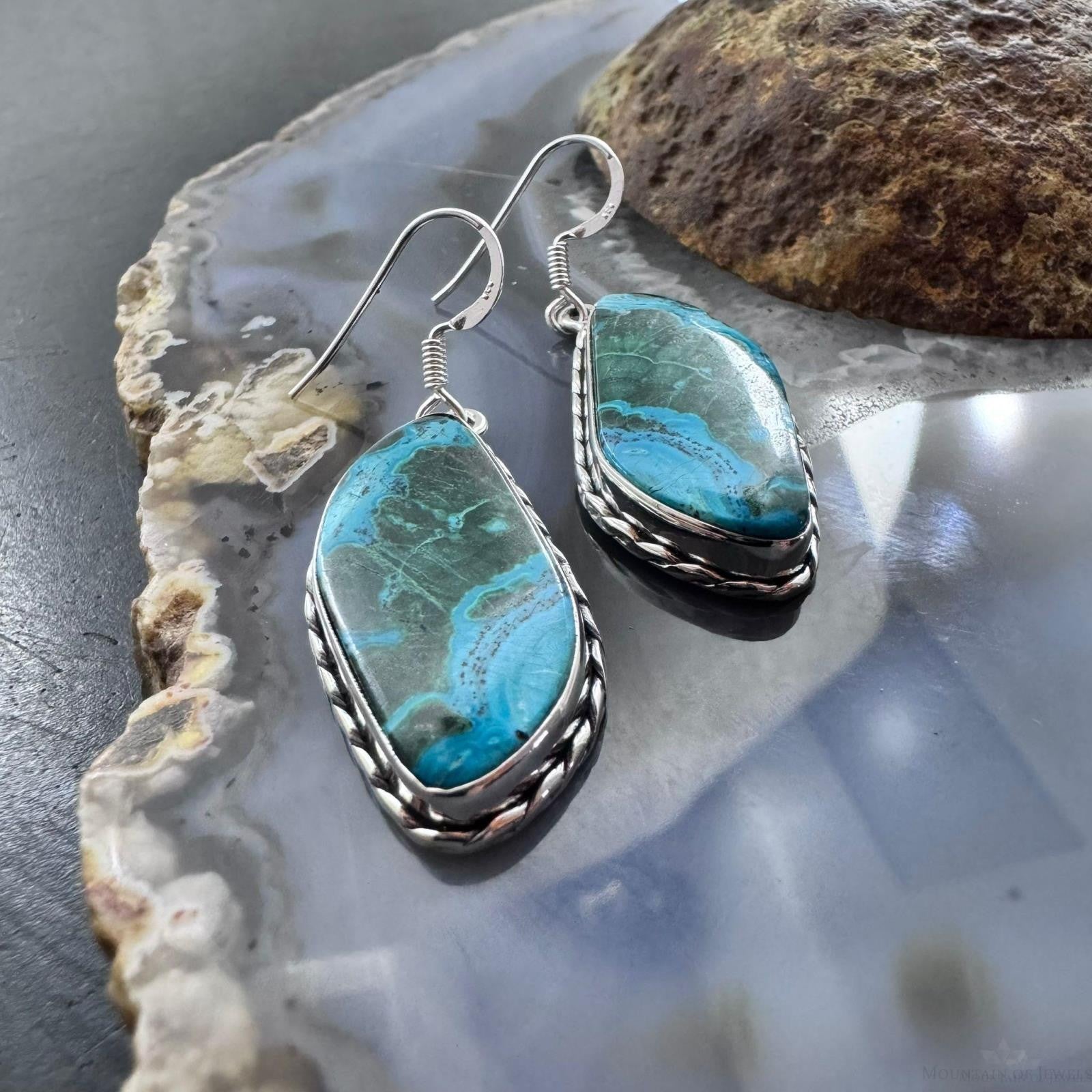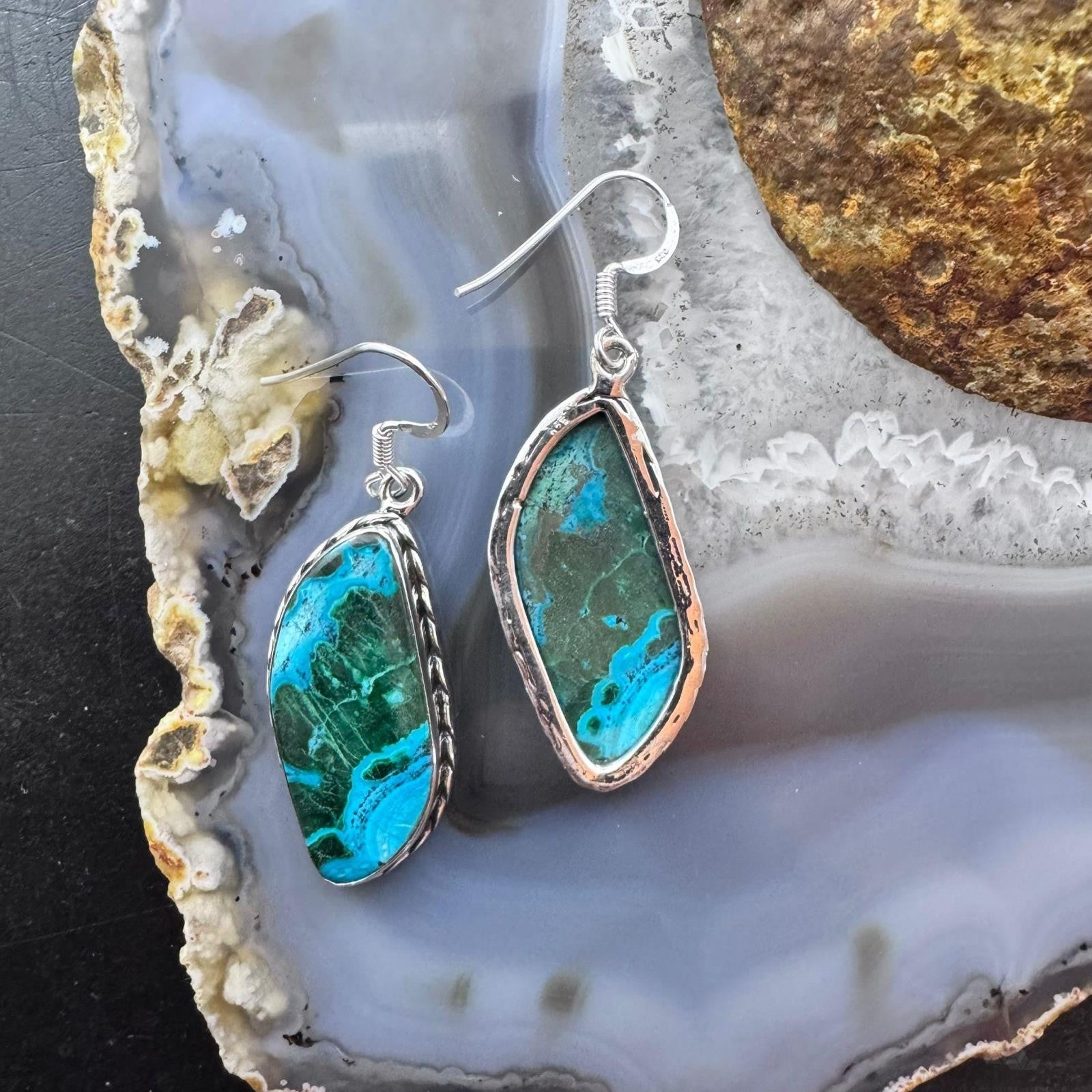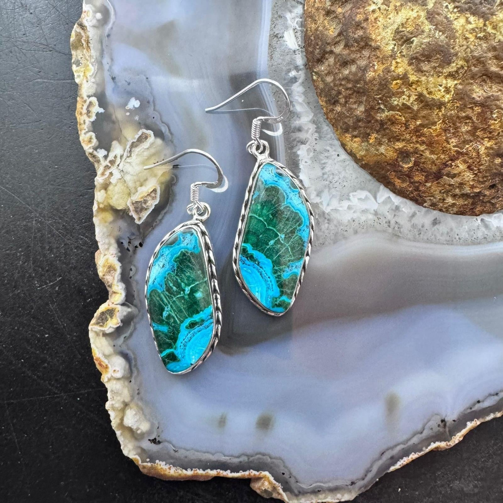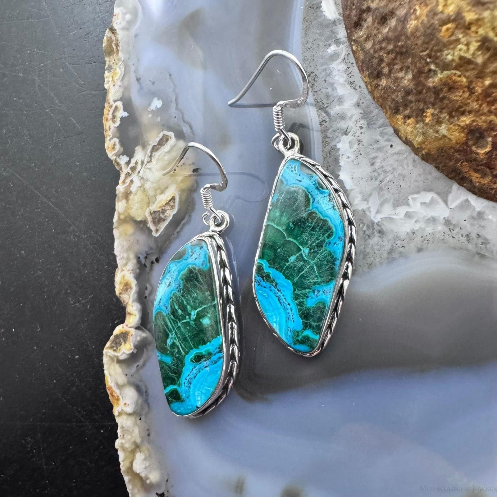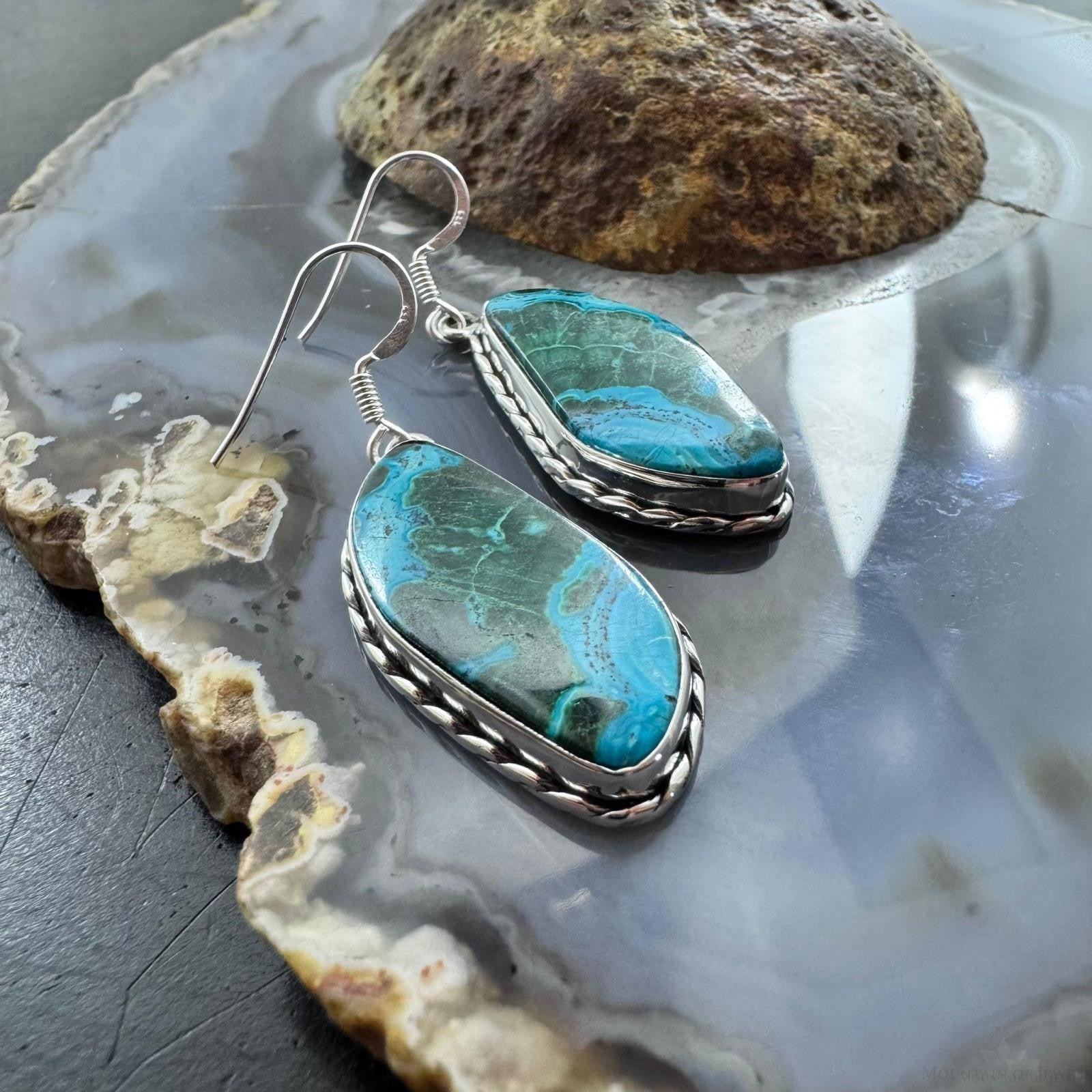 Sterling Silver Southwestern Style Tilde Malachite Azurite Dangle Earrings For Women