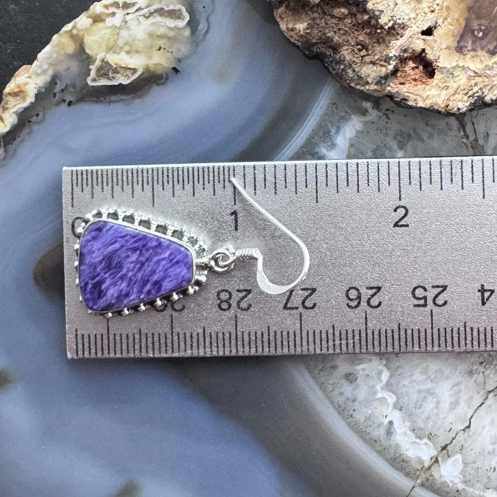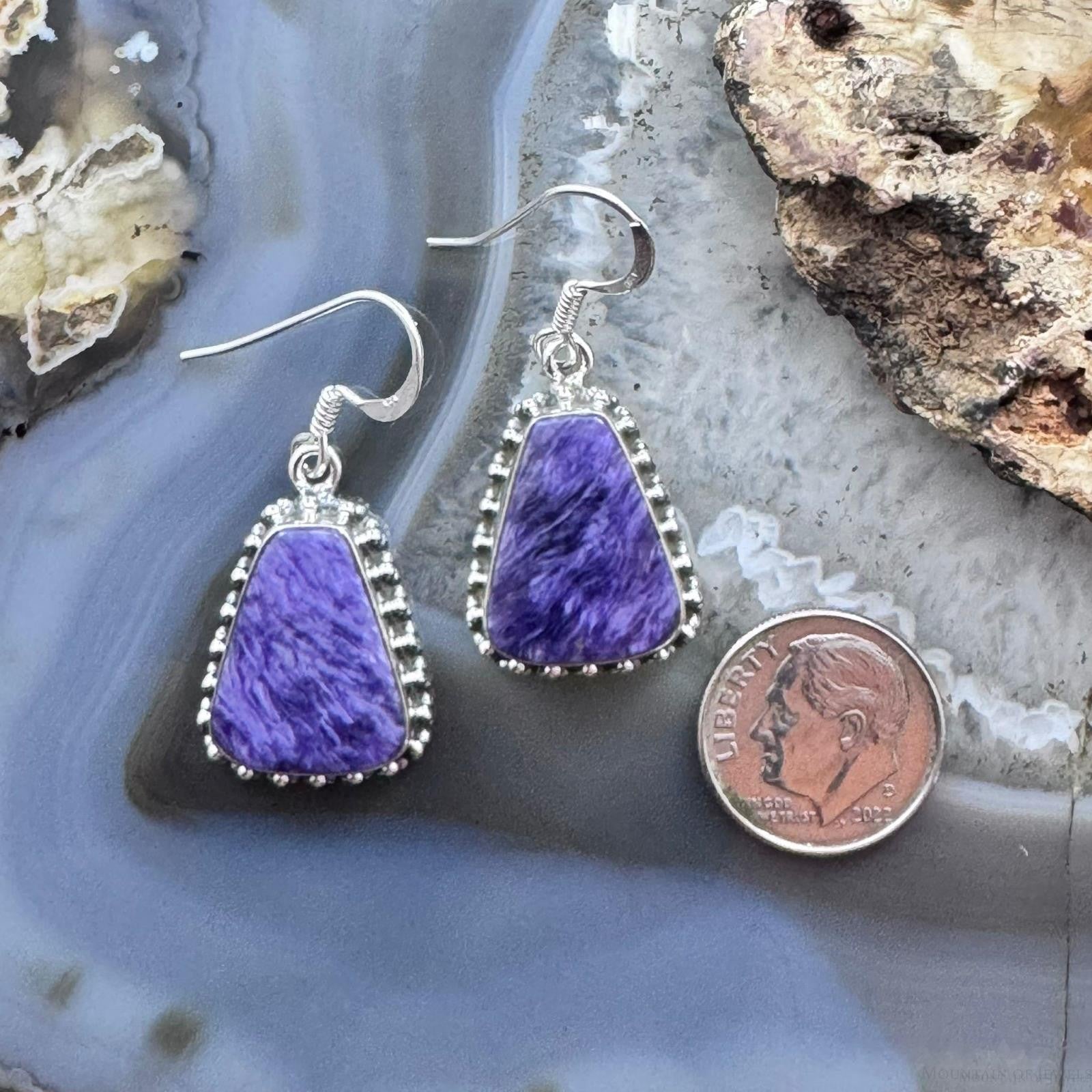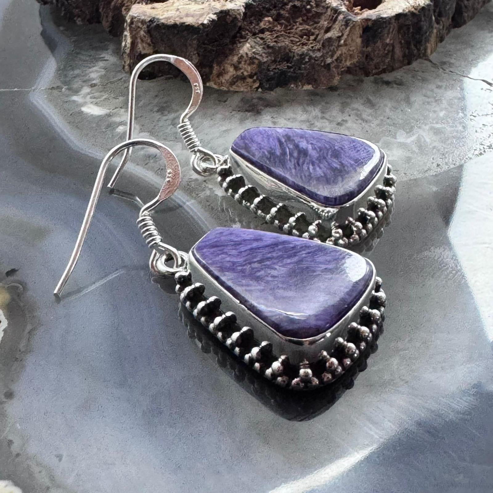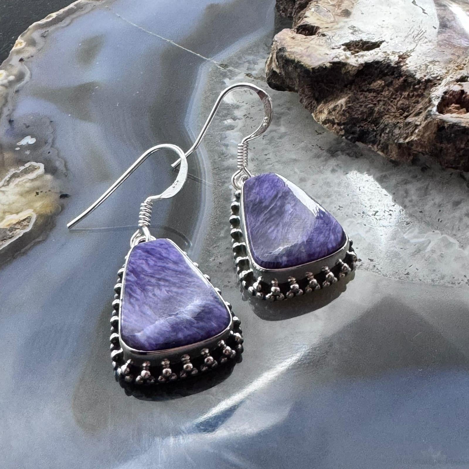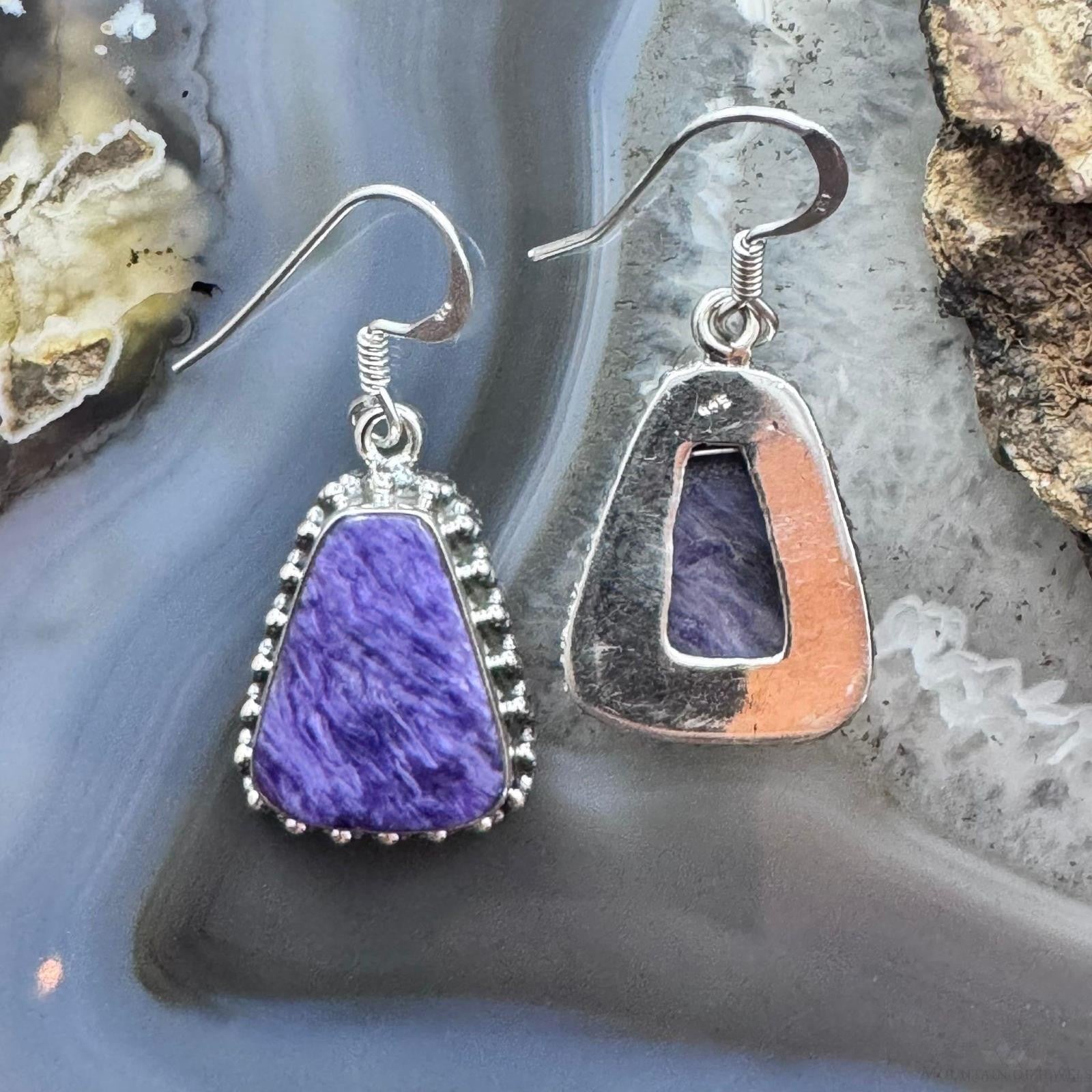 Sterling Silver Southwestern Style Trapezoid Charoite Decorated Dangle Earrings For Women
