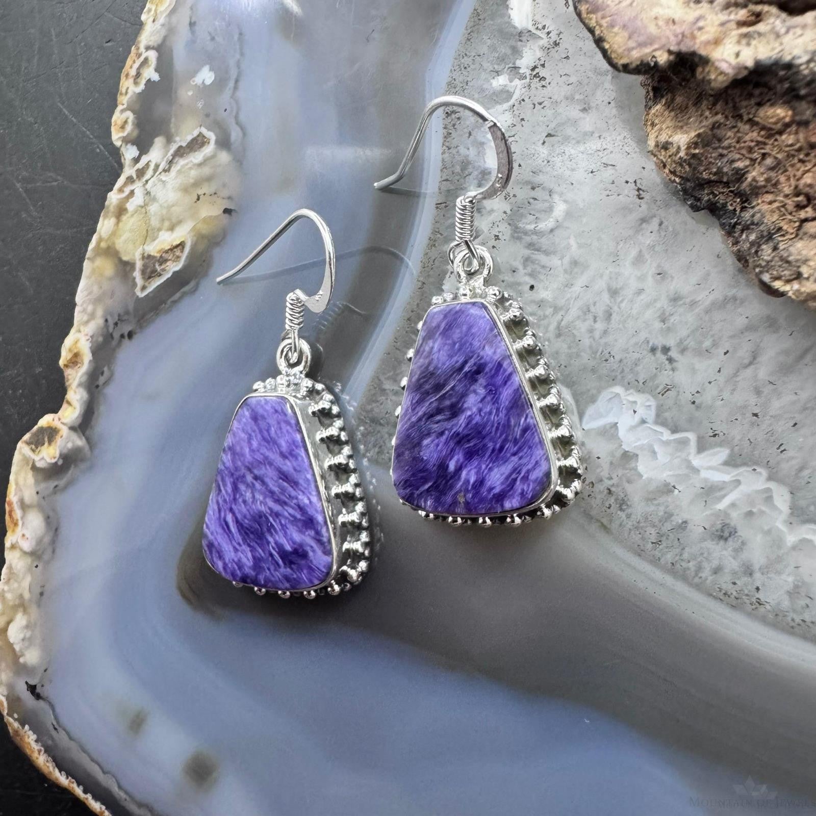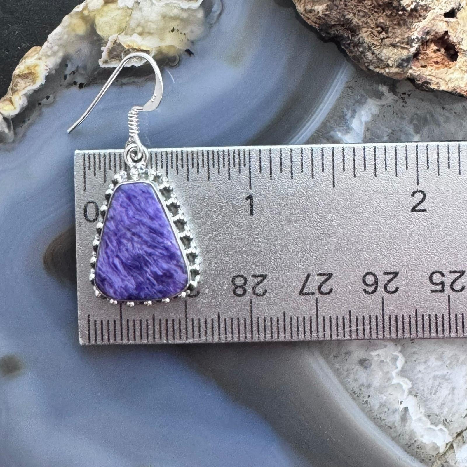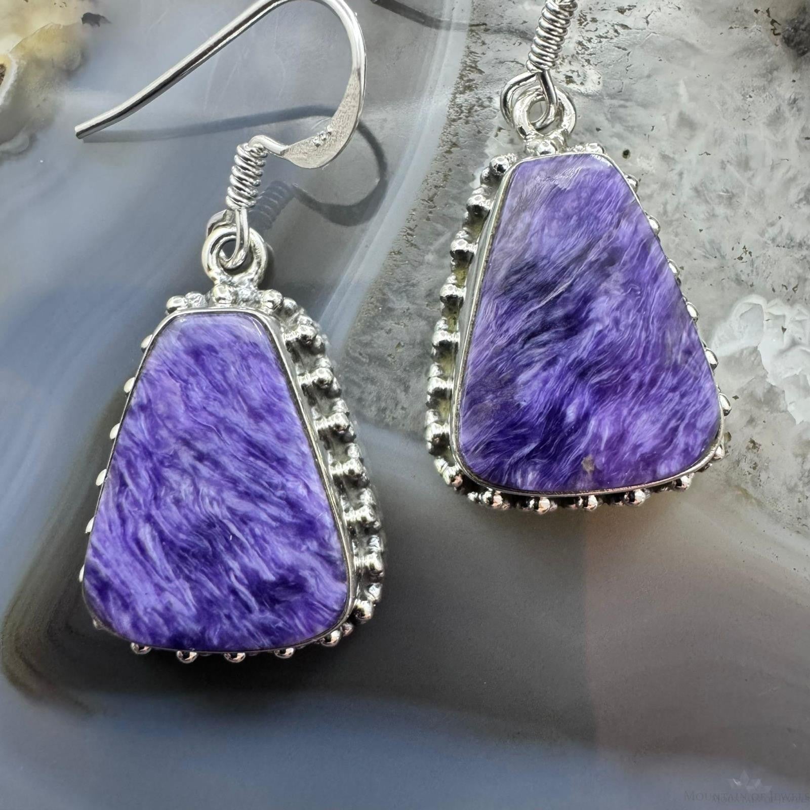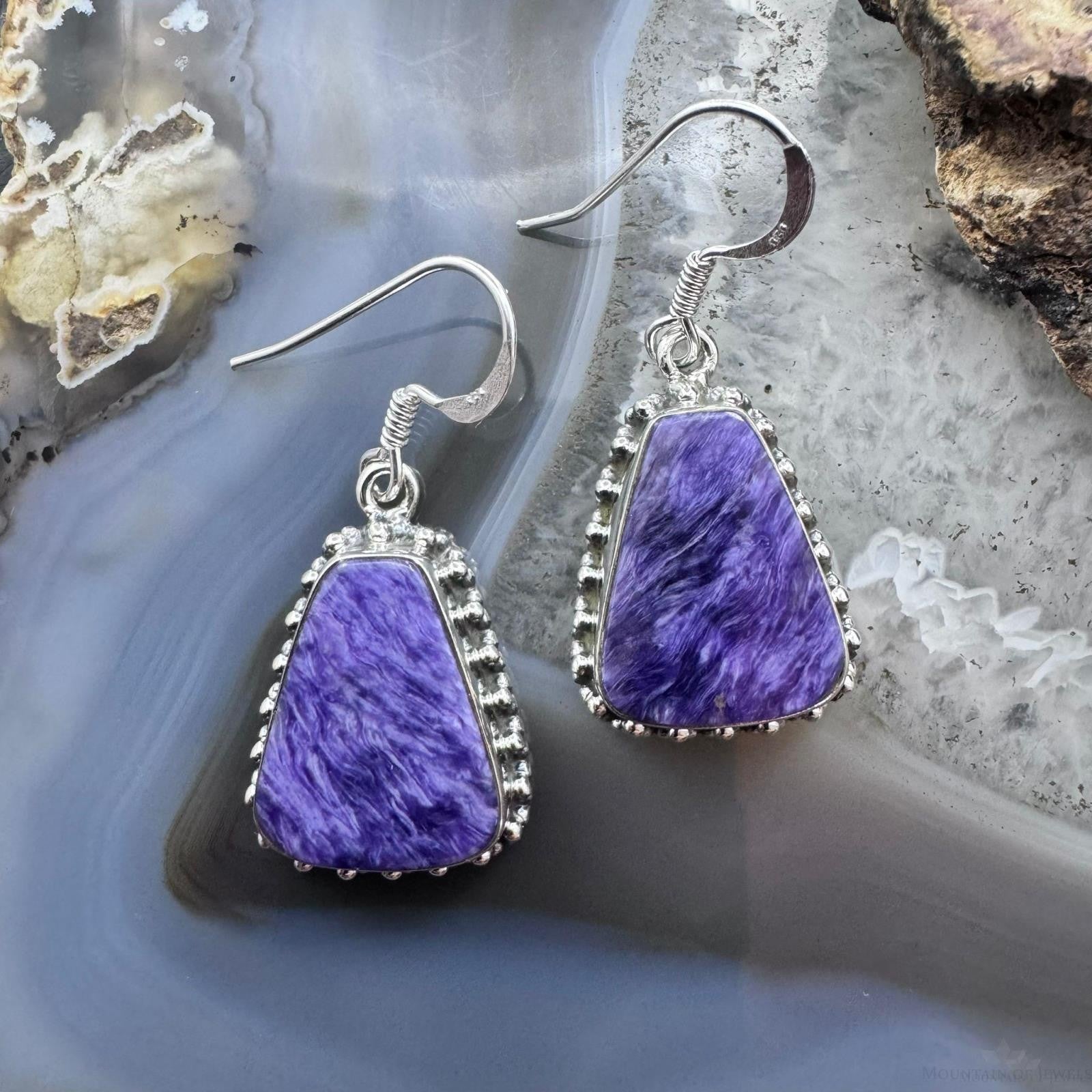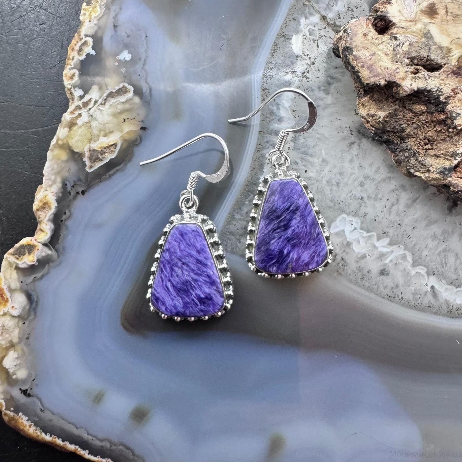 Sterling Silver Southwestern Style Trapezoid Charoite Decorated Dangle Earrings For Women