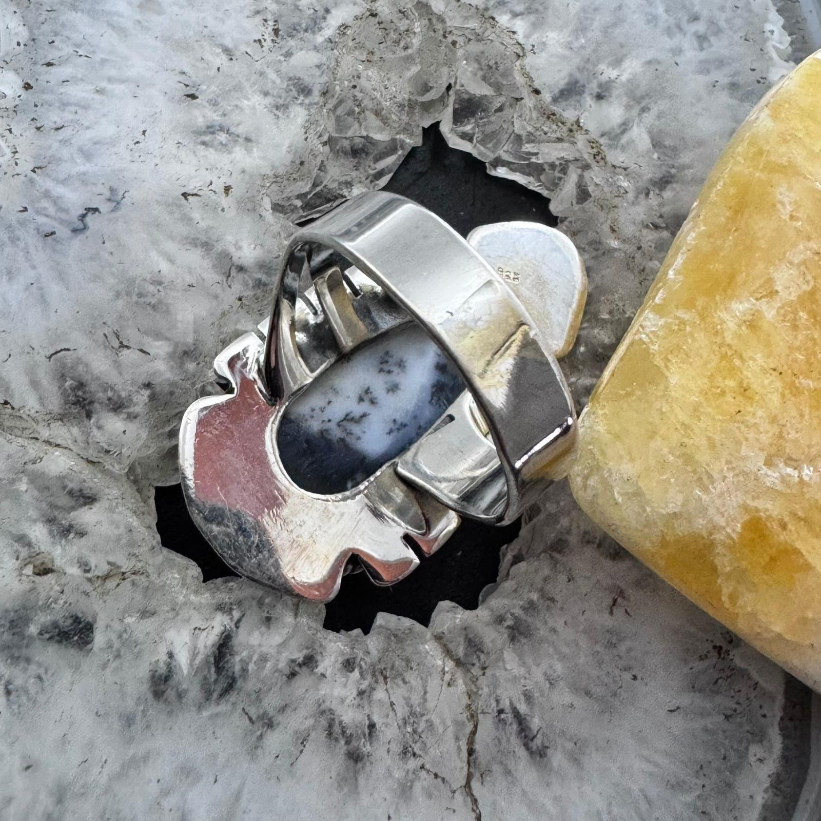 Sterling Silver Southwestern Style Elongated Teardrop Dendrite Agate Decorated Ring For Women.