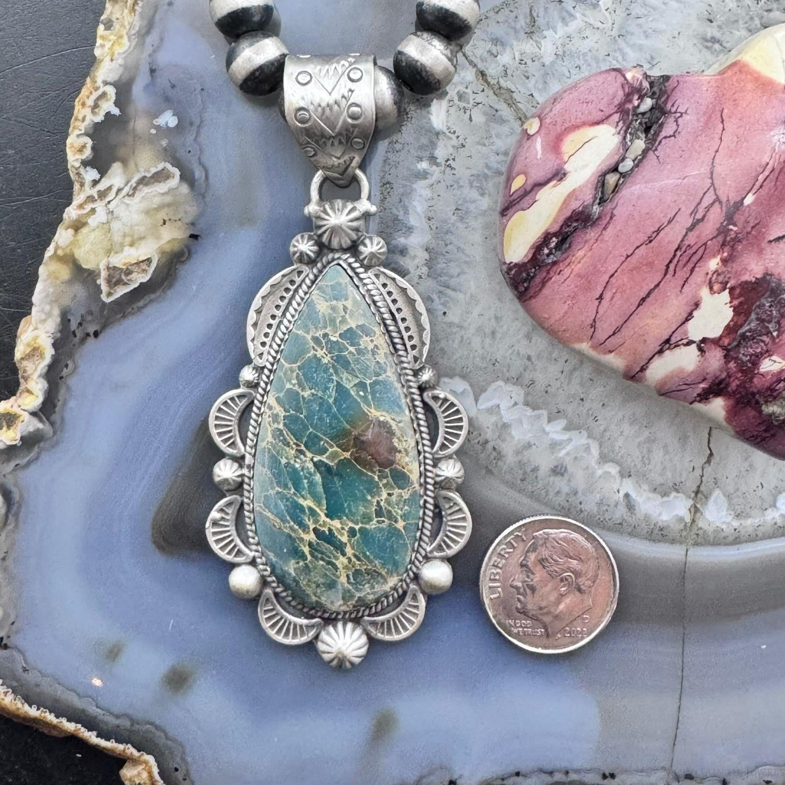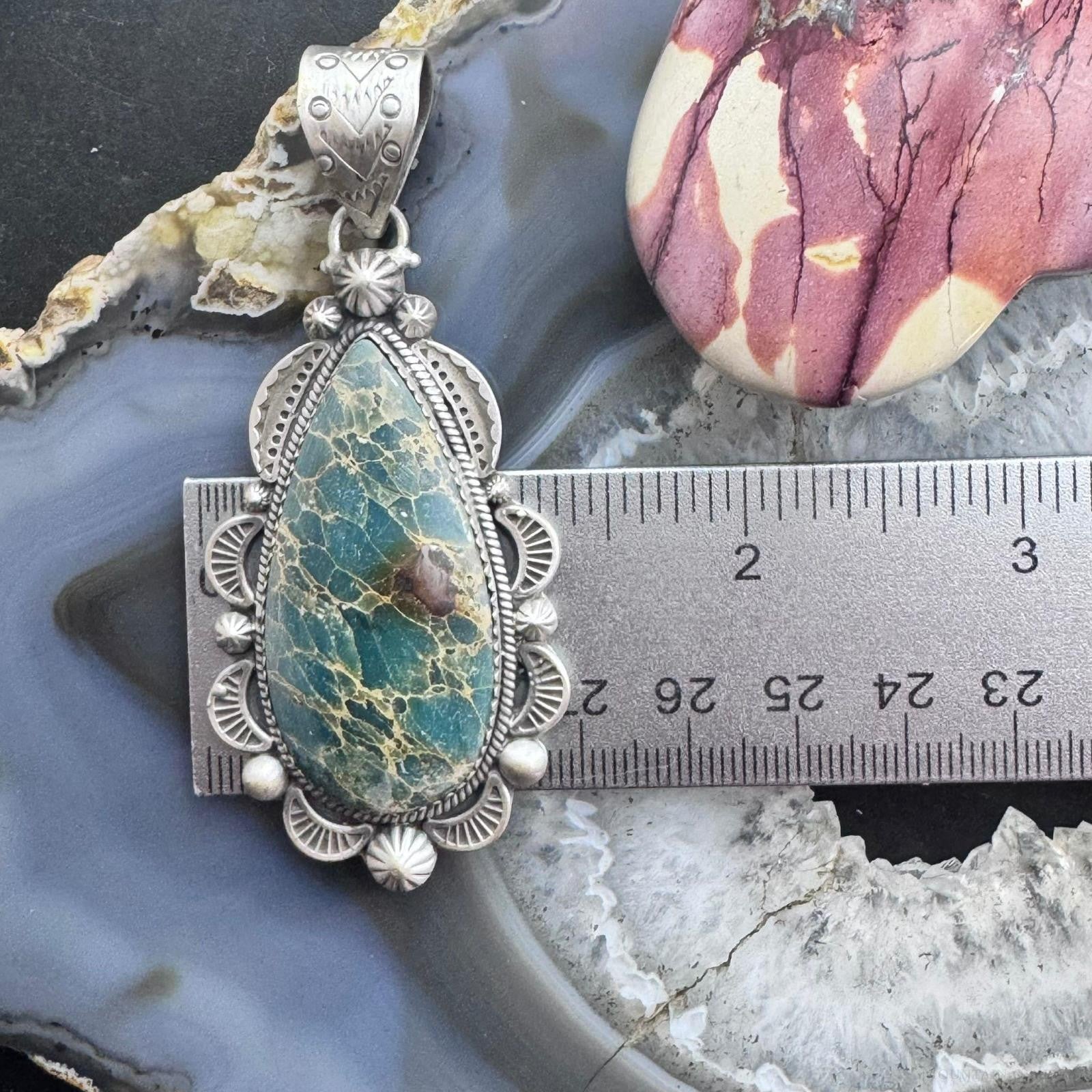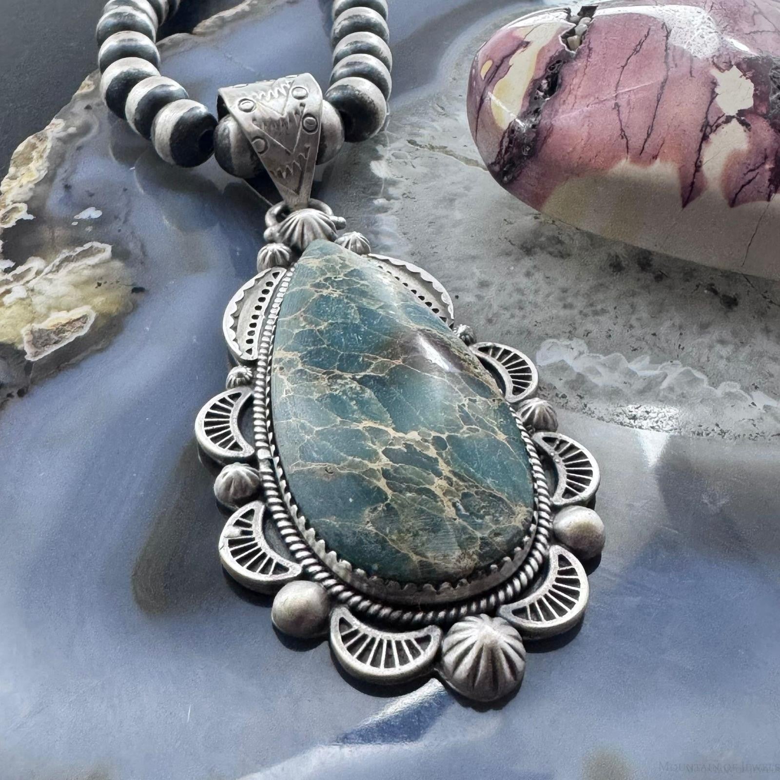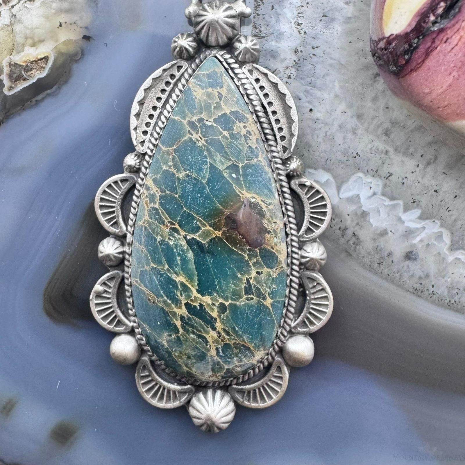 Sterling Silver Southwestern Style Elongated Teardrop Sediment Jasper Flower Decorated Pendant For Women.