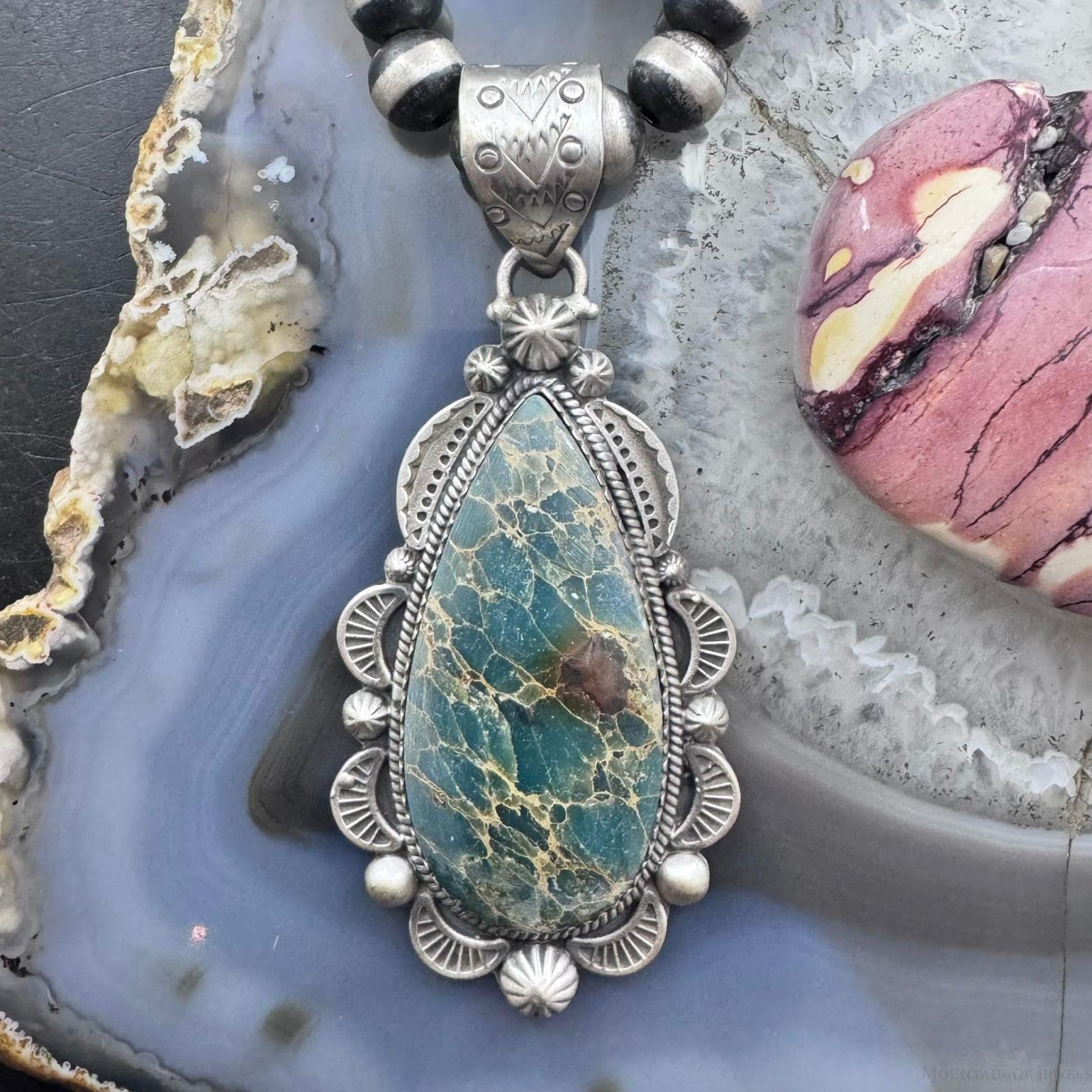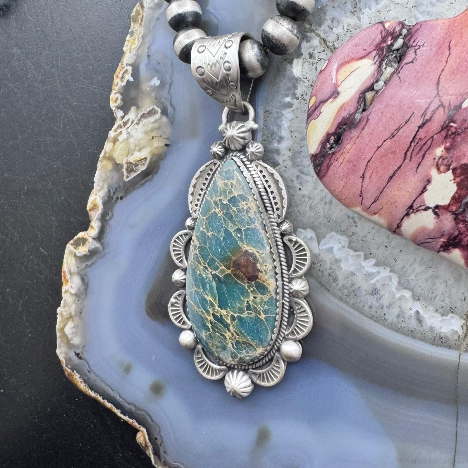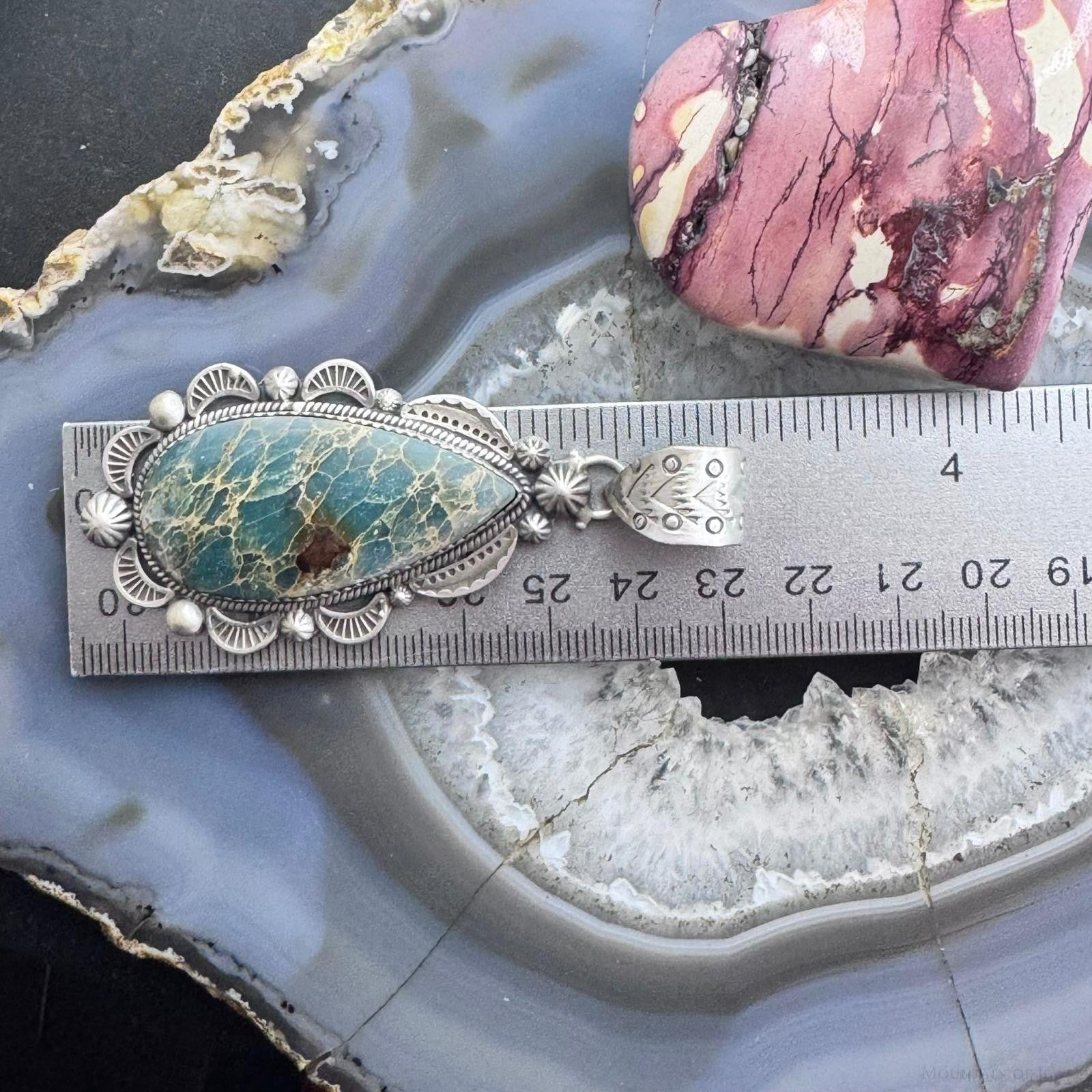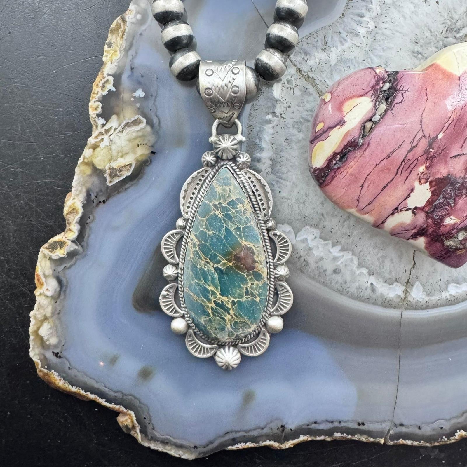 Sterling Silver Southwestern Style Elongated Teardrop Sediment Jasper Flower Decorated Pendant For Women.