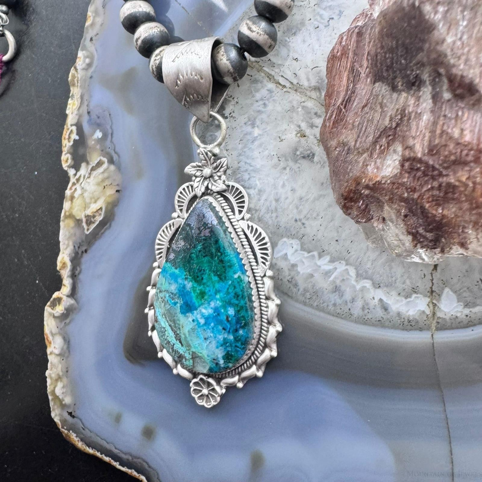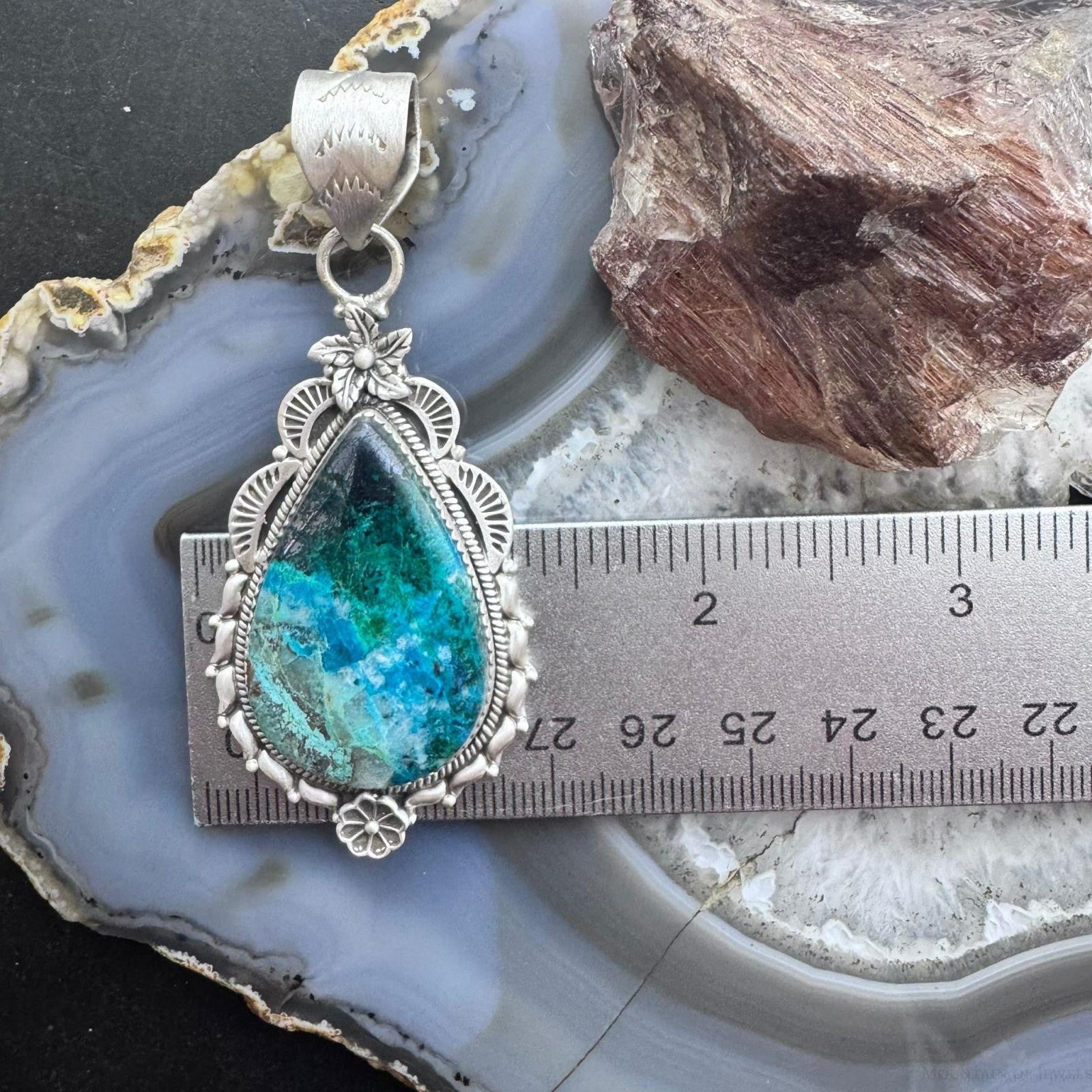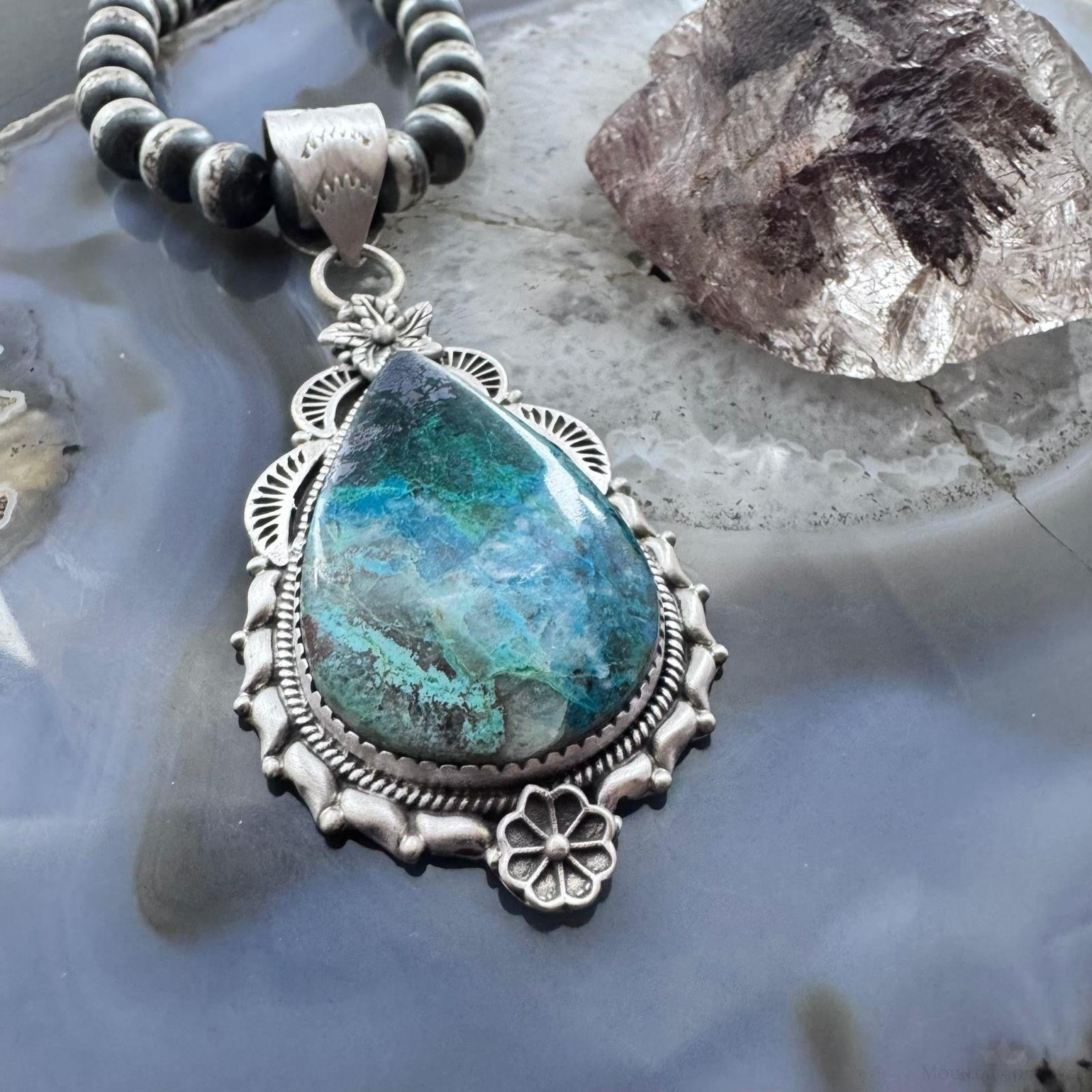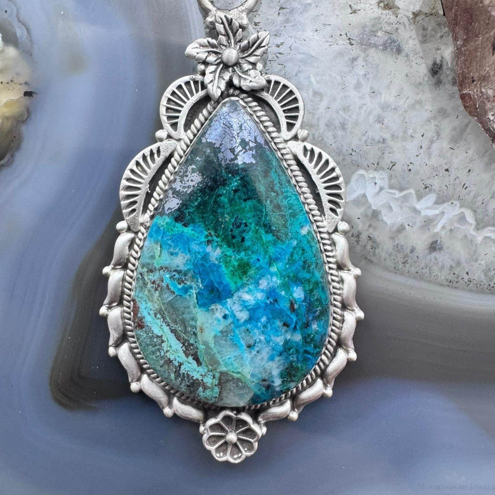 Sterling Silver Southwestern Style Elongated Teardrop Shattuckite Flower Feather Decorated Pendant For Women.