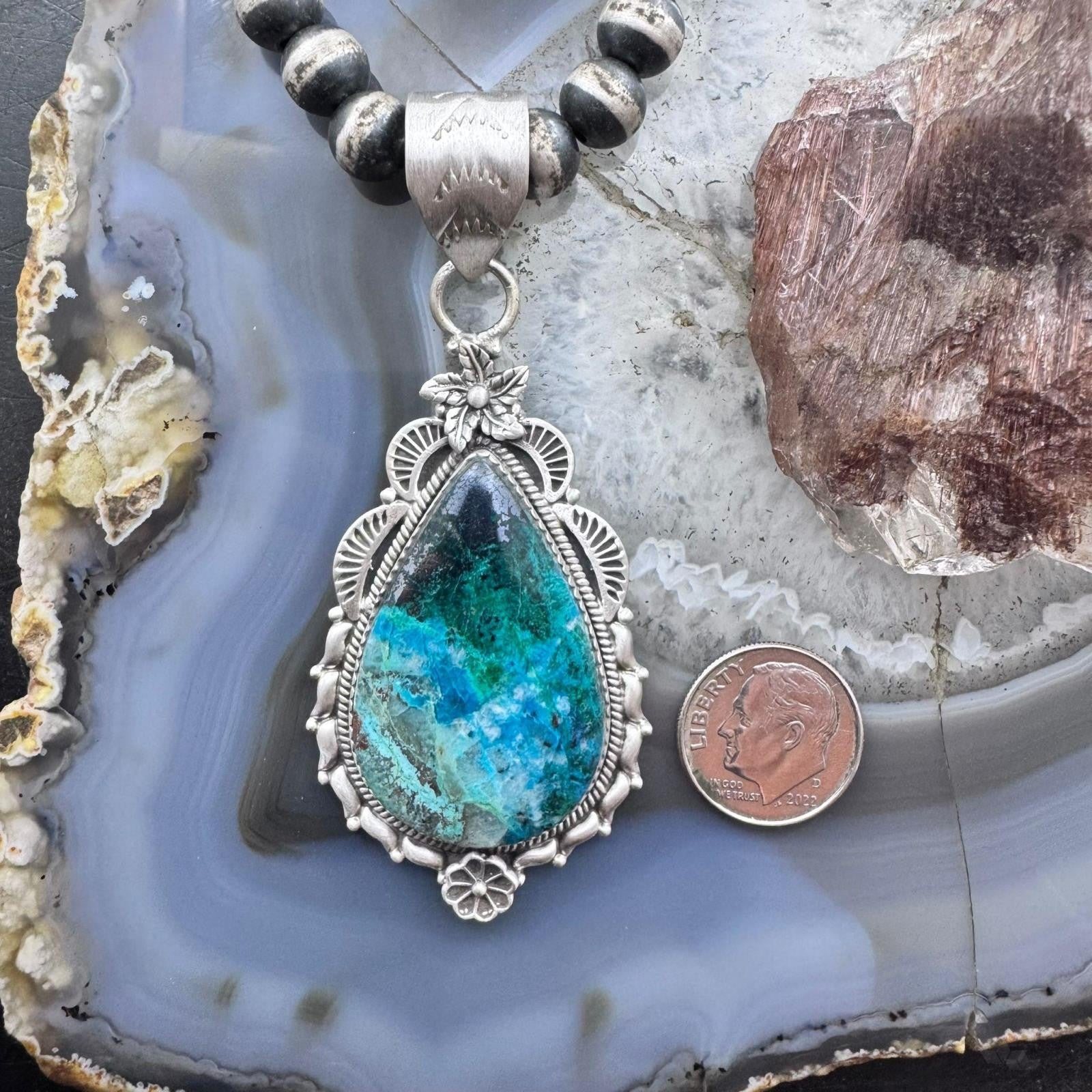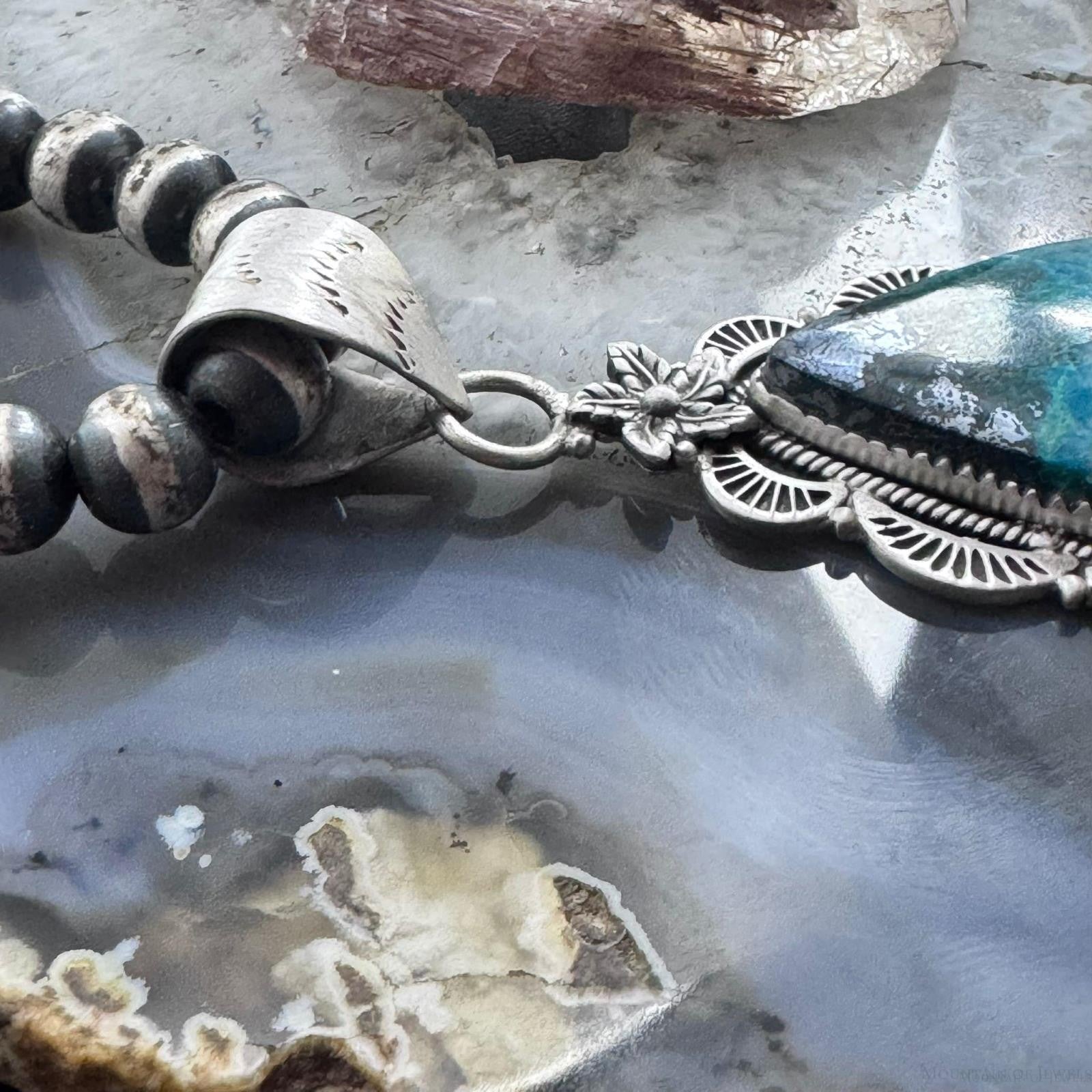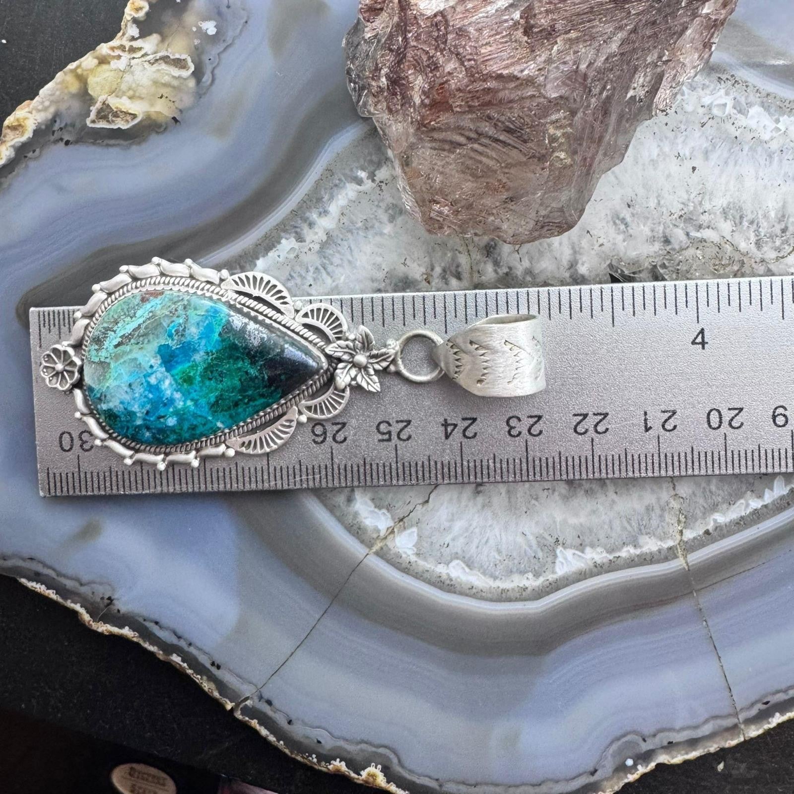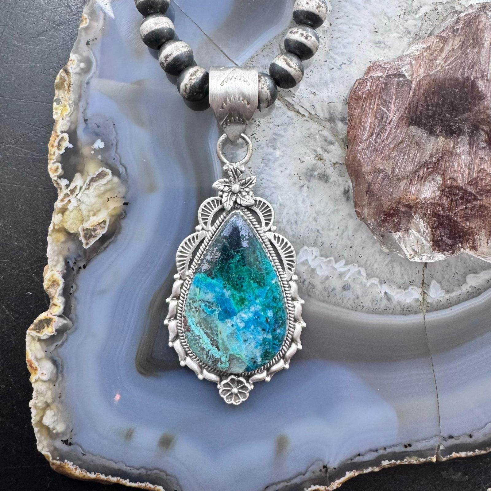 Sterling Silver Southwestern Style Elongated Teardrop Shattuckite Flower Feather Decorated Pendant For Women.
