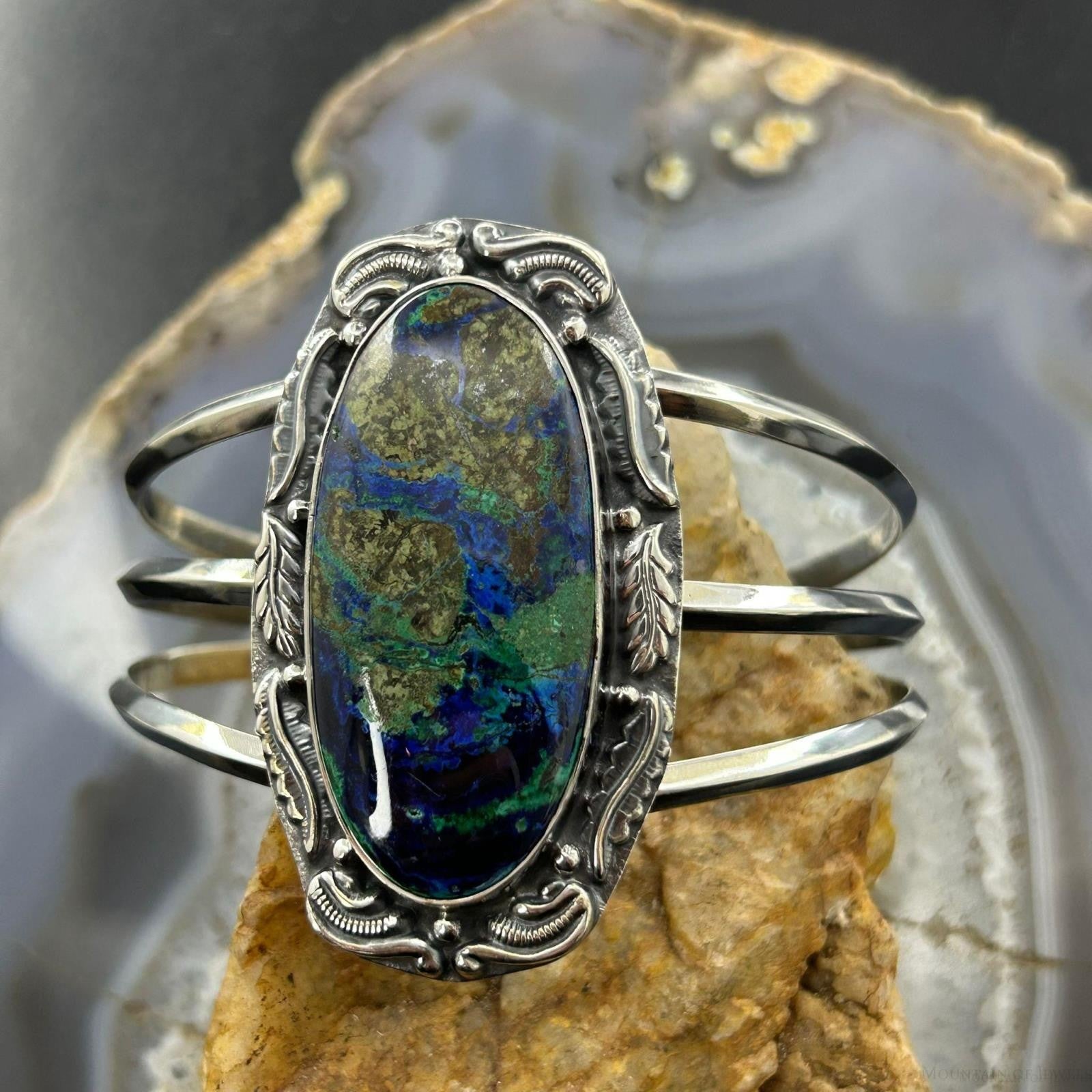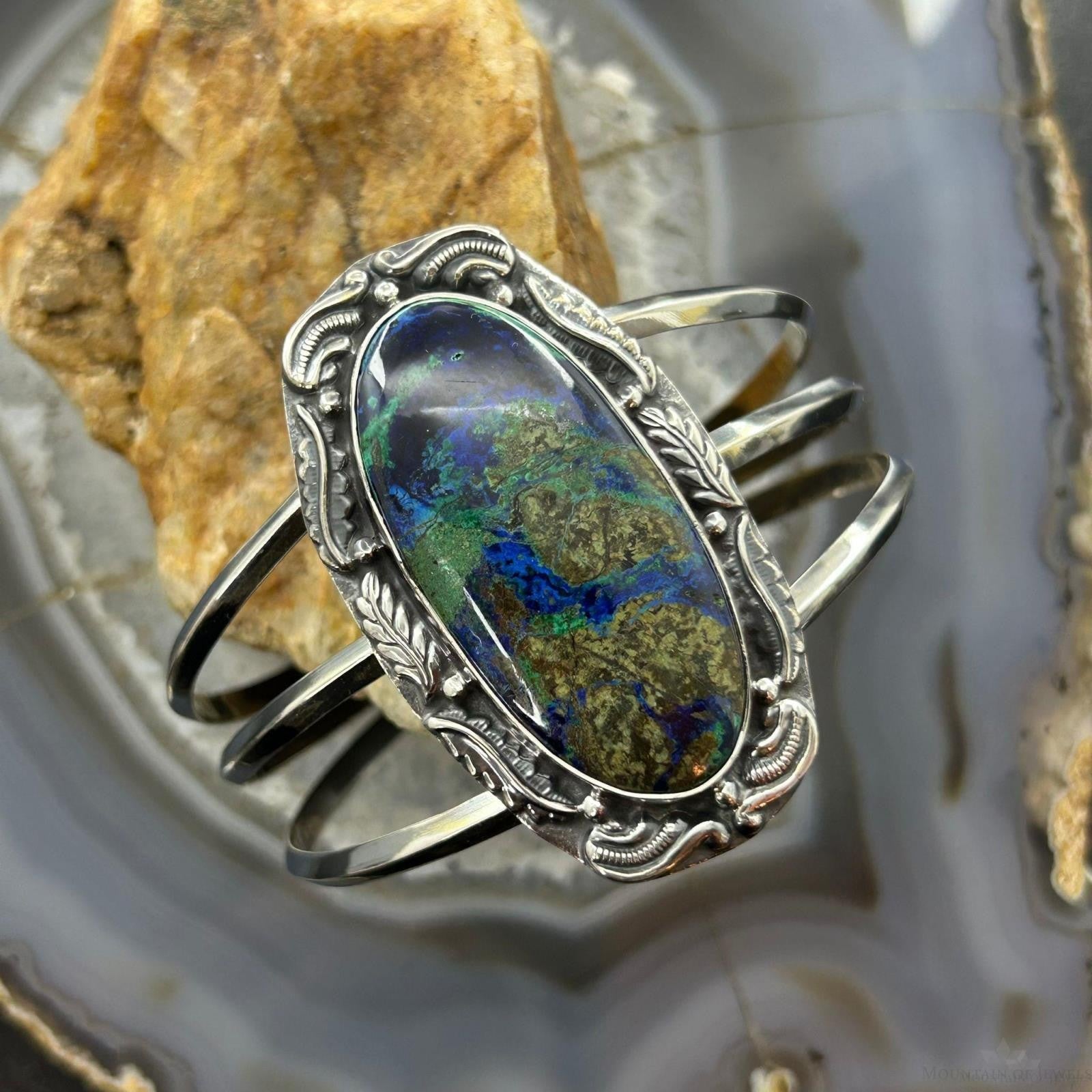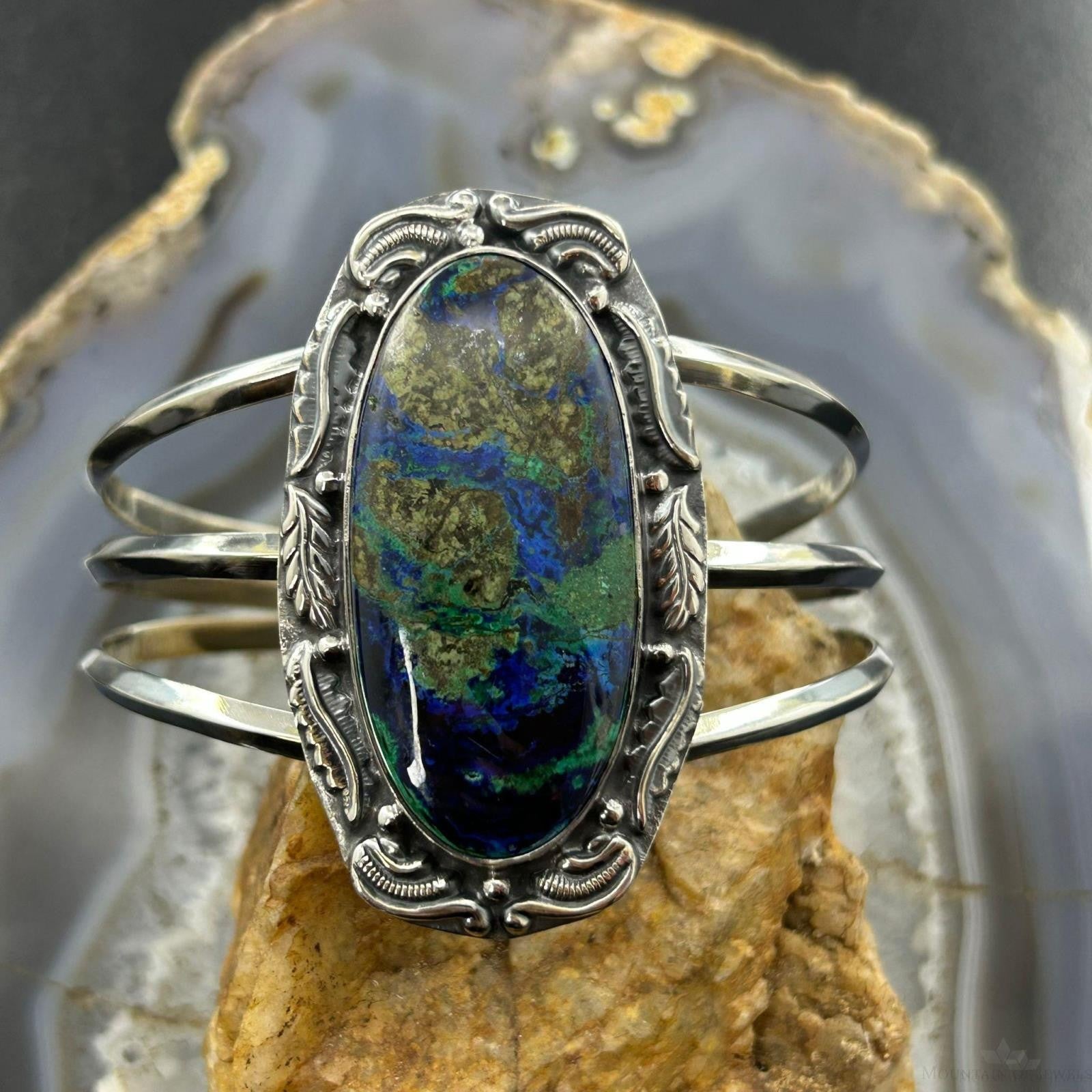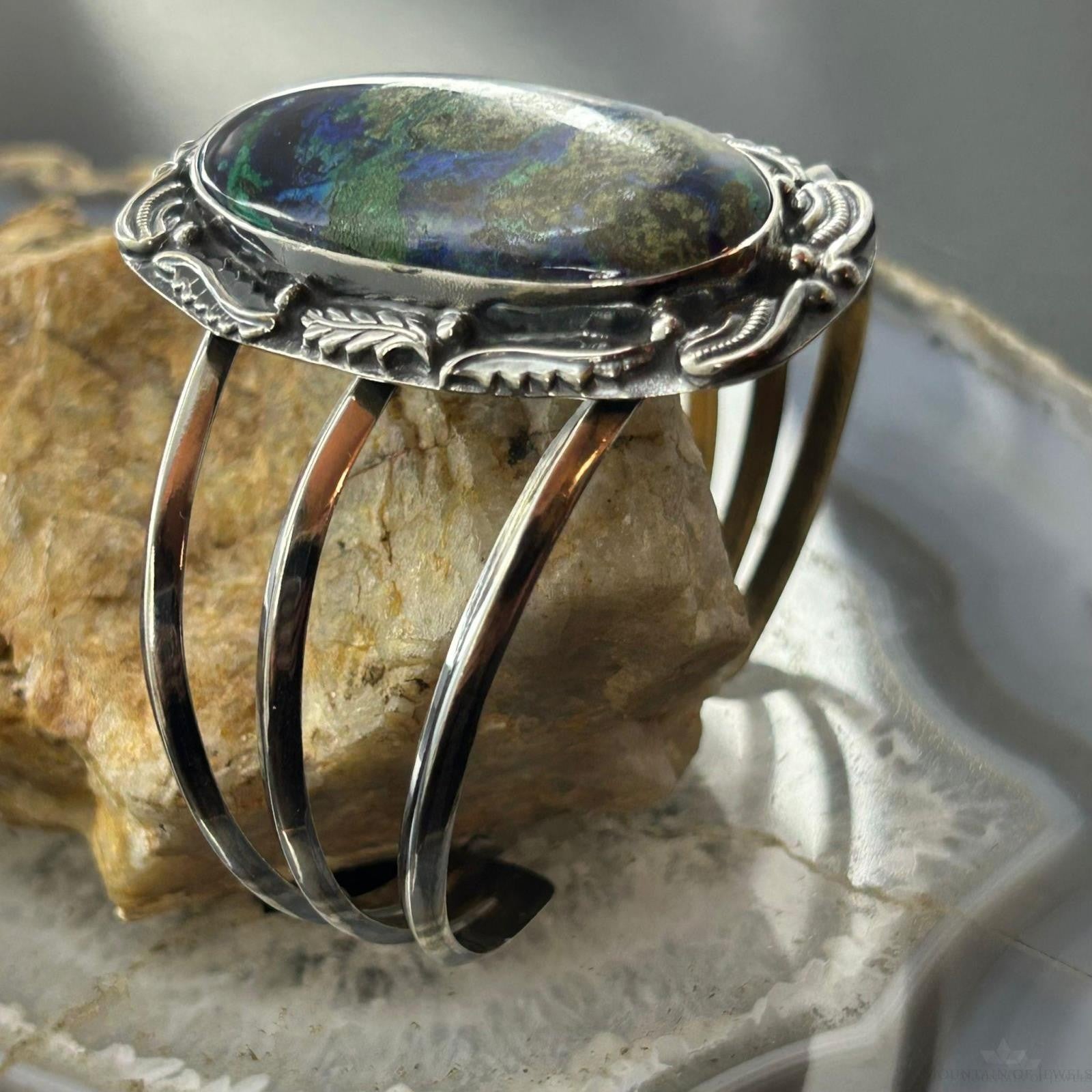 Sterling Silver Southwestern Style Large Oval Azurite Malachite Bracelet For Women