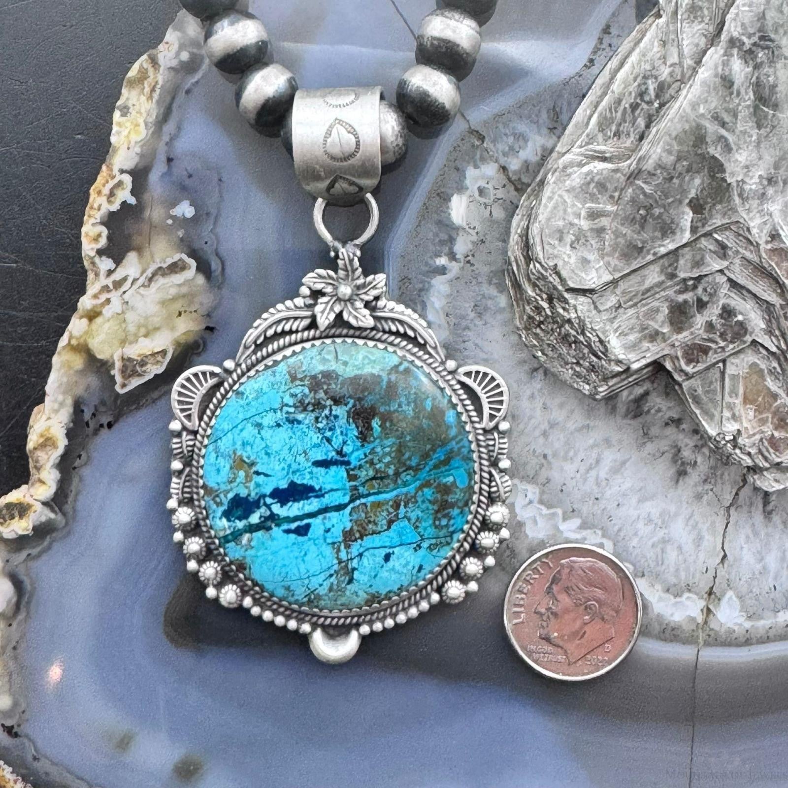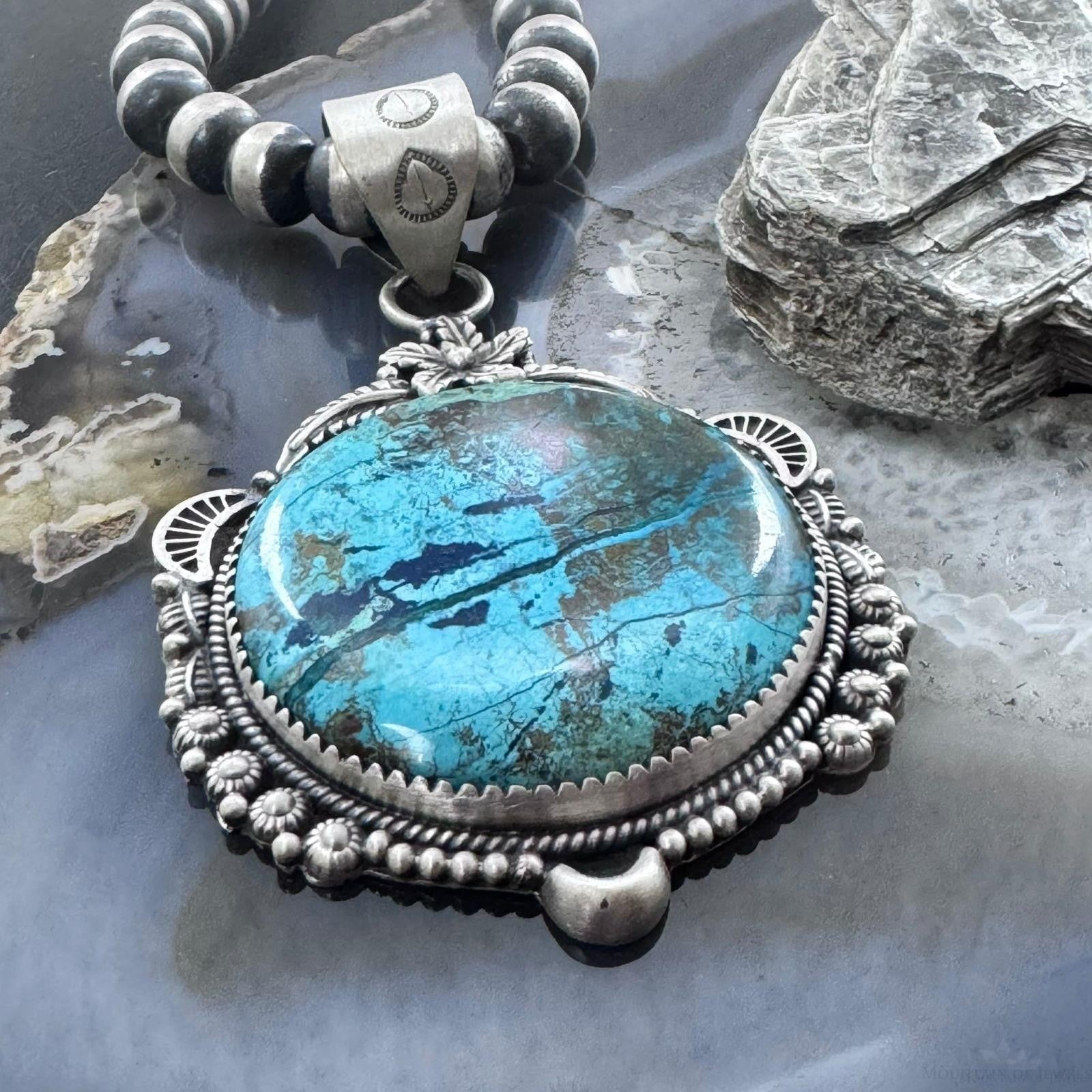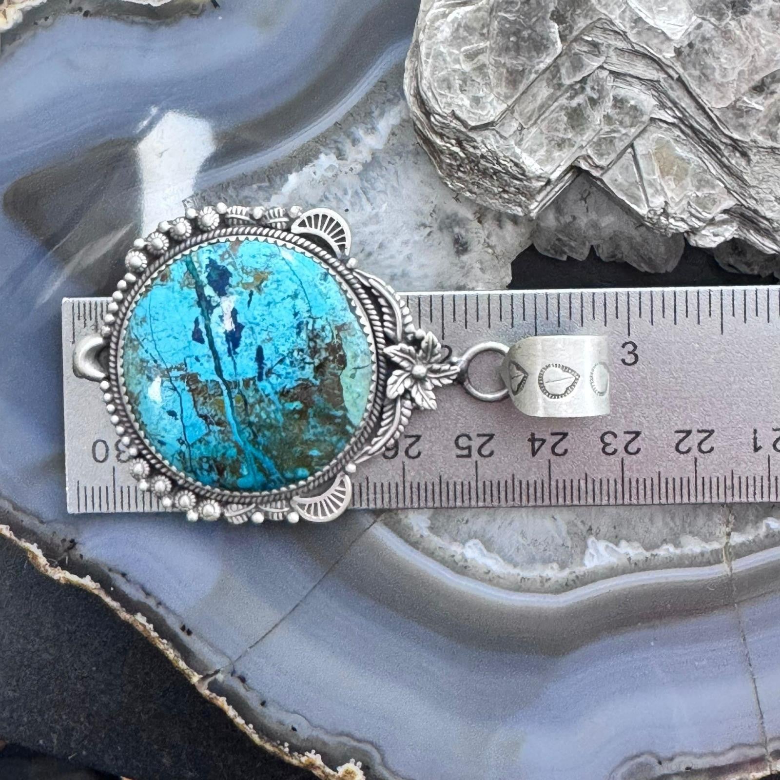 Sterling Silver Southwestern Style Large Round Chrysocolla Decorated Pendant For Women