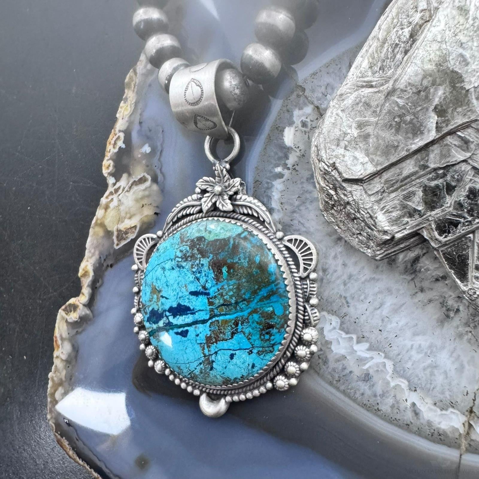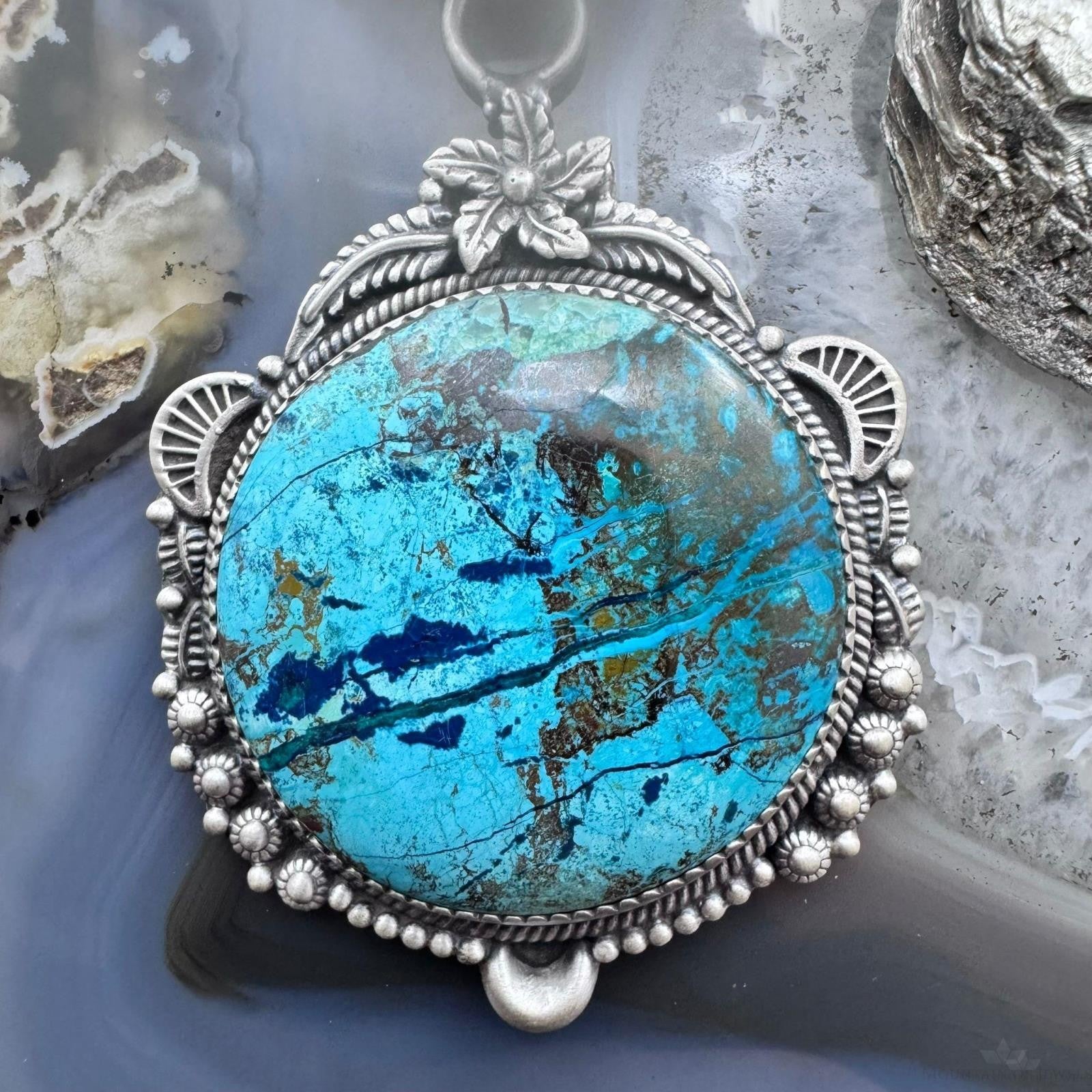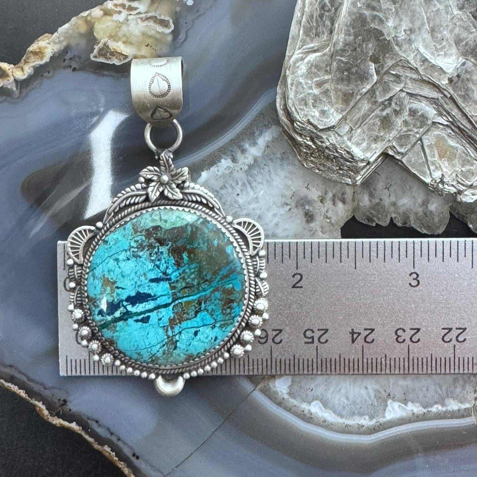 Sterling Silver Southwestern Style Large Round Chrysocolla Decorated Pendant For Women