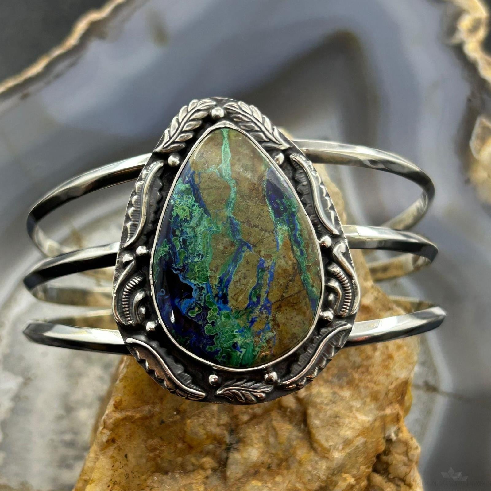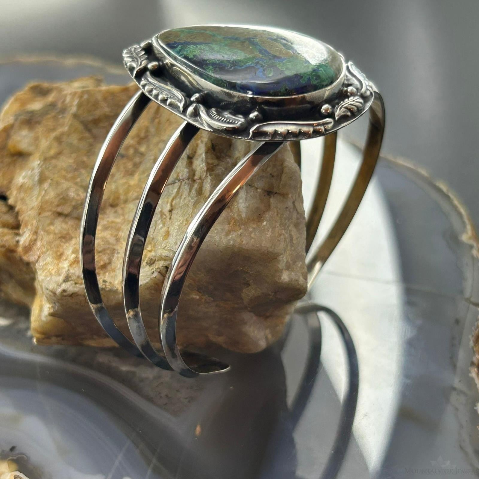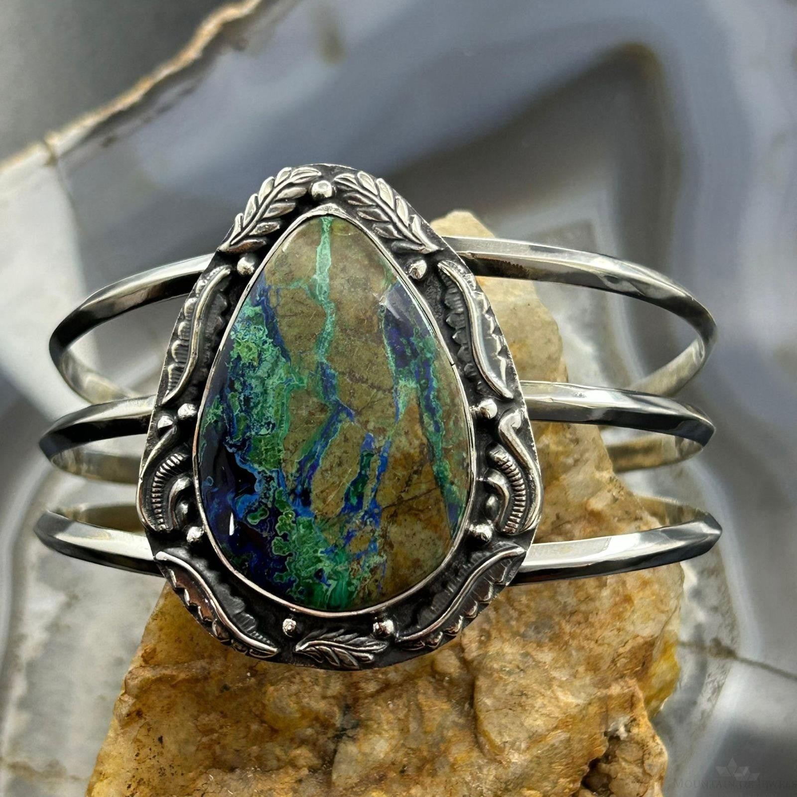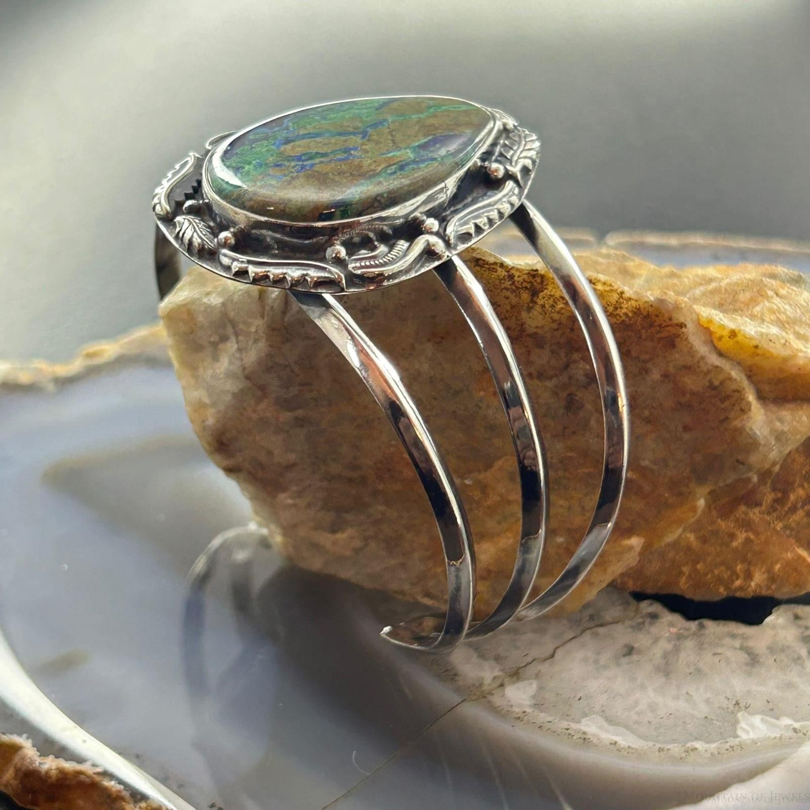 Sterling Silver Southwestern Style Large Teardrop Azurite Malachite Bracelet For Women