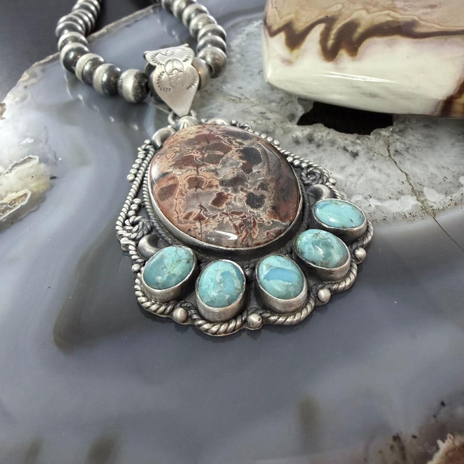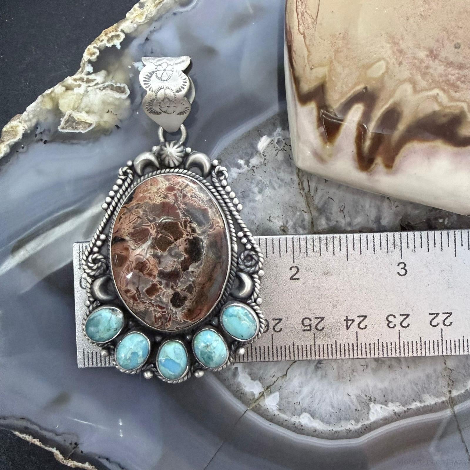 Sterling Silver Southwestern Style Oval Red Creek & Mohave Turquoise Pendant For Women