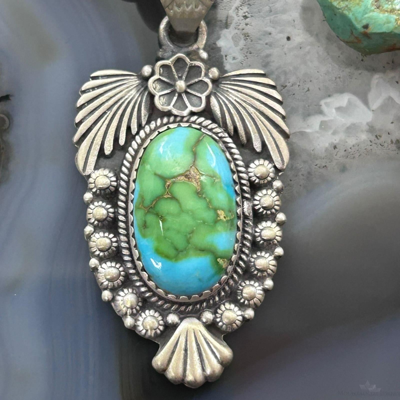 Sterling Southwestern Style Oval Sonora Gold Turquoise Leaves Decorated Pendant