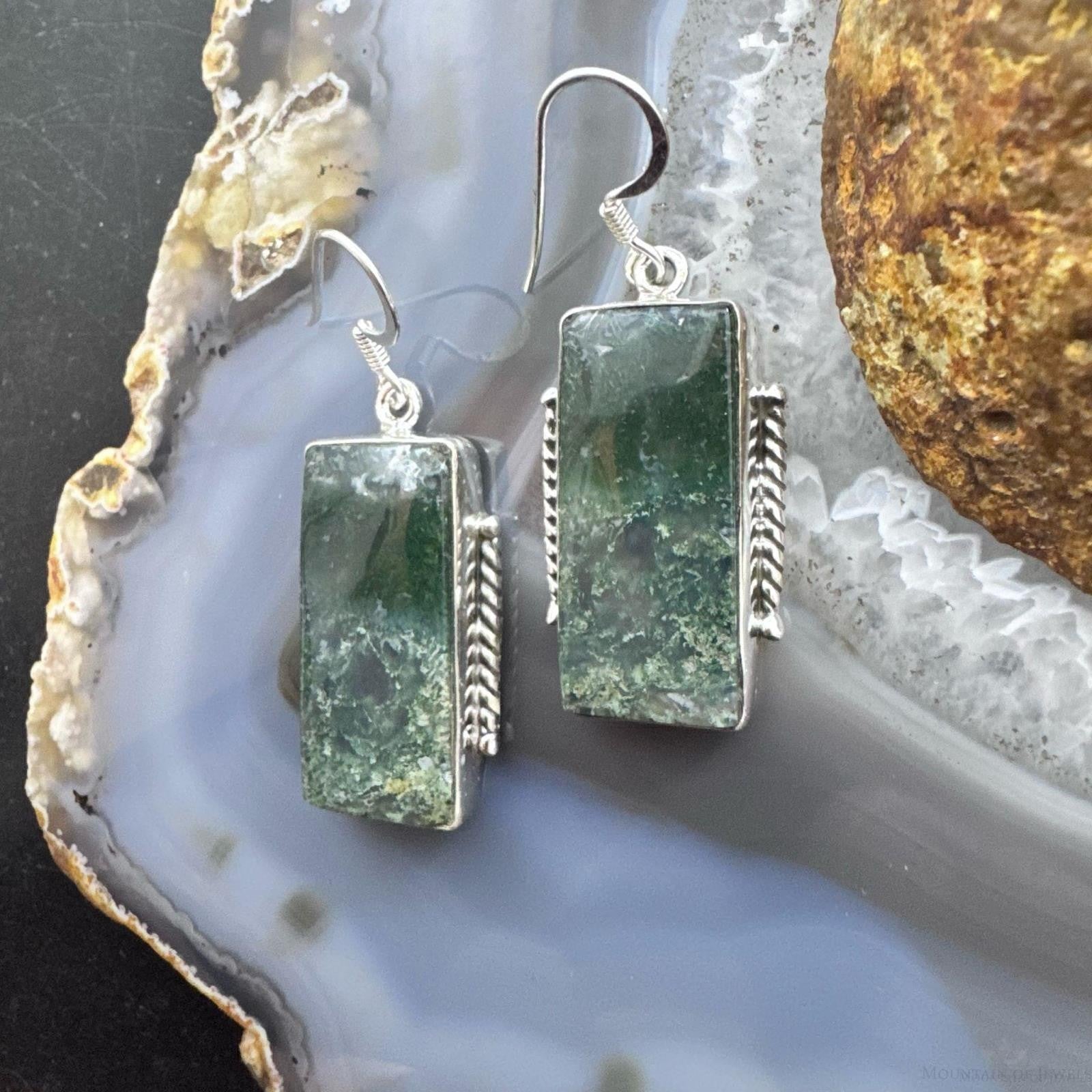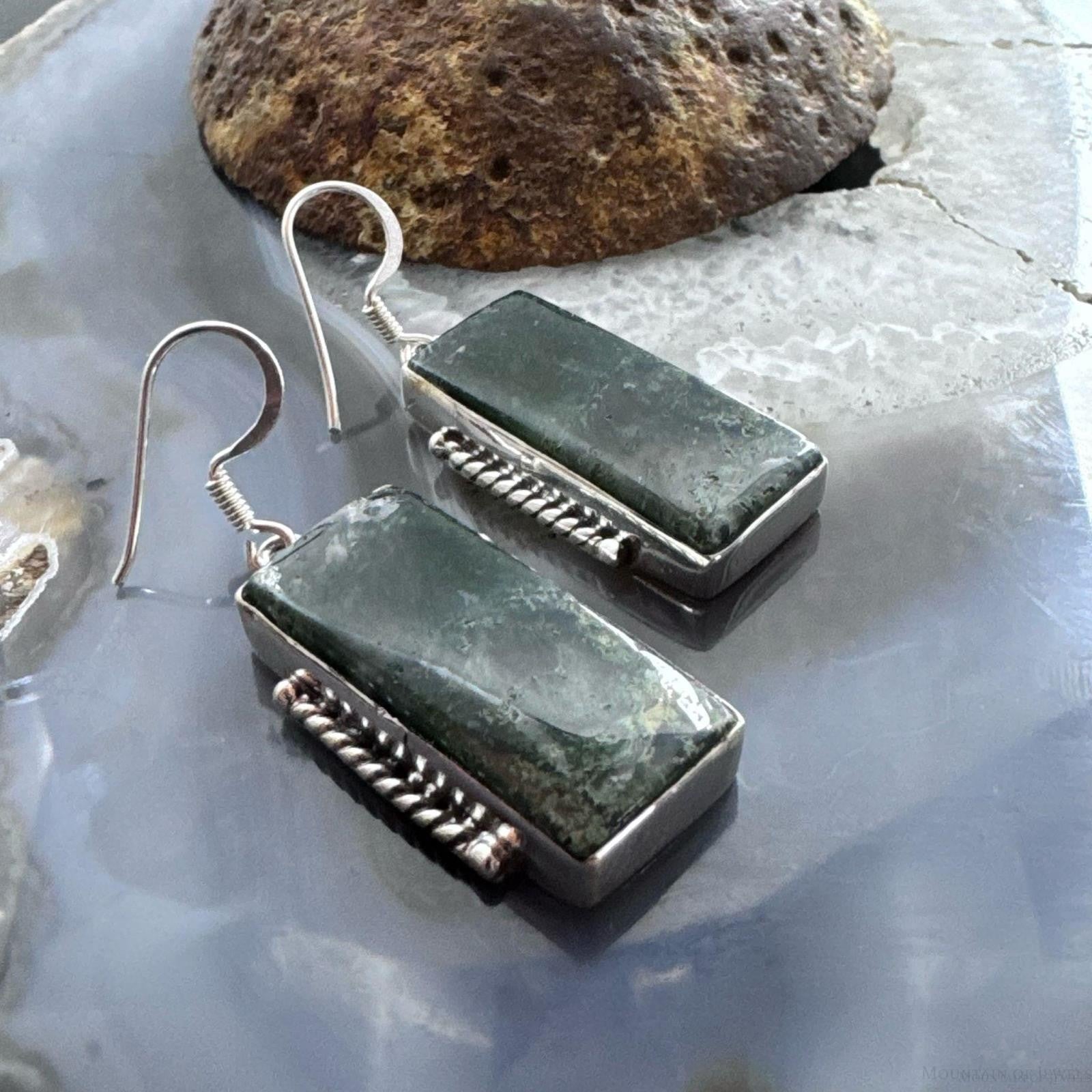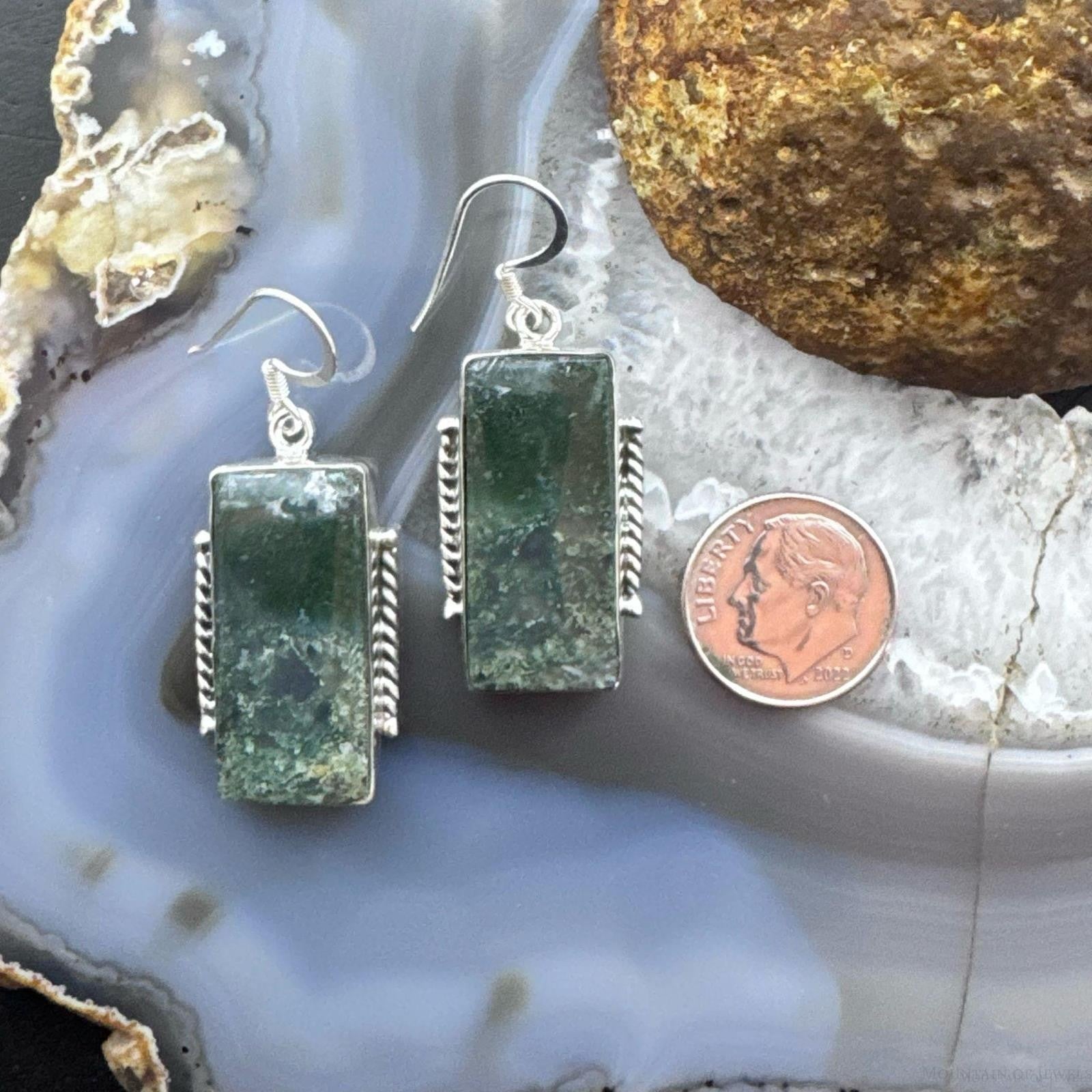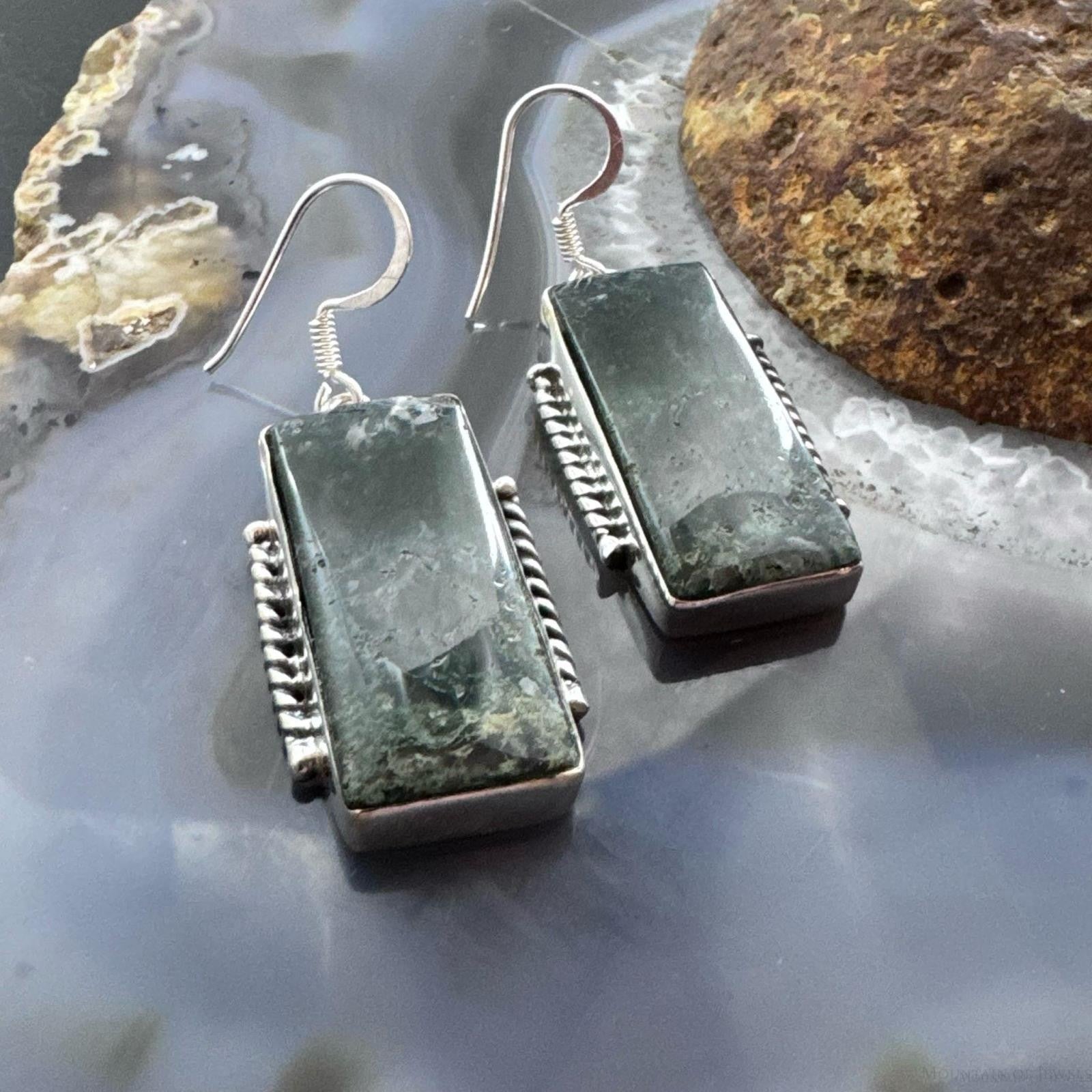 Sterling Silver Southwestern Style Rectangle Moss Agate Dangle Earrings For Women