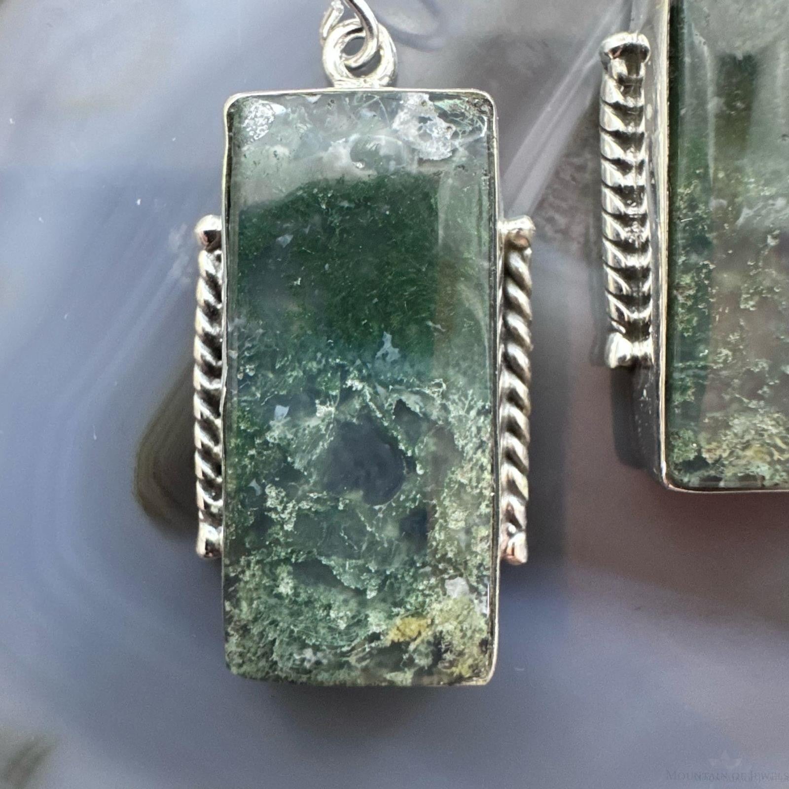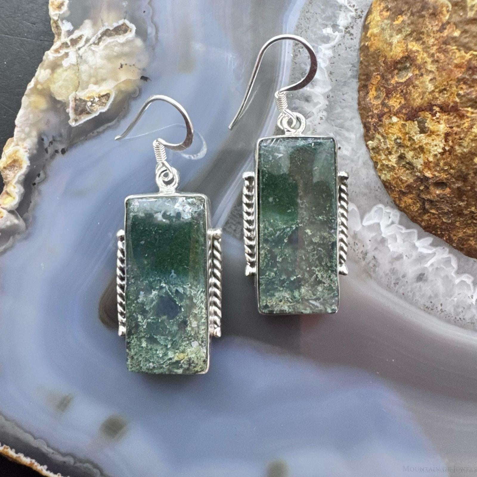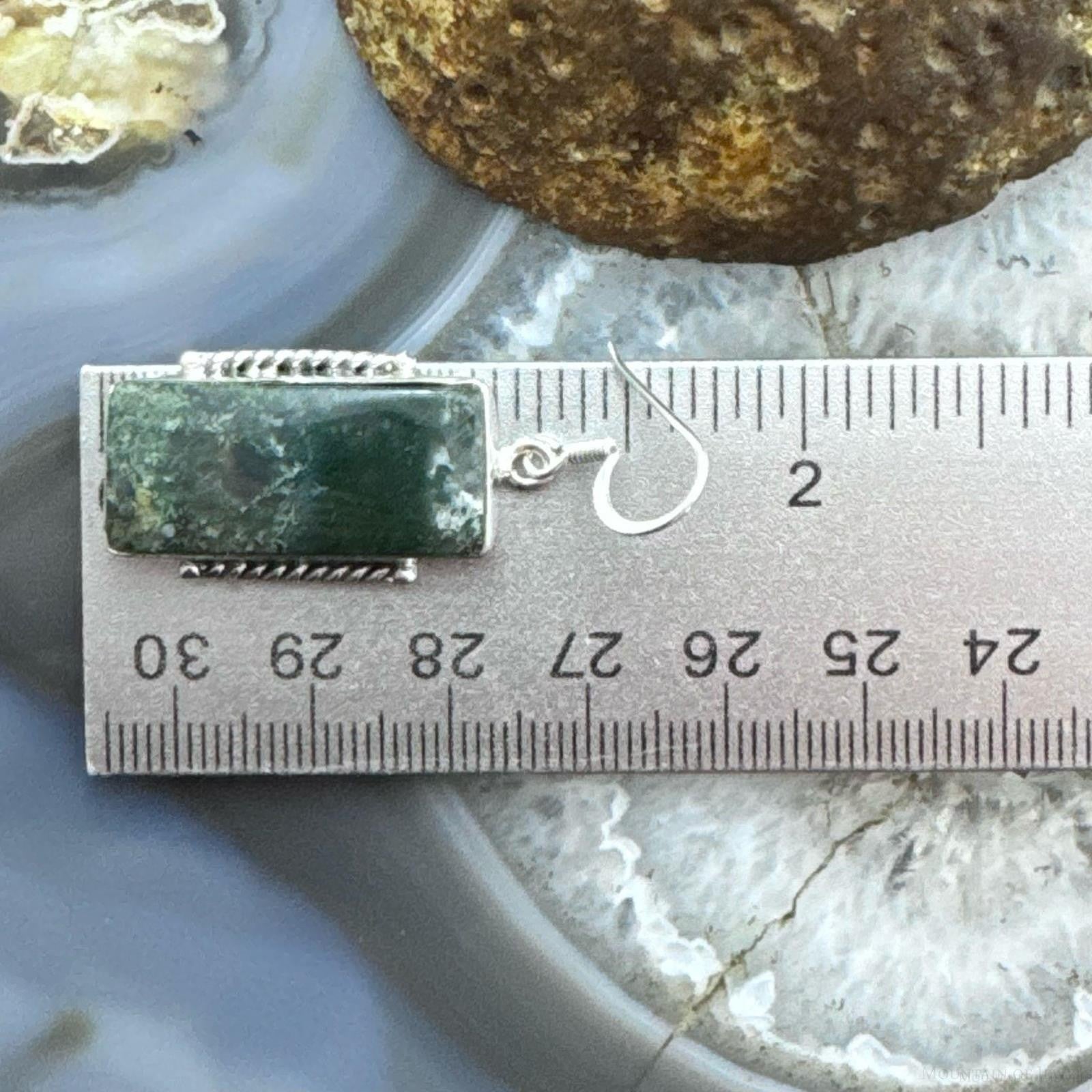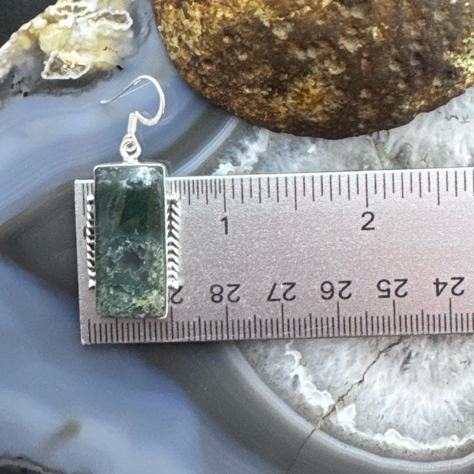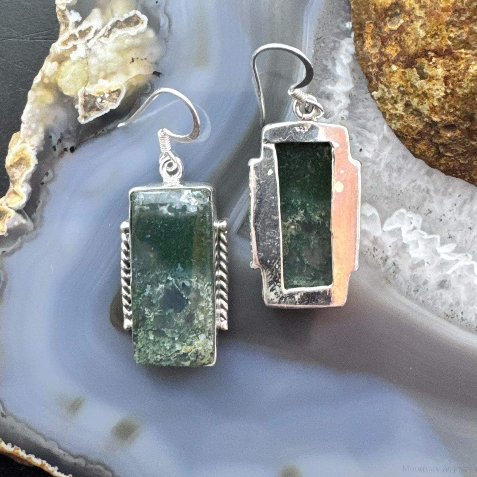Sterling Silver Southwestern Style Rectangle Moss Agate Dangle Earrings For Women