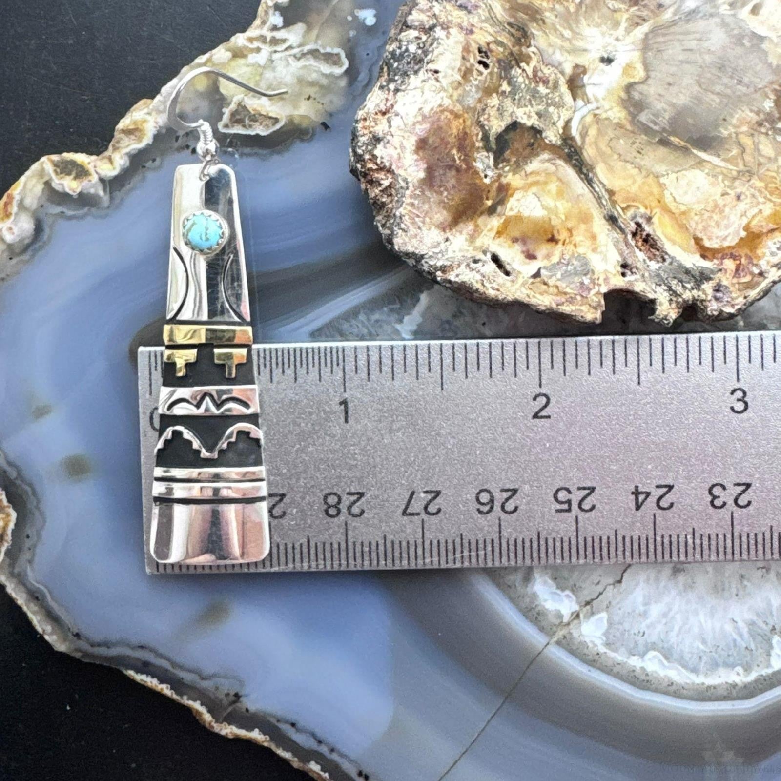 Sterling Silver and Gold Filled Southwestern Motif and Round Turquoise Decorated Elongated Dangle Earrings For Women, Signed by Native American Artists Tommy and Rosita Singer.
