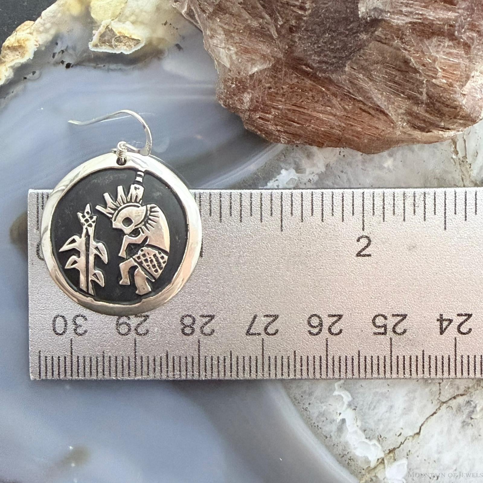 Sterling Silver Overlay Kokopelli and Corn Dangle Earrings For Women, Signed by Native American Artists Tommy and Rosita Singer.