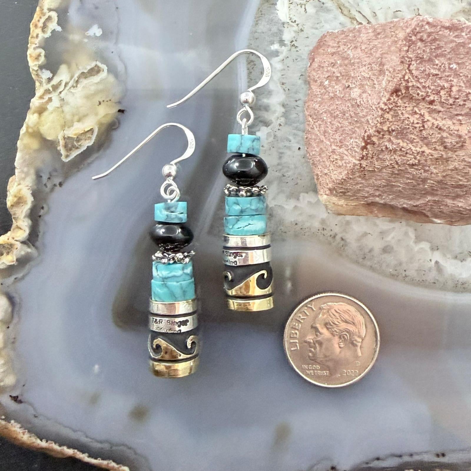 Sterling Silver and Gold Filled Barrel Bead, Turquoise Onyx Beads Dangle Earrings For Women, Signed by Native American Artists Tommy and Rosita Singer.