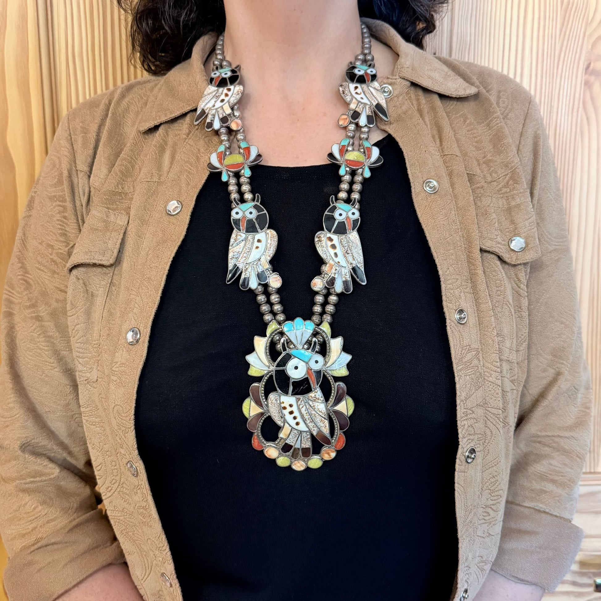 Vintage Native American Silver Bead Multistone Zuni Inlay 5 Owl Necklace