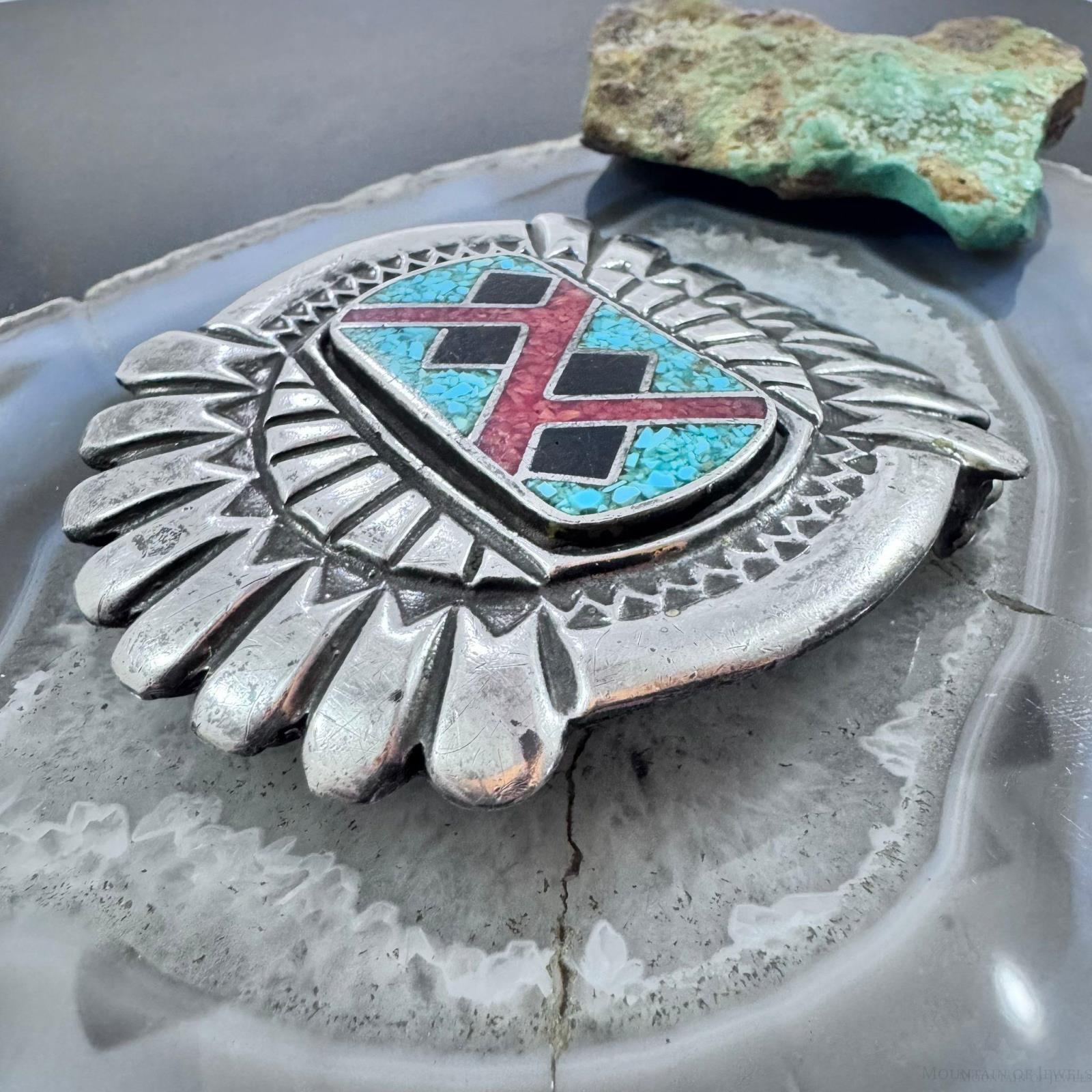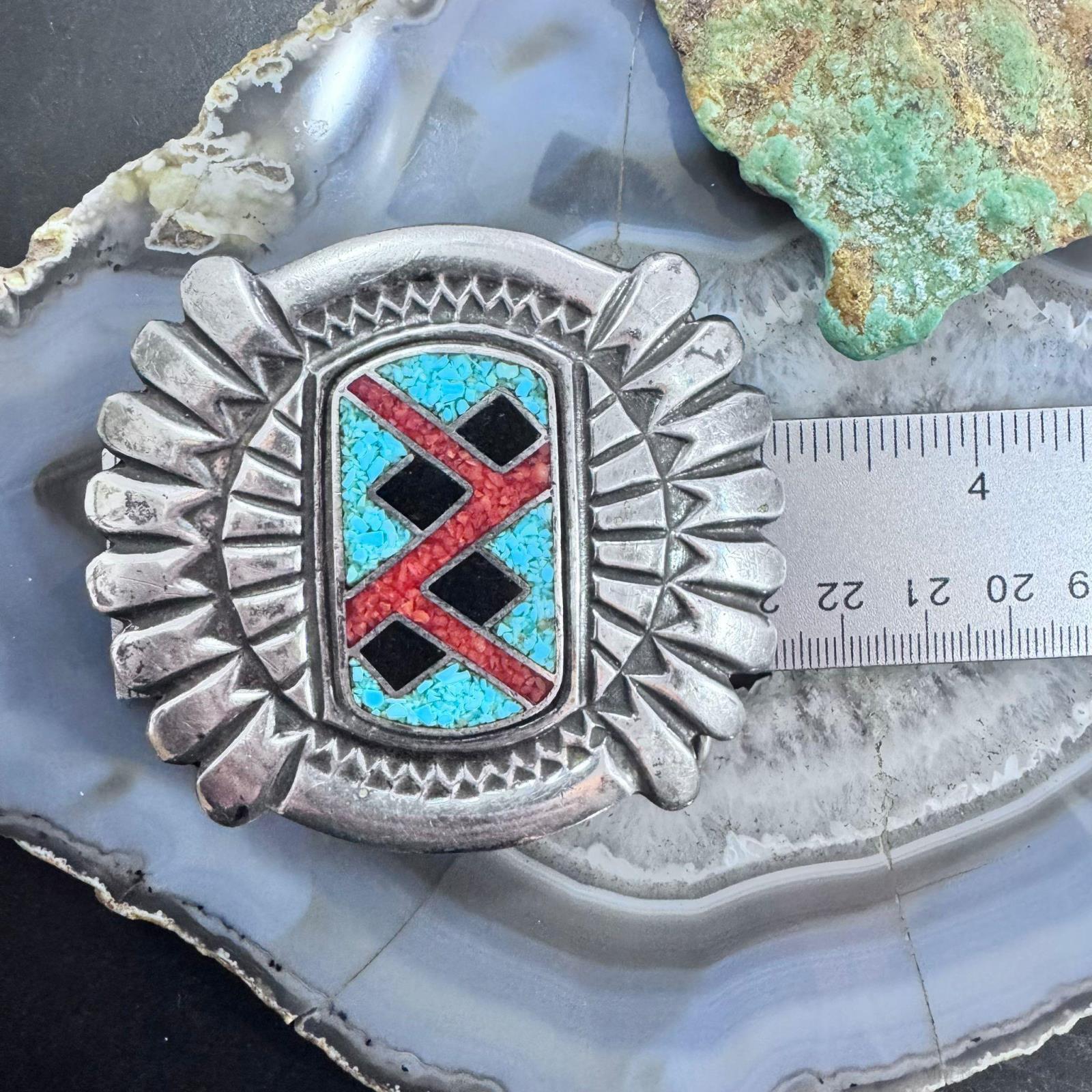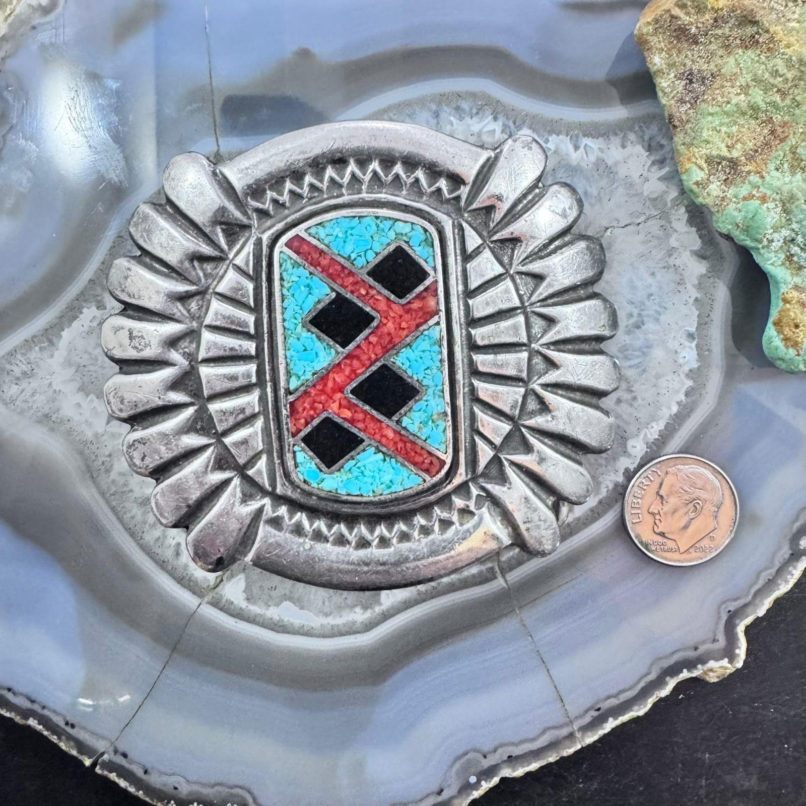 Vintage Native American Sterling Silver Chip Inlay Large Belt Buckle For Men